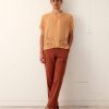 This long sleeve shirt is inspired by a 1950s tablecloth. The appliqué motif is a faithful reproduction of the original tablecloth featuring cream flowers and a wide border on a maroon ground.