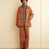 This coat is inspired by a quilted vest from the 1960s-1970s. Made from fabric with an illustrated dog motif, it features a knit collar and green accents.