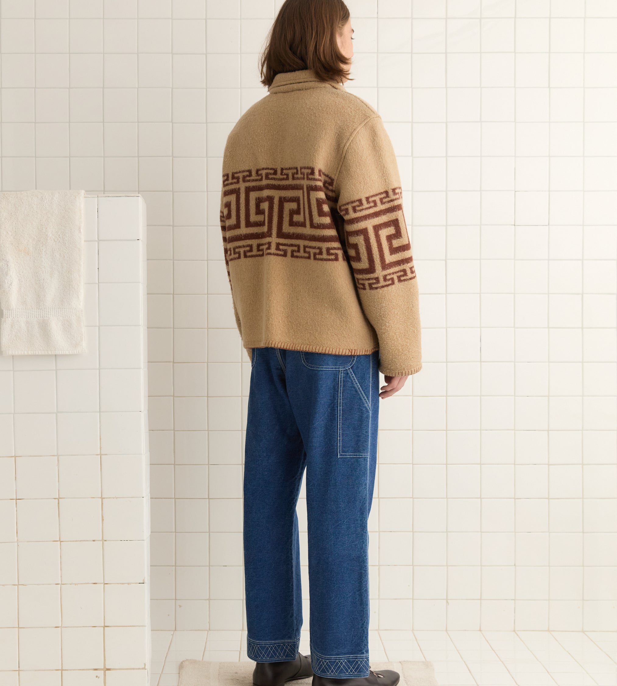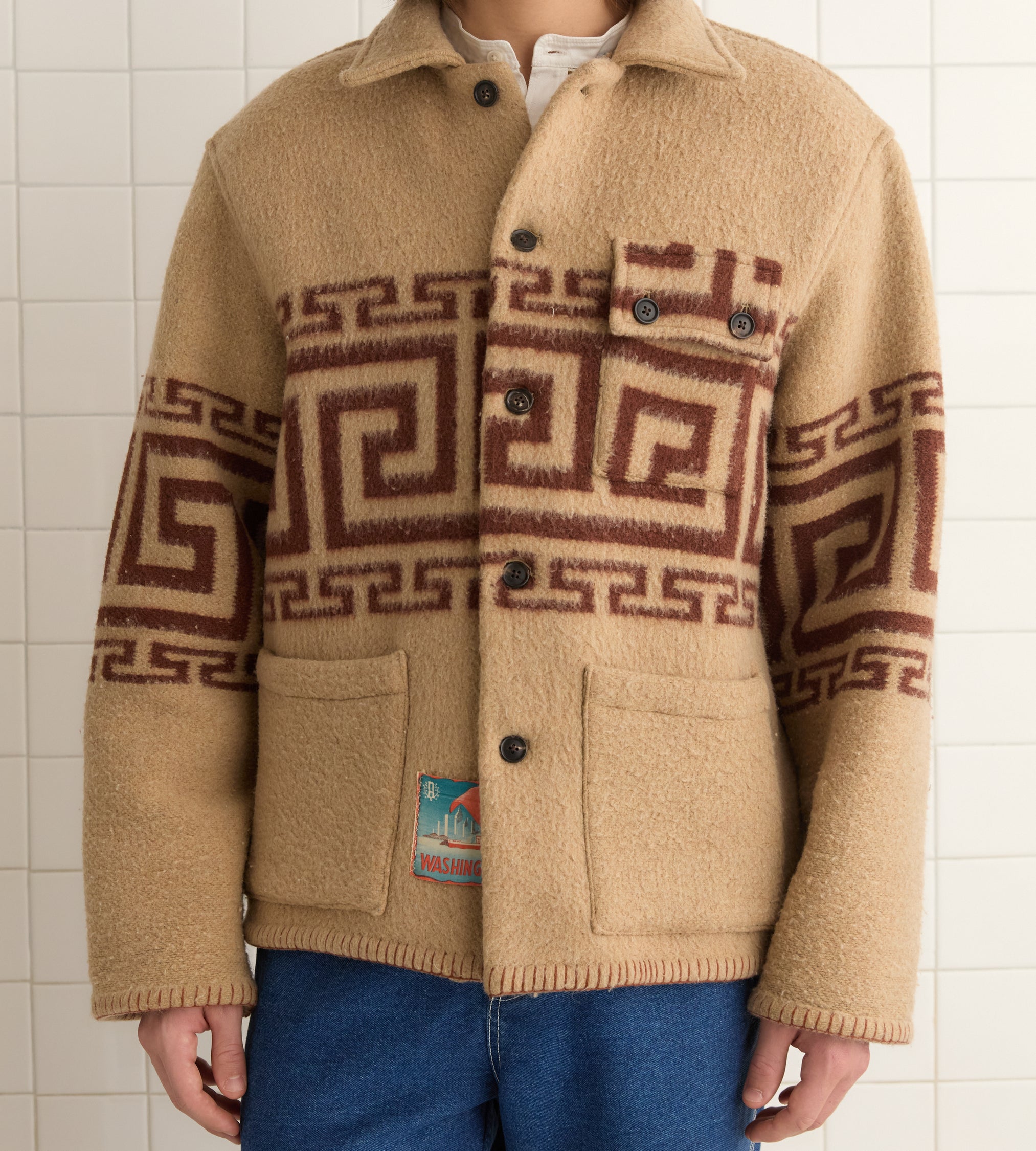 This jacket is made of a midcentury wool blanket with a Greek meander motif. Hand-mending throughout.