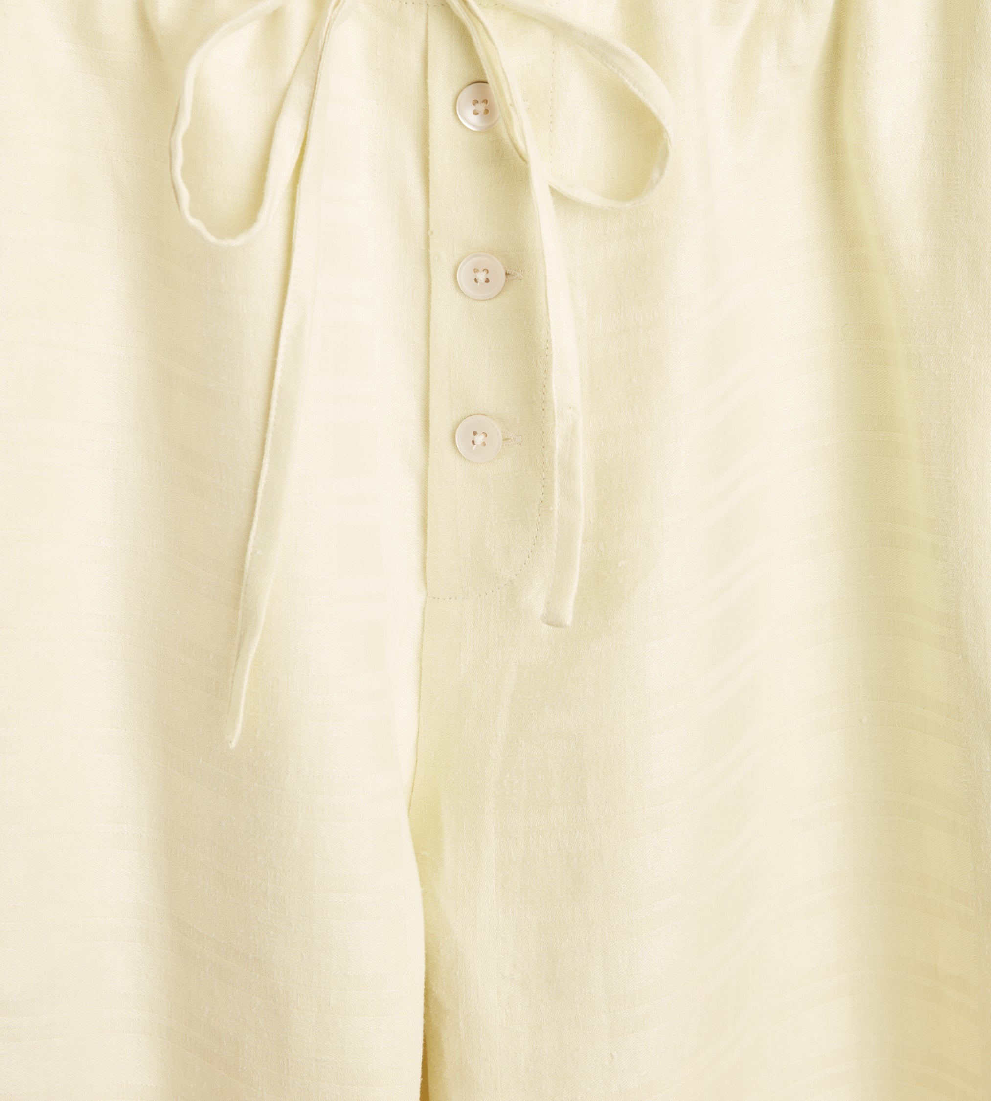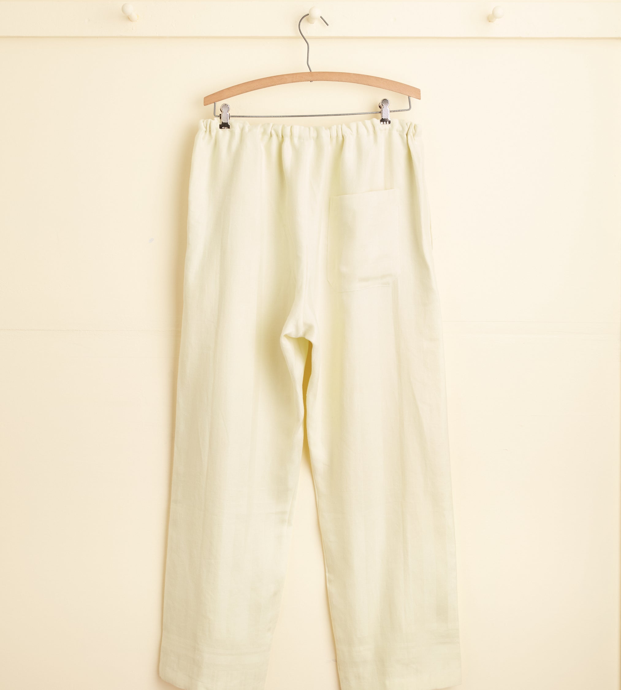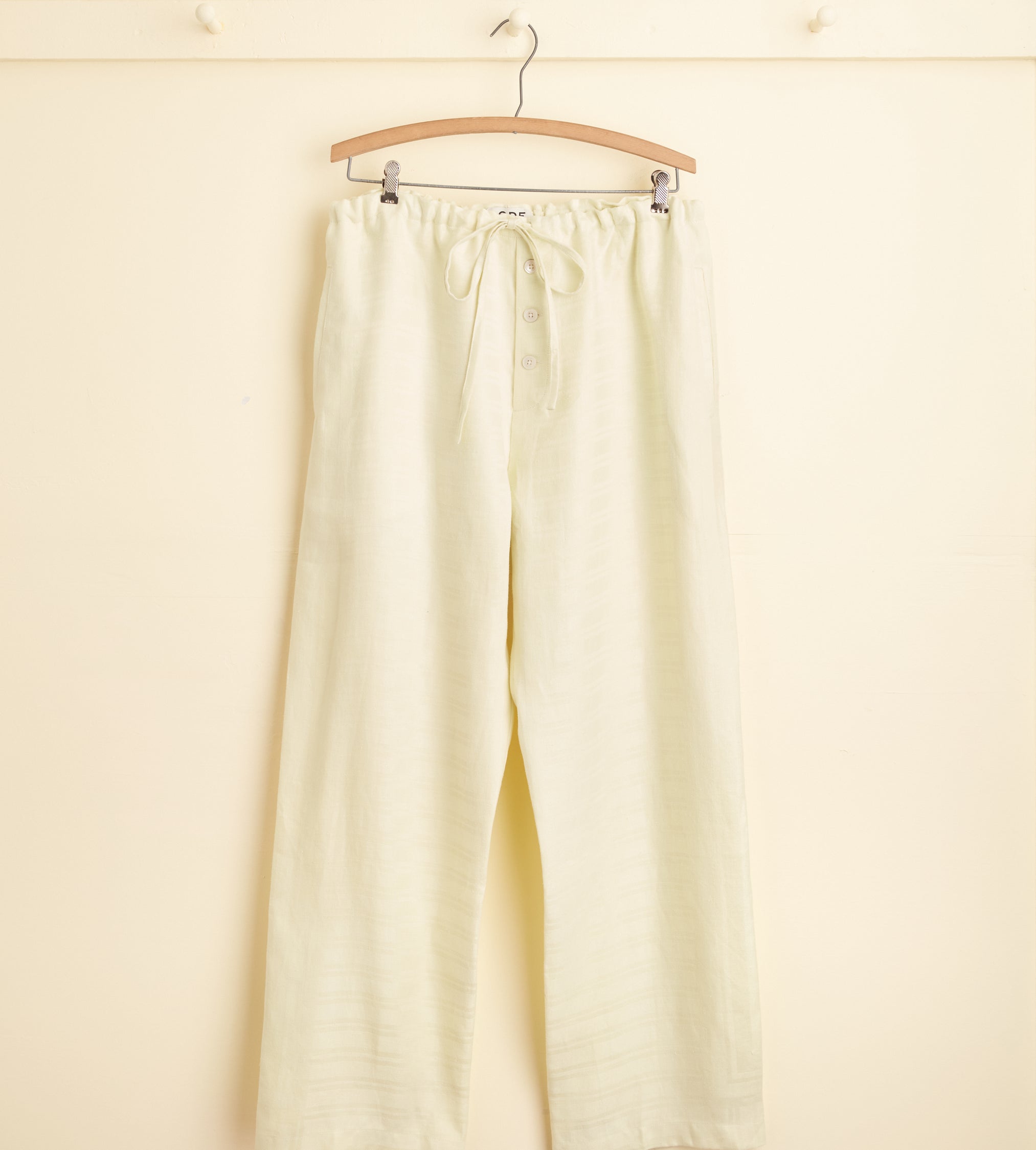 These pajama pants are made from a pale green damask tablecloth from the early 20th century. Hand-mending throughout.