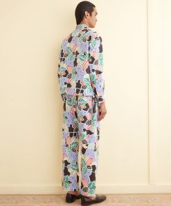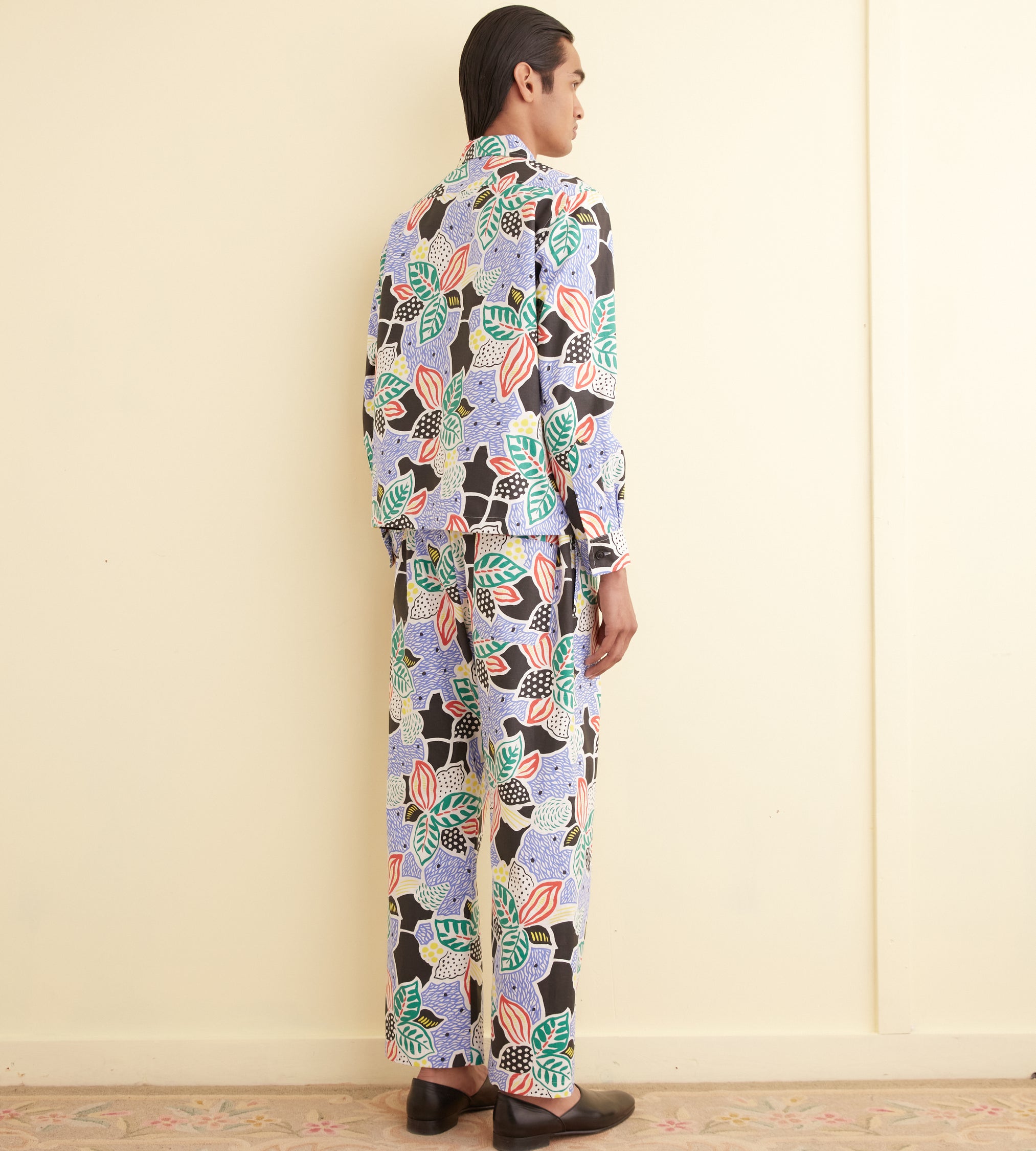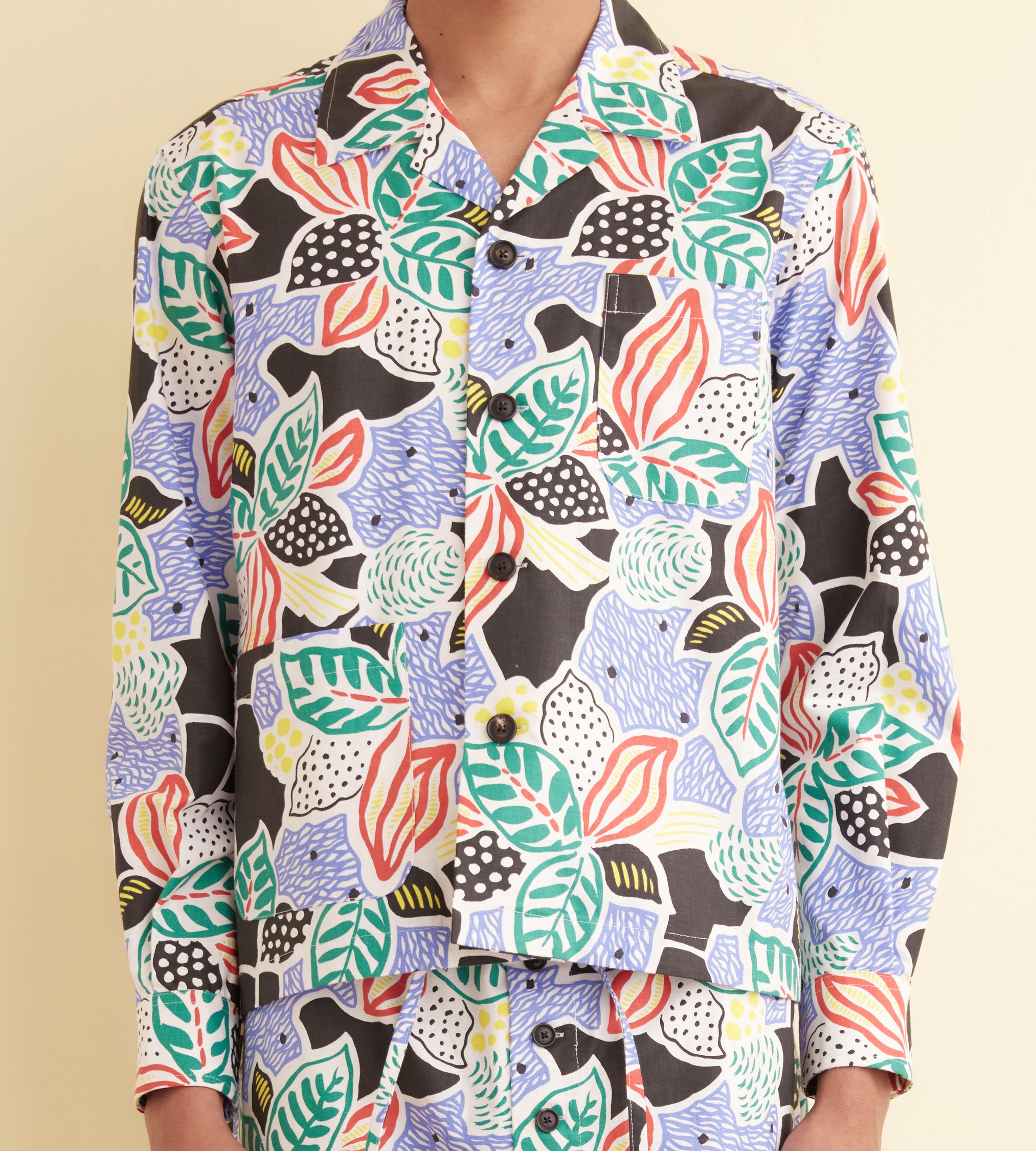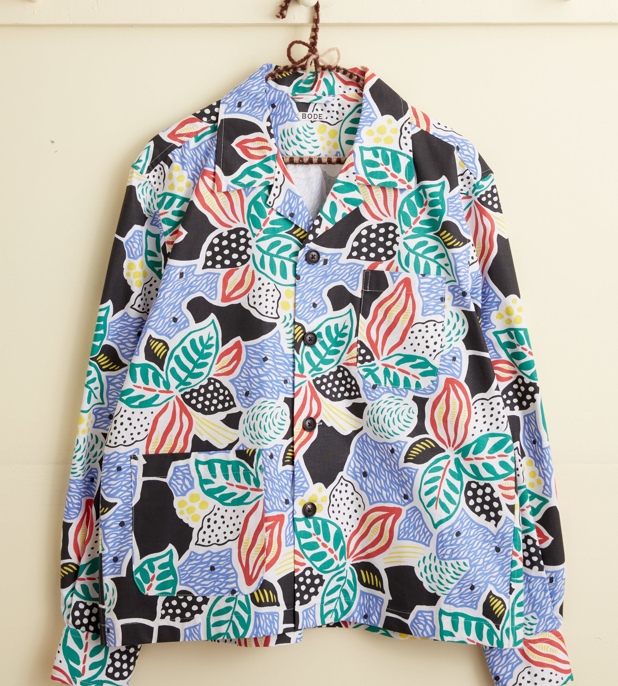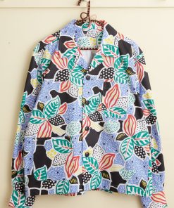 This shirt is made from midcentury French yardage. The fabric is printed with an oversized botanical pattern. Hand-mending throughout.