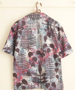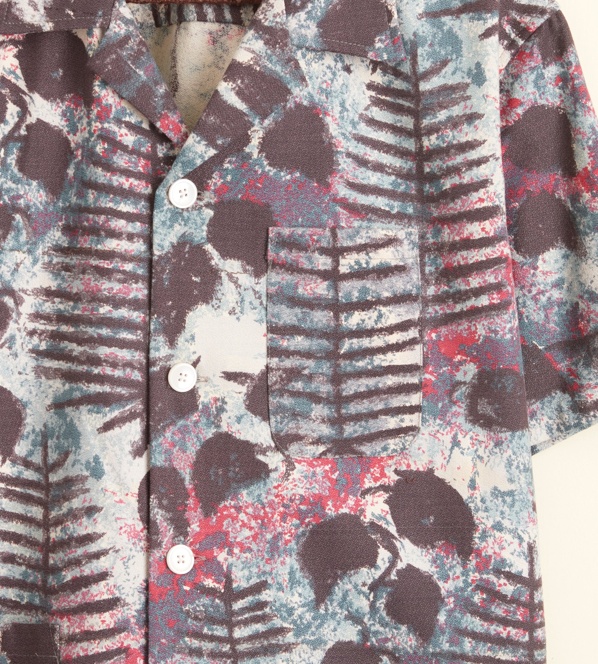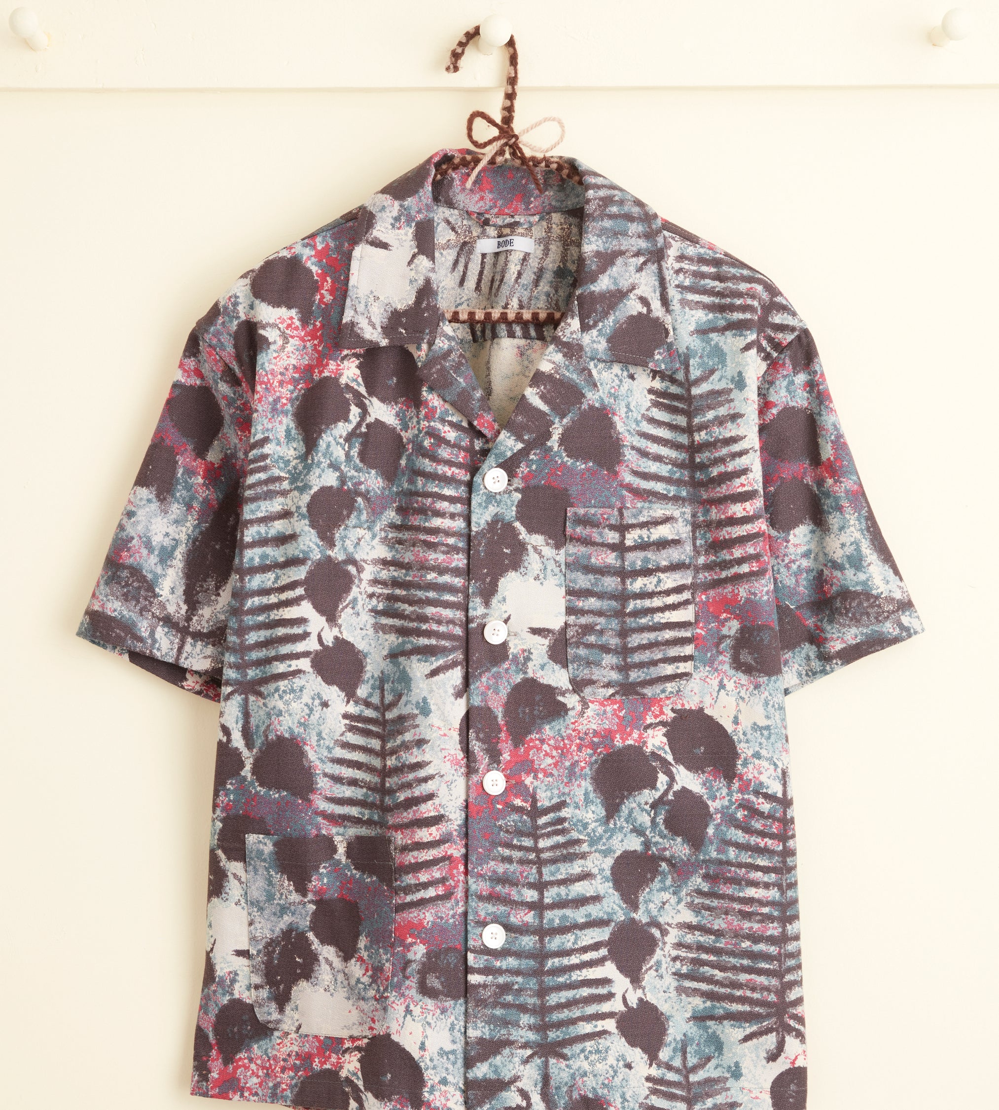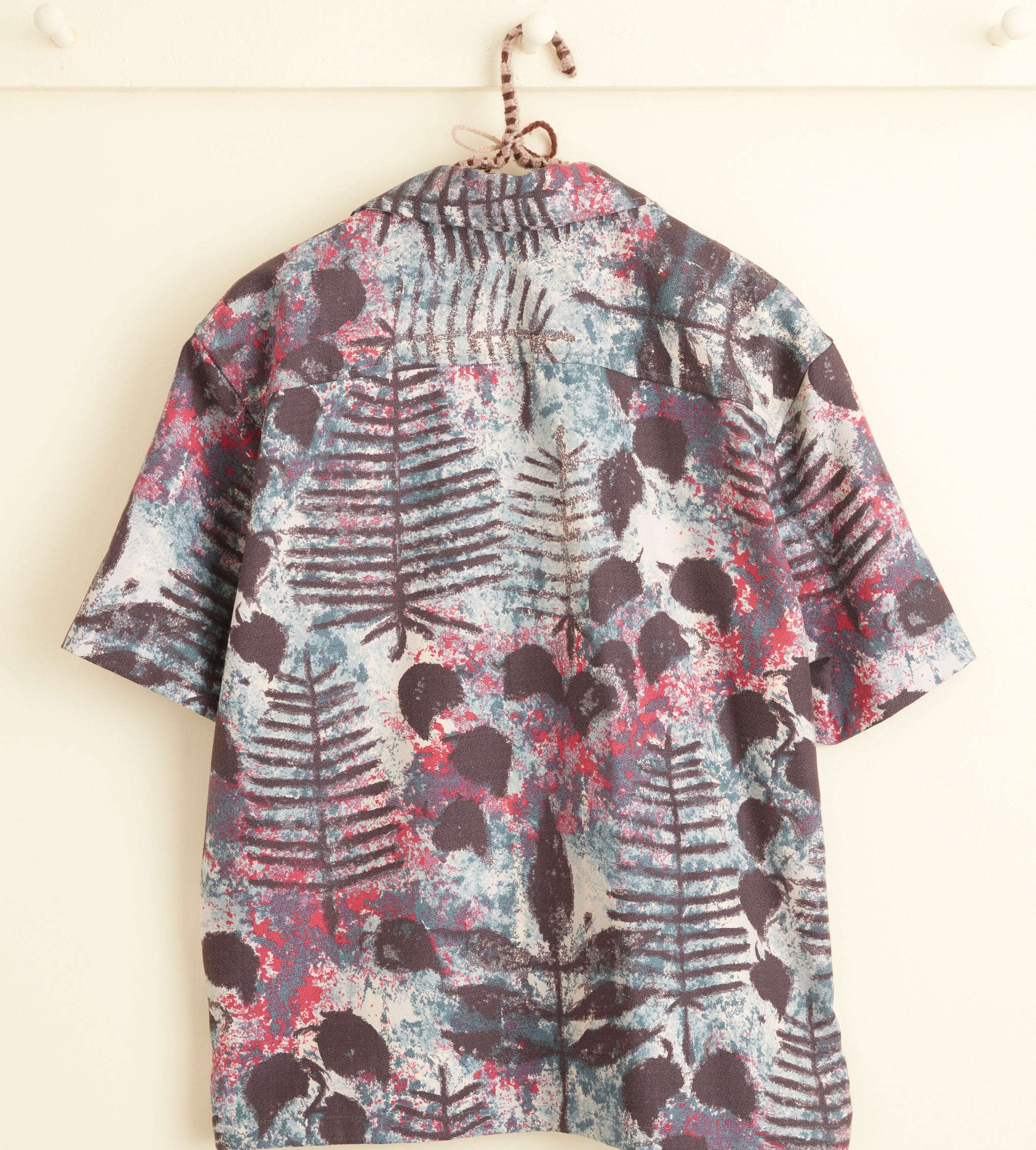 This shirt is made from deadstock yardage from the late 20th century, printed with abstracted botanical patterns. Hand-mending throughout.