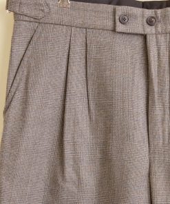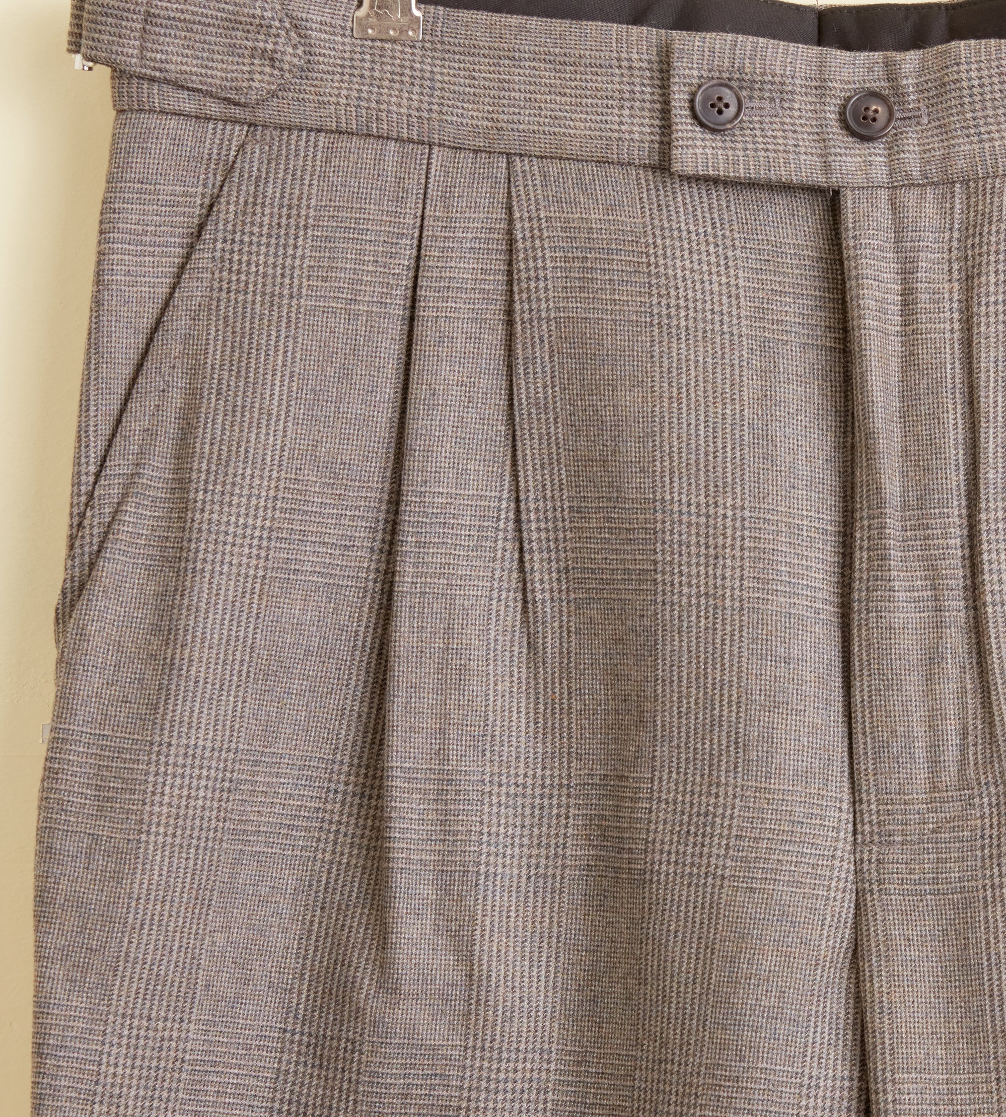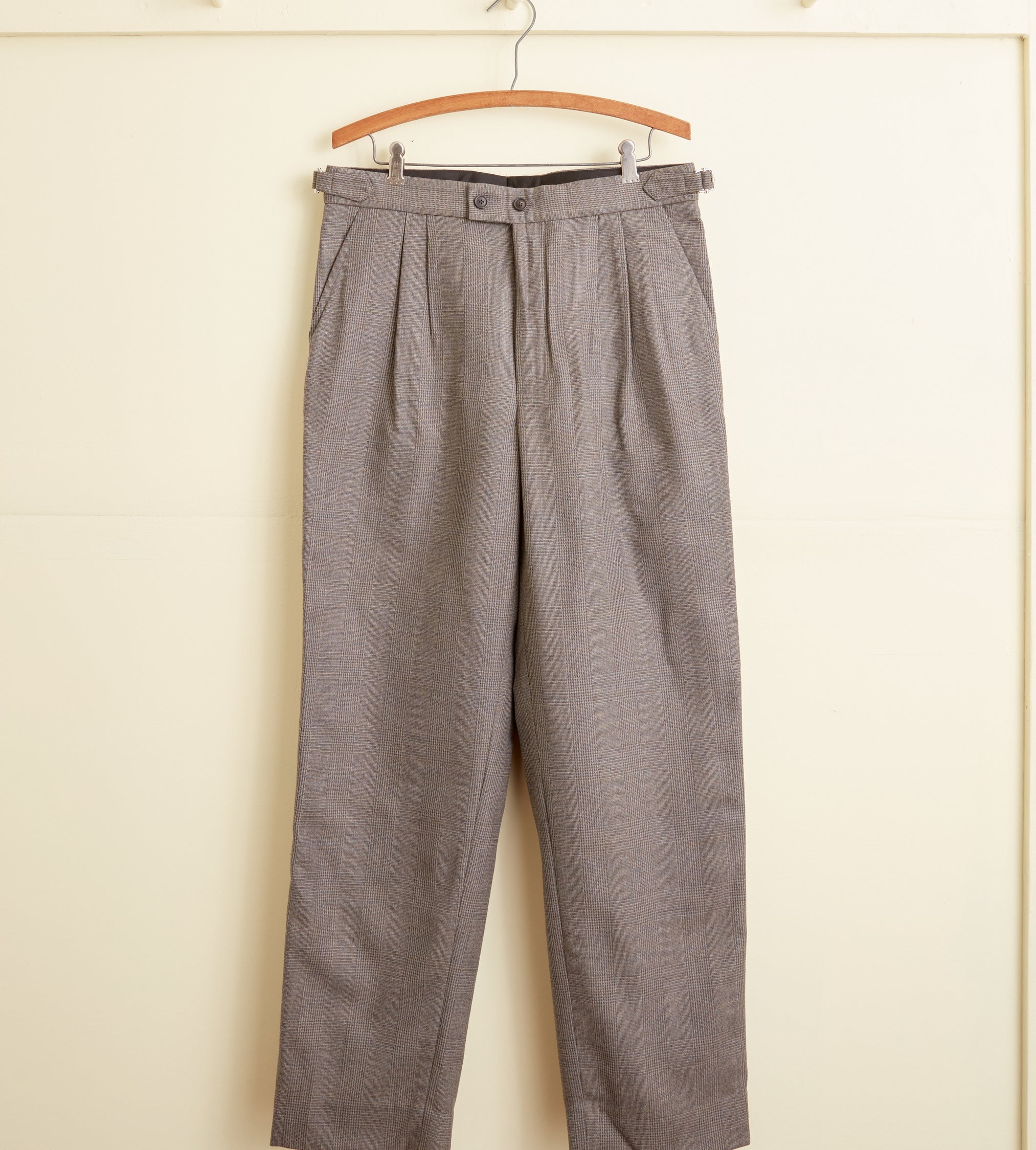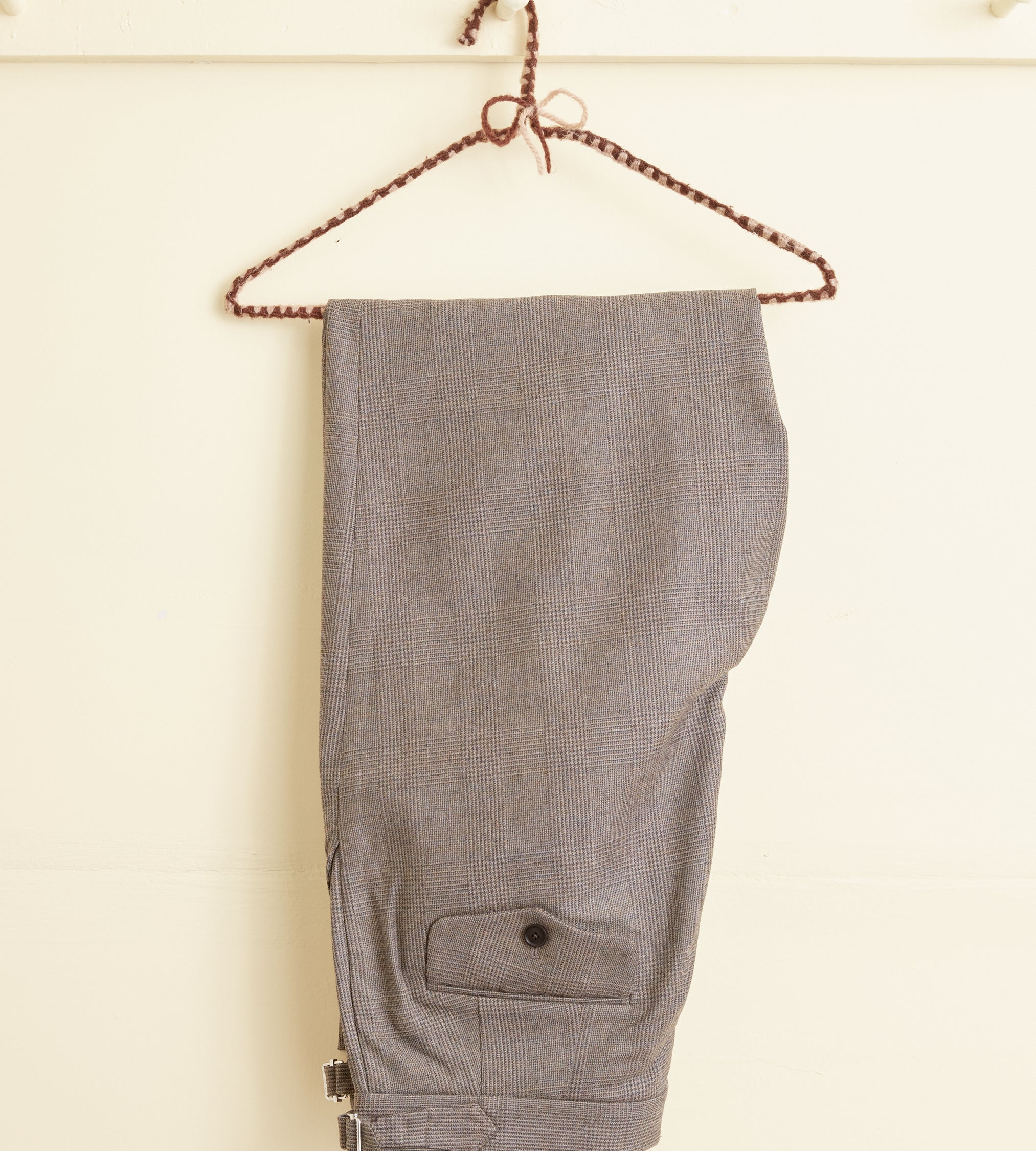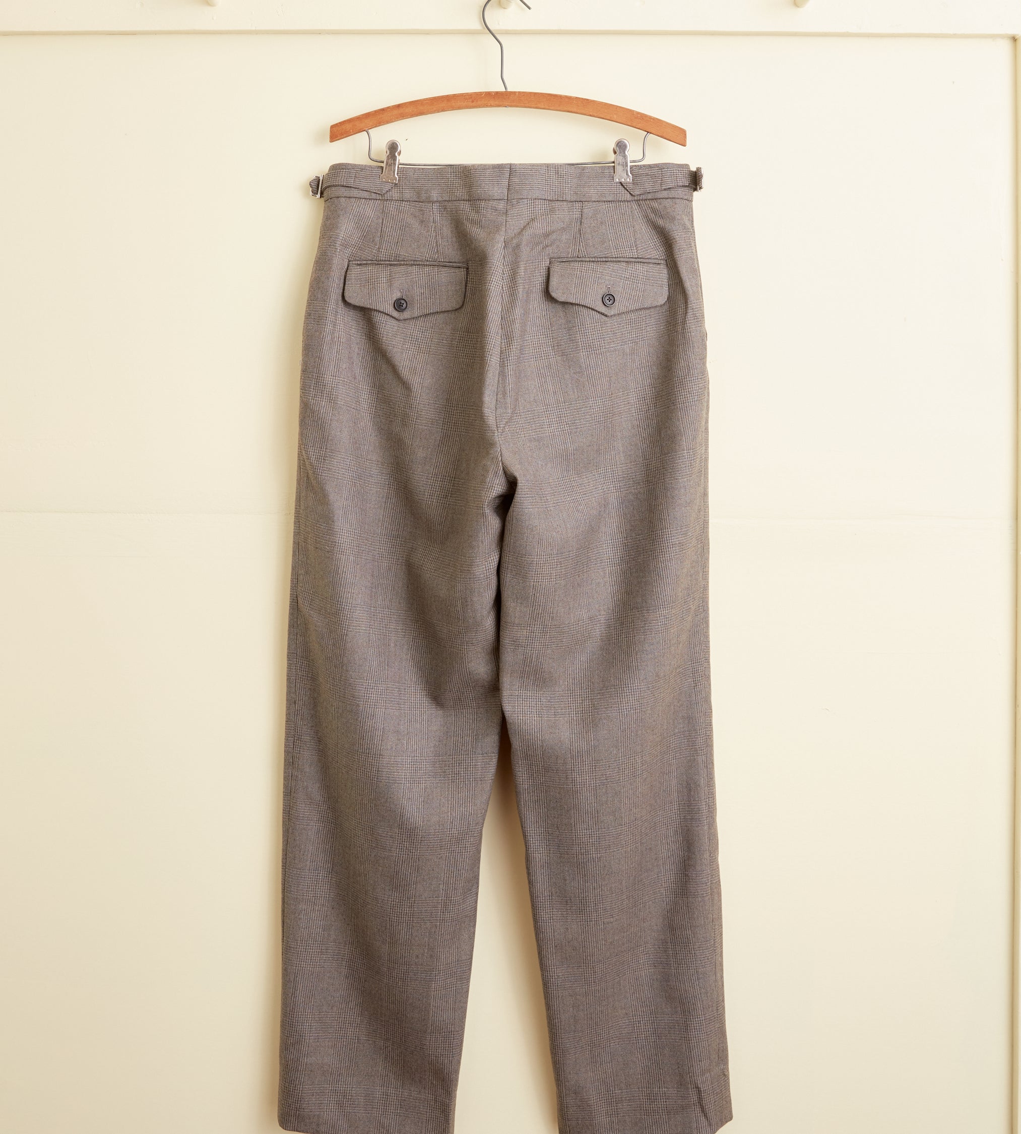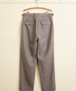 These trousers are made from deadstock wool in a grey-brown houndstooth plaid, circa 1950s-1970s. We purchased this fabric from a tailor in Buffalo, NY, who closed his doors in the 1970s. He bought all his fabric from the UK and Italy. It had been sitting in his storage unit until we purchased it sixty years later. Hand-mending throughout.