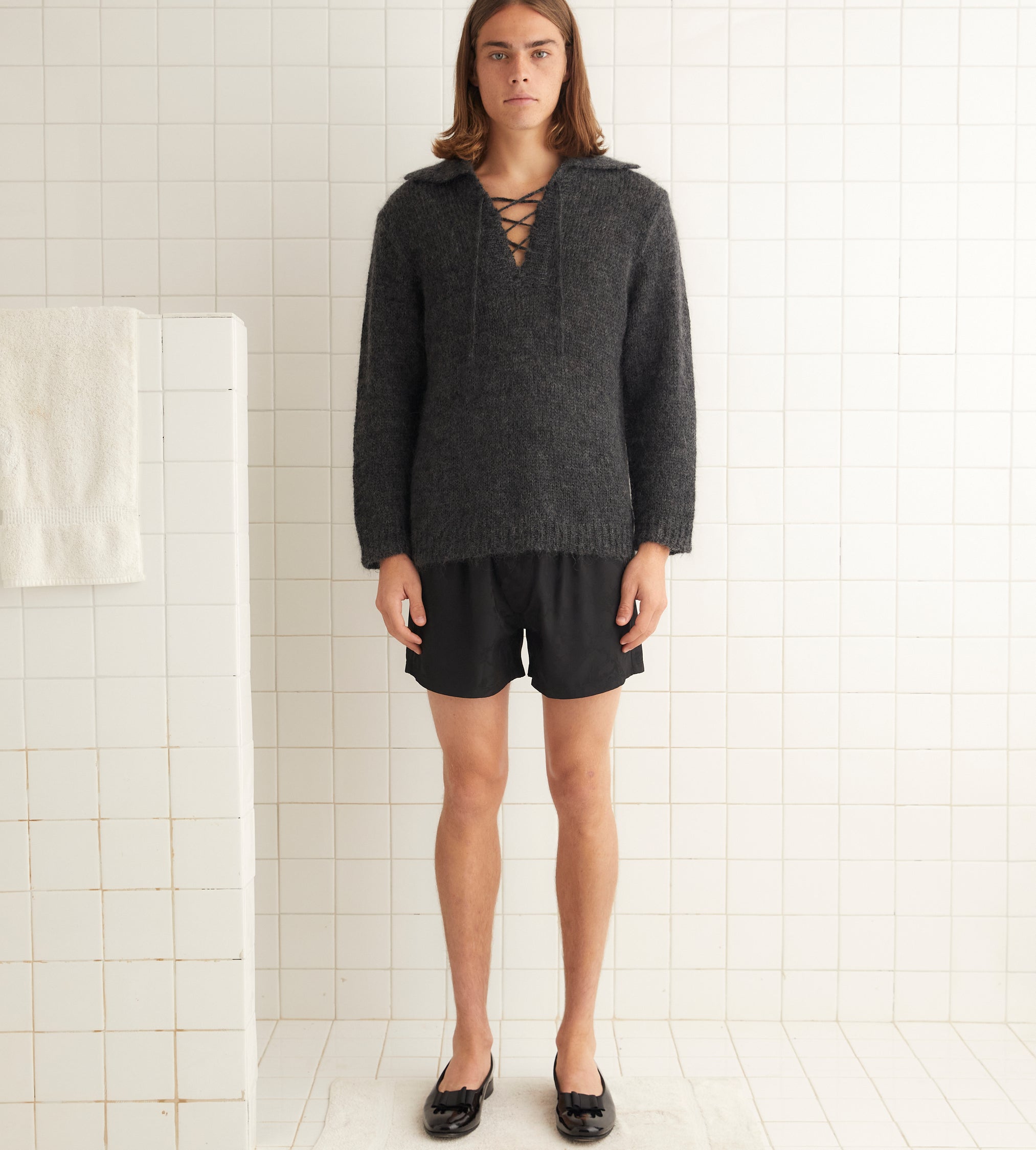 This style is a recreation of a sweater from the 1970s. We reproduced the silhouette, with its lace-up neckline, for this style.