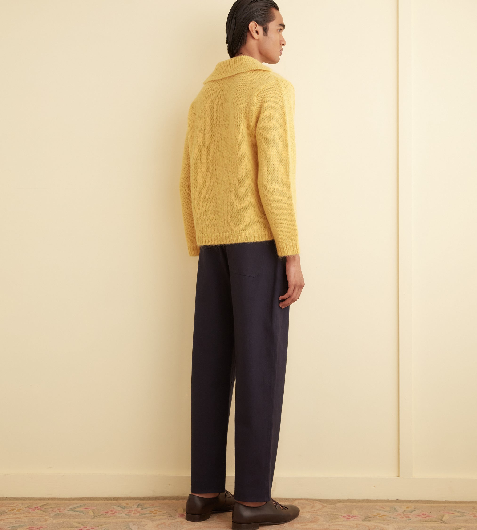 This pullover is inspired by a vintage sweater from the 1970s, which featured this lace-up neckline. We reproduced the original sweater for this style.