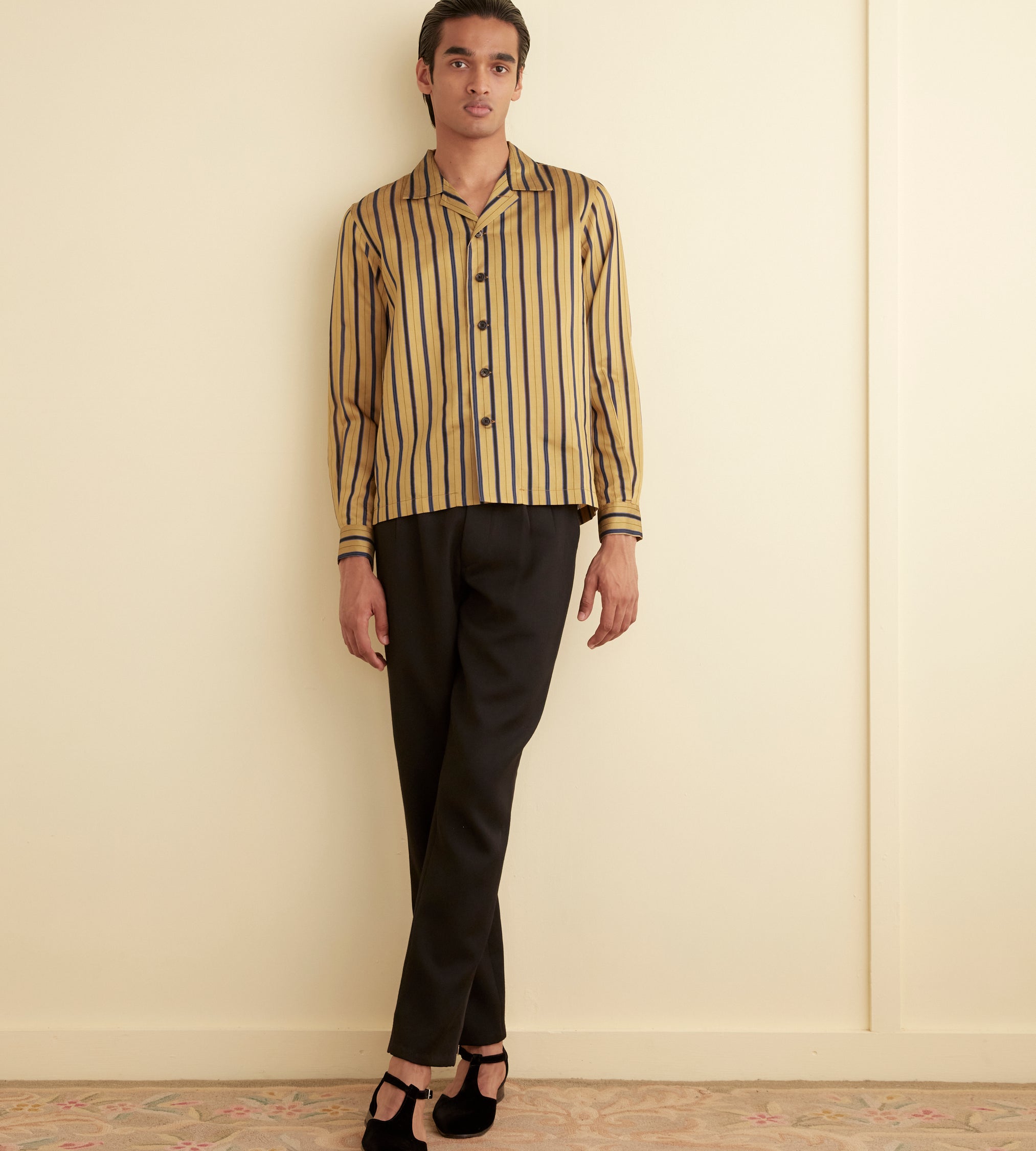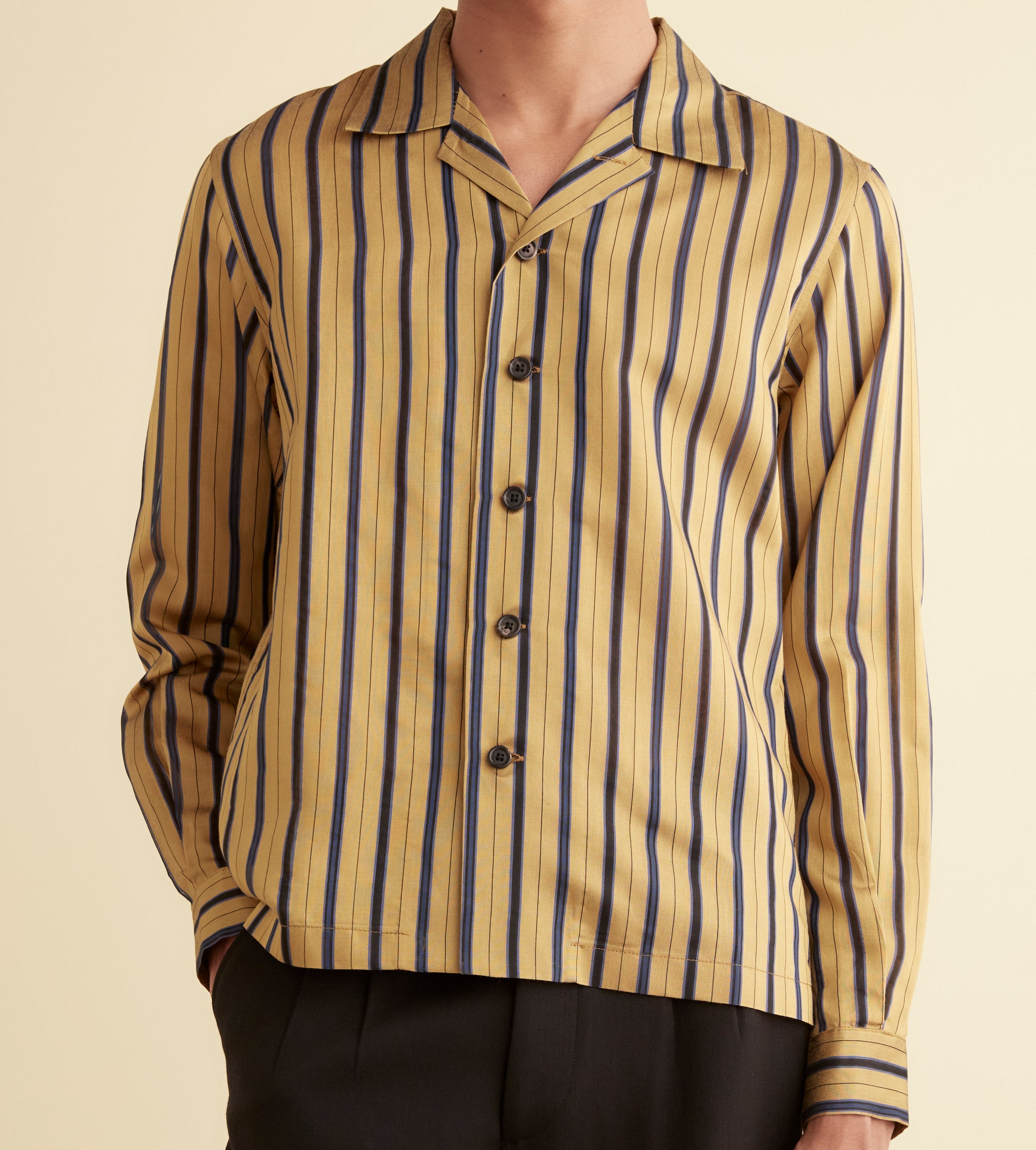 This shirt is inspired by a men’s shirt from the 1960s-1980s. We reproduced the fabric, a blue, black, and yellow stripe, for this style.