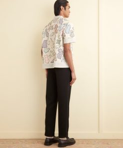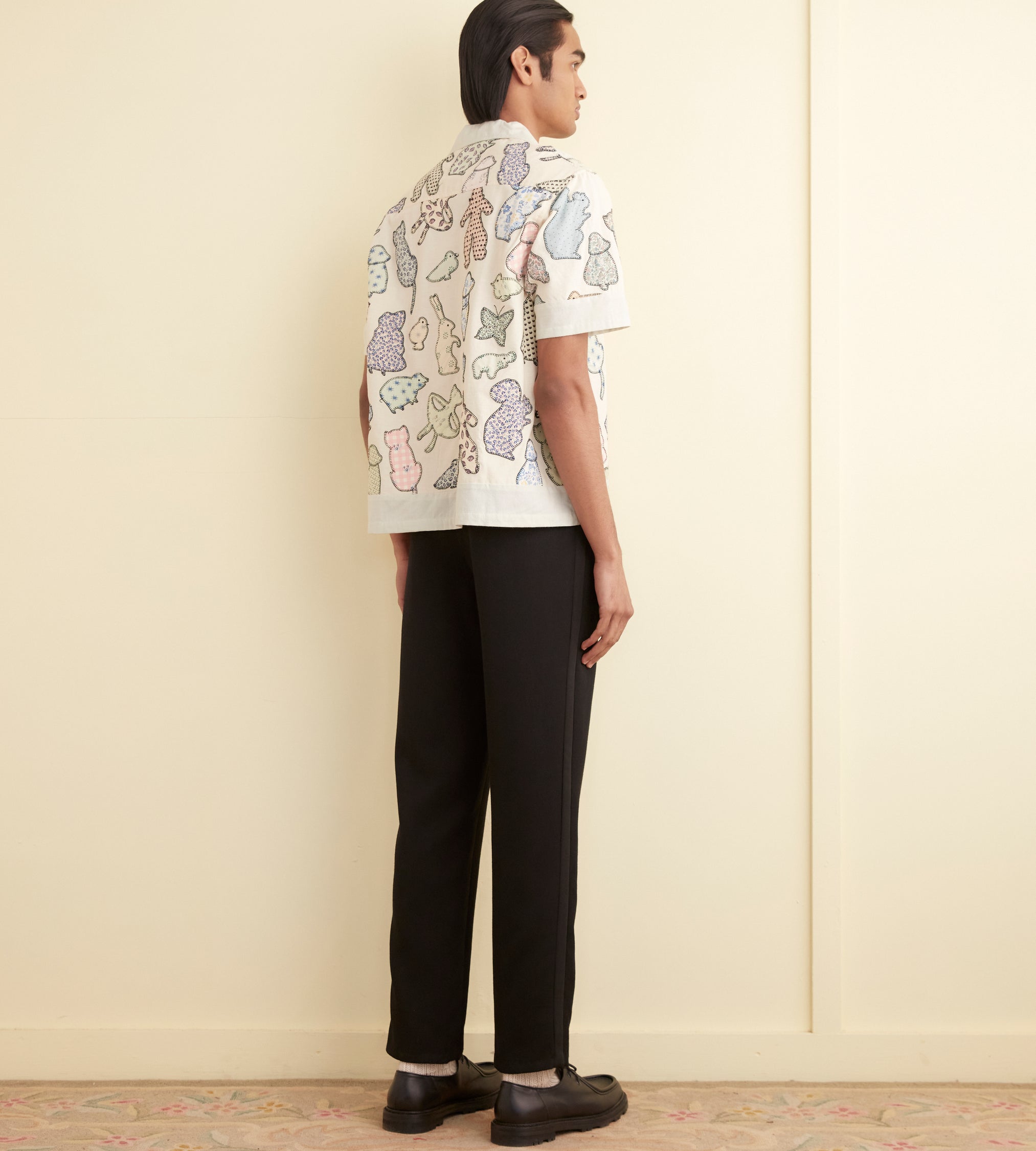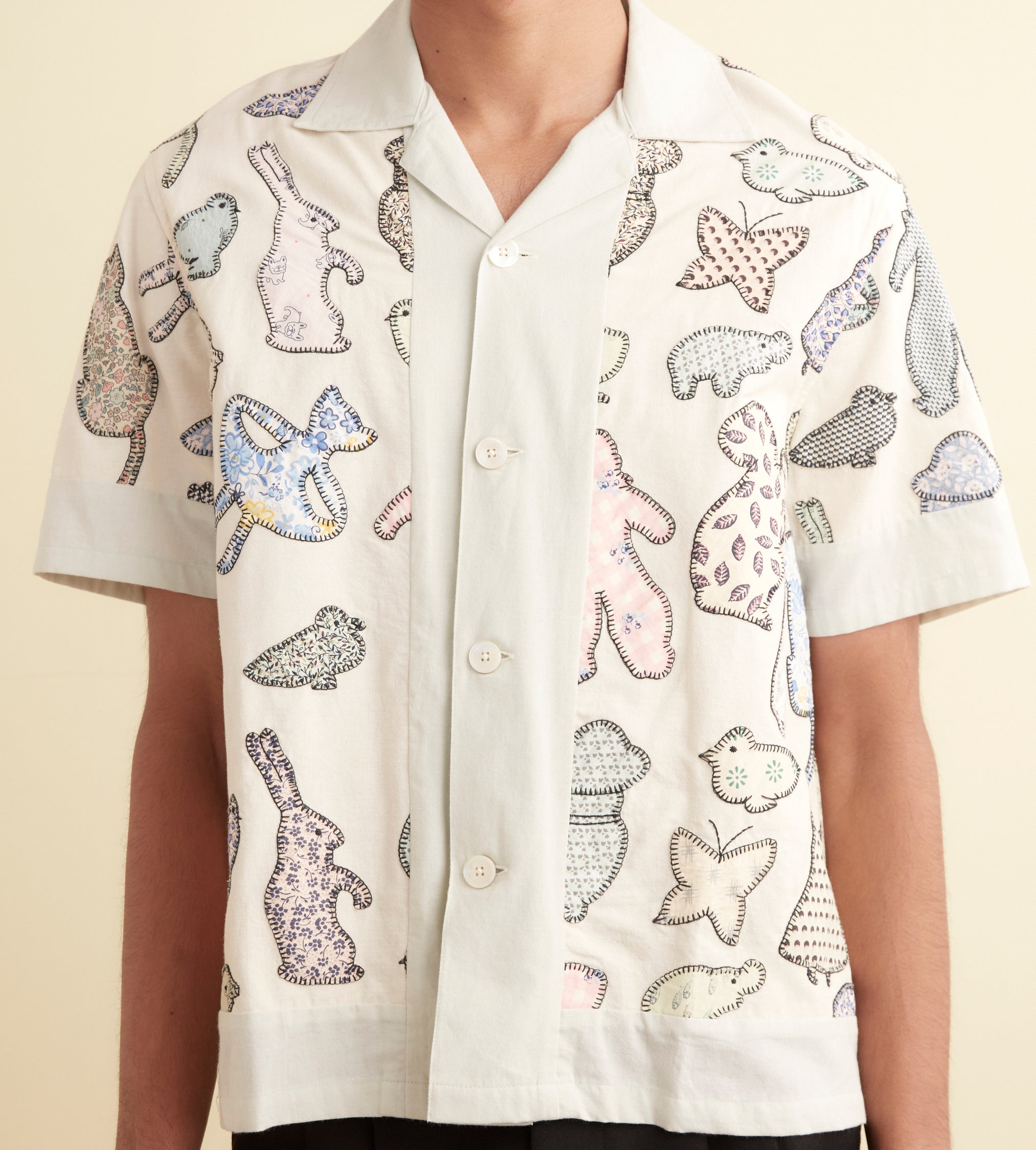 This short-sleeve shirt is inspired by a children’s quilt from the 1940s. The original appliqué animal patches were cut from printed feedsacks.
