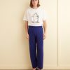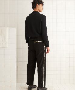 These trousers are inspired by a twirler’s uniform from a marching band, circa 1960s. We reproduced the rippling gold sequin trim along the side seam and back pocket. The trousers are made of black corduroy and have a high rise and a straight leg.