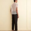 These trousers are inspired by a twirler’s uniform from a marching band, circa 1960s. We reproduced the rippling gold sequin trim along the side seam and back pocket. The trousers are made of black corduroy and have a high rise and a straight leg.