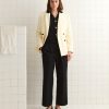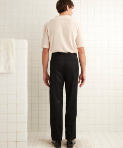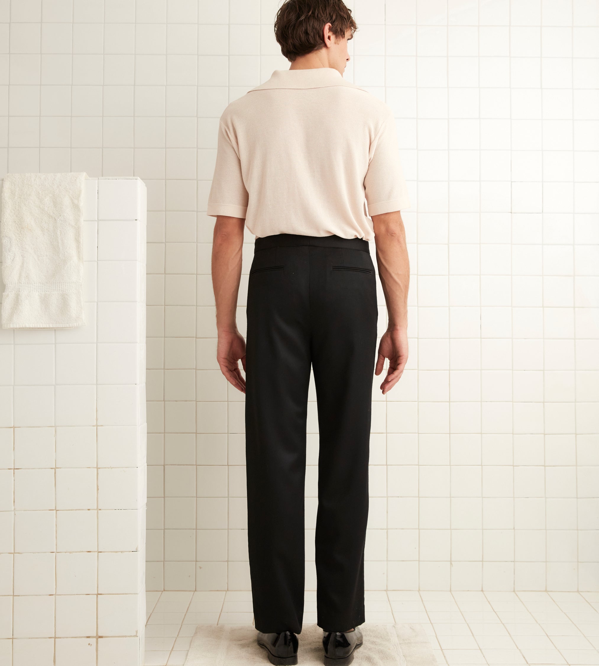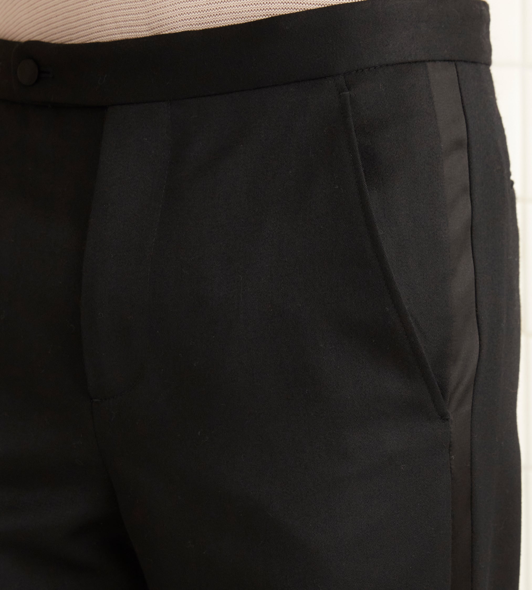 These trousers are inspired by men’s suit pants from the 1950s-1960s. We reproduced the silhouette for this style. The trousers have a satin tuxedo stripe and satin-covered buttons.