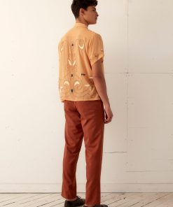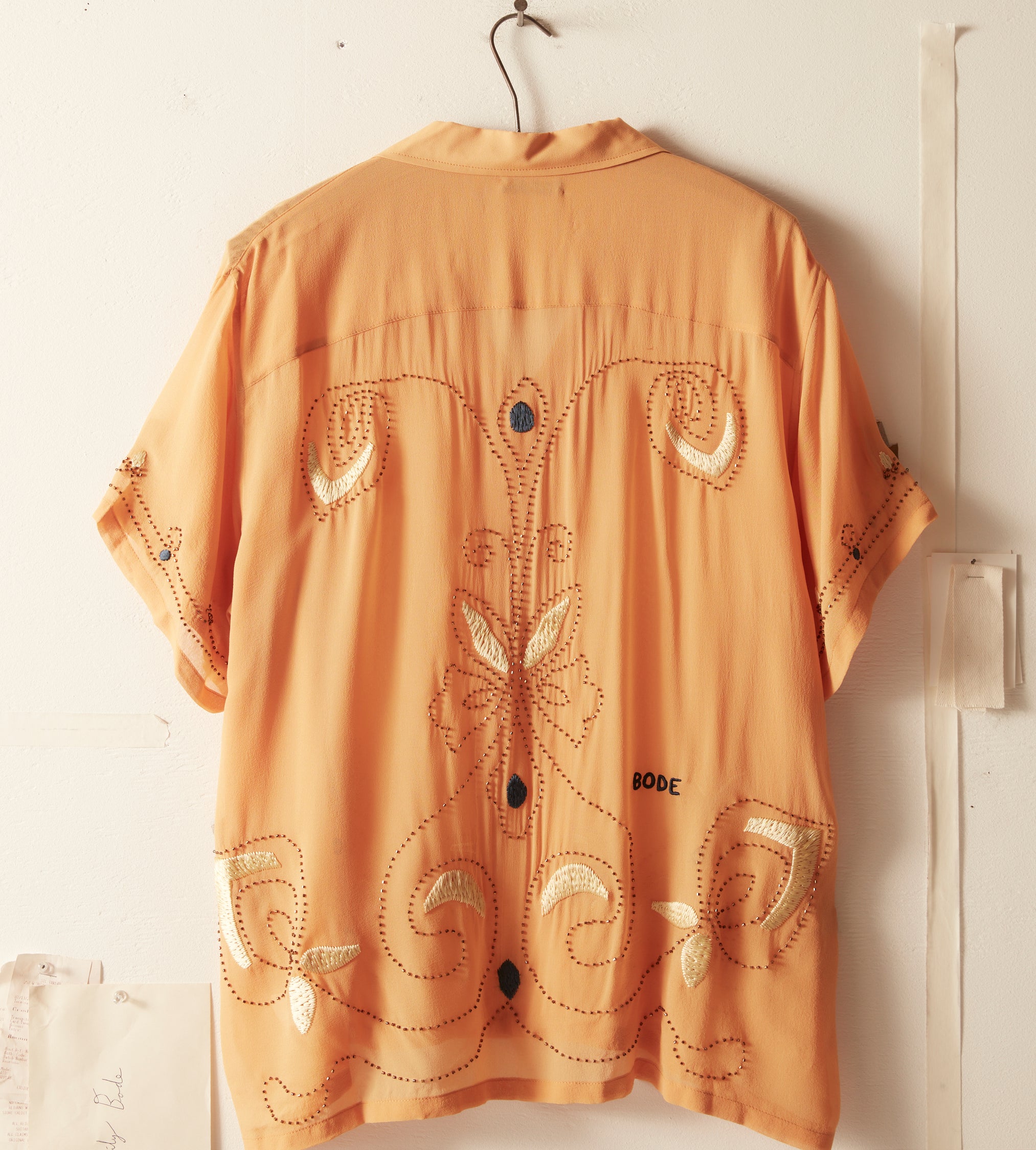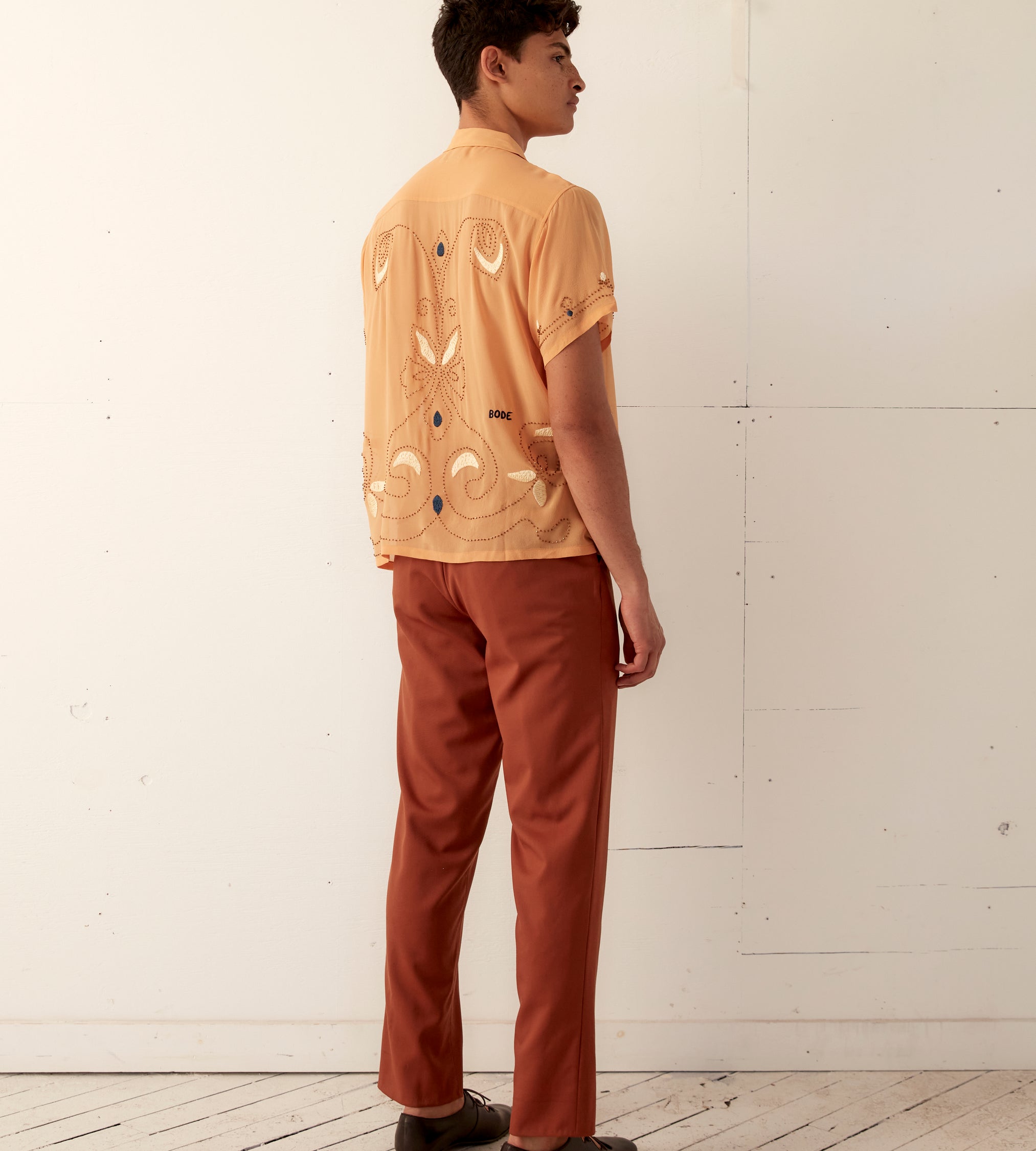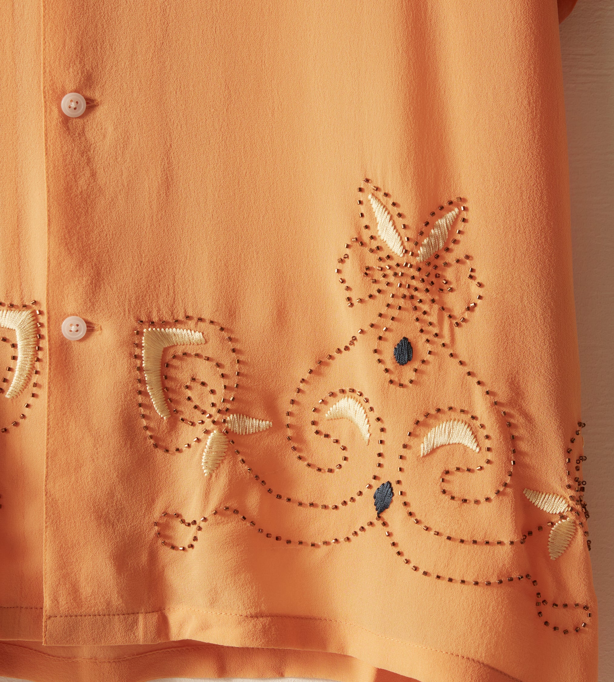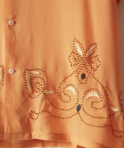 This short-sleeved shirt is inspired by a 1920s-1930s women’s blouse. Made of silk georgette, a fabric engineered in the early twentieth century by French dressmaker Georgette de la Plante, the shirt features both hand-beading and hand-embroidery.
