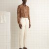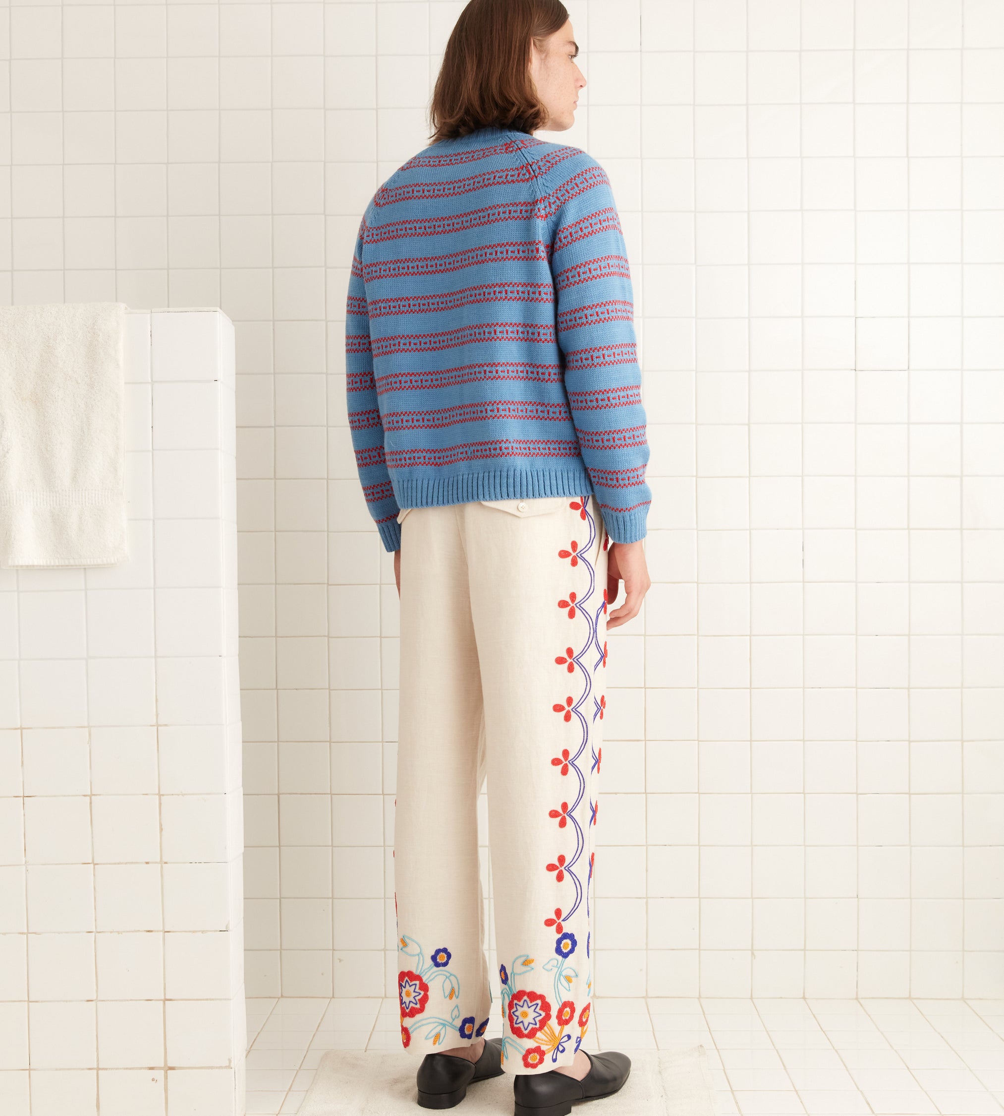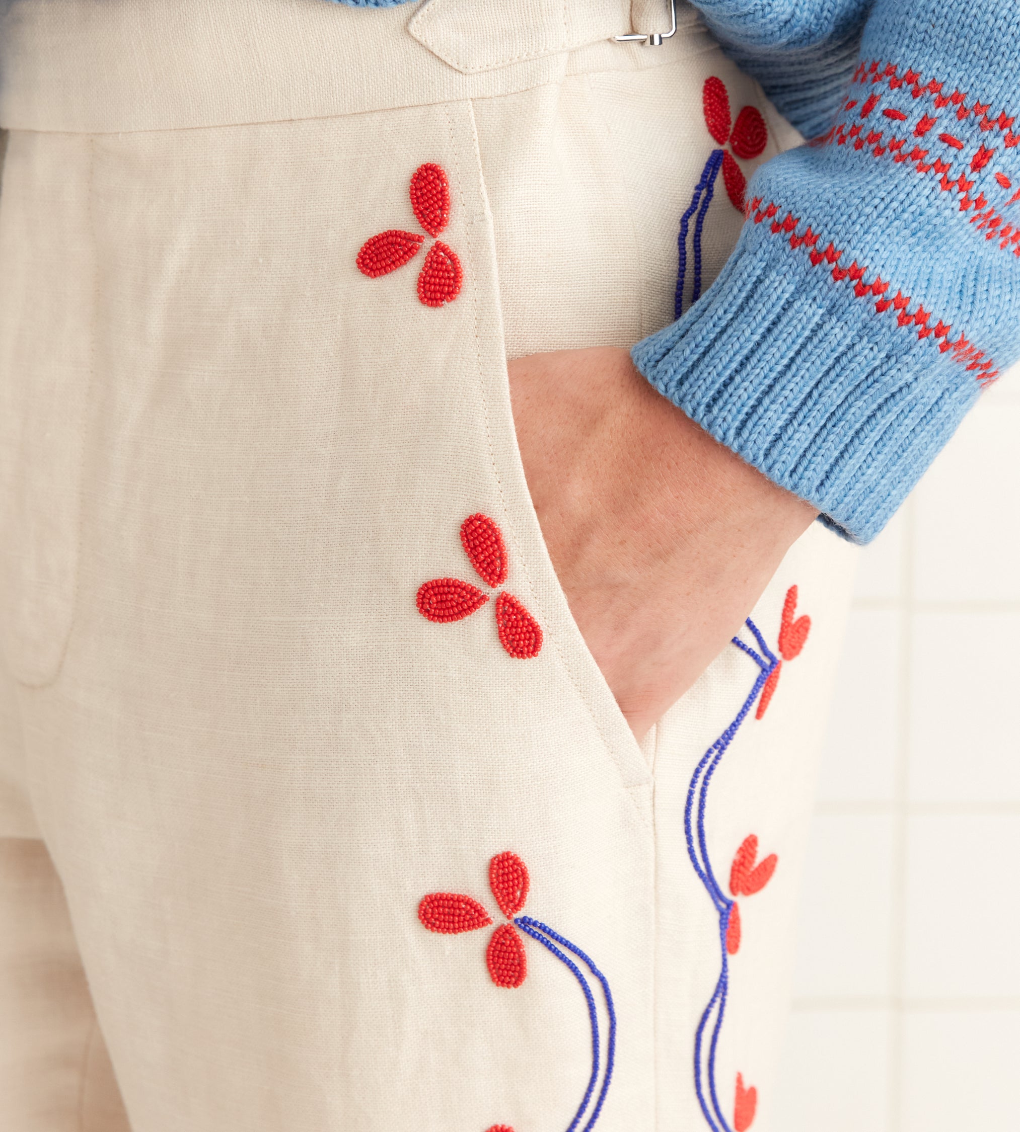 These trousers are inspired by an embroidered tablecloth from the 1950s. We reproduced the floral patterns in colorful beadwork down the side seam and around the hem. The trousers have a mid-rise and a straight leg.