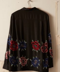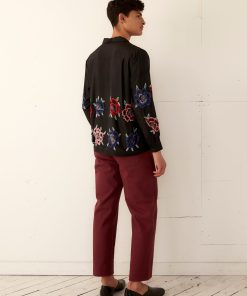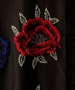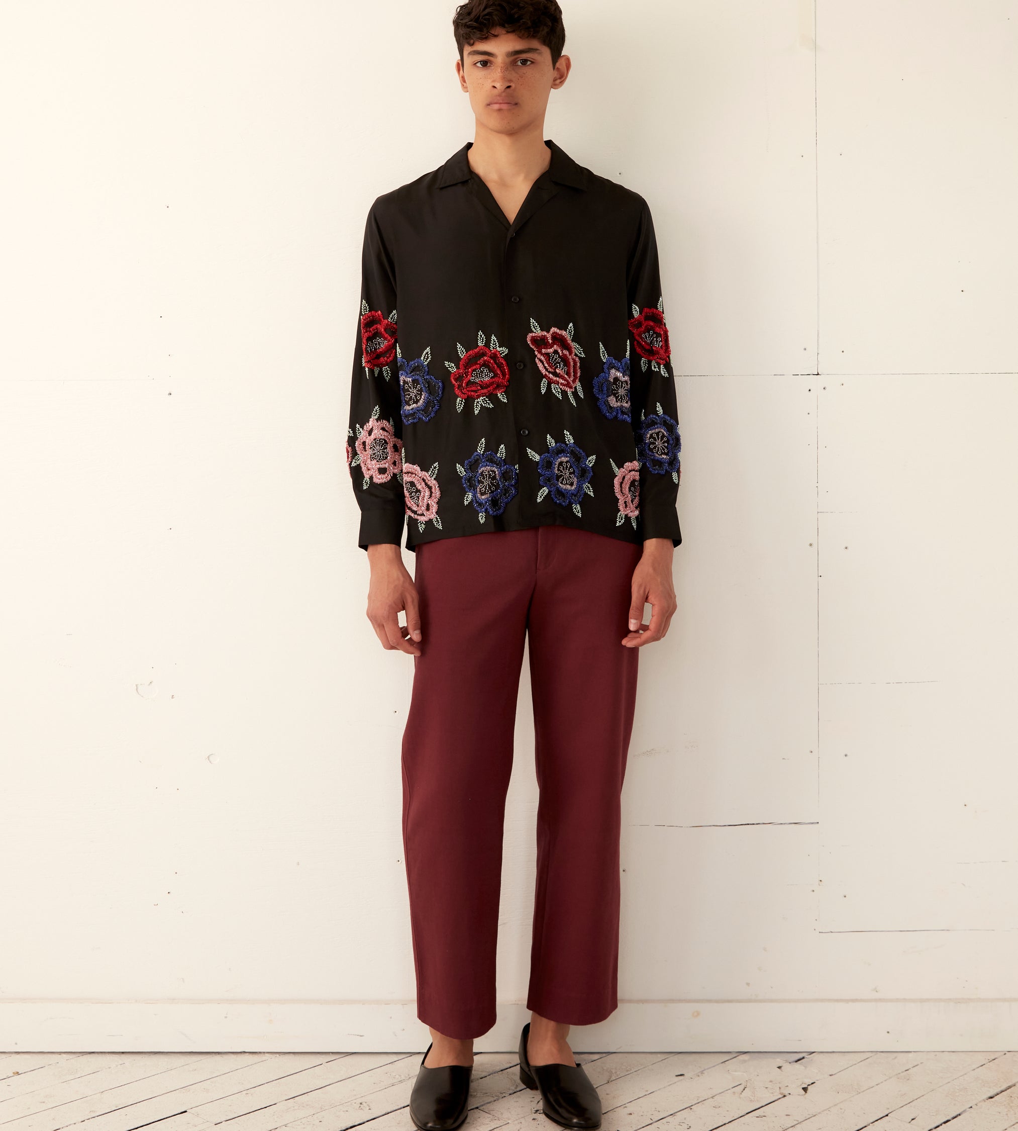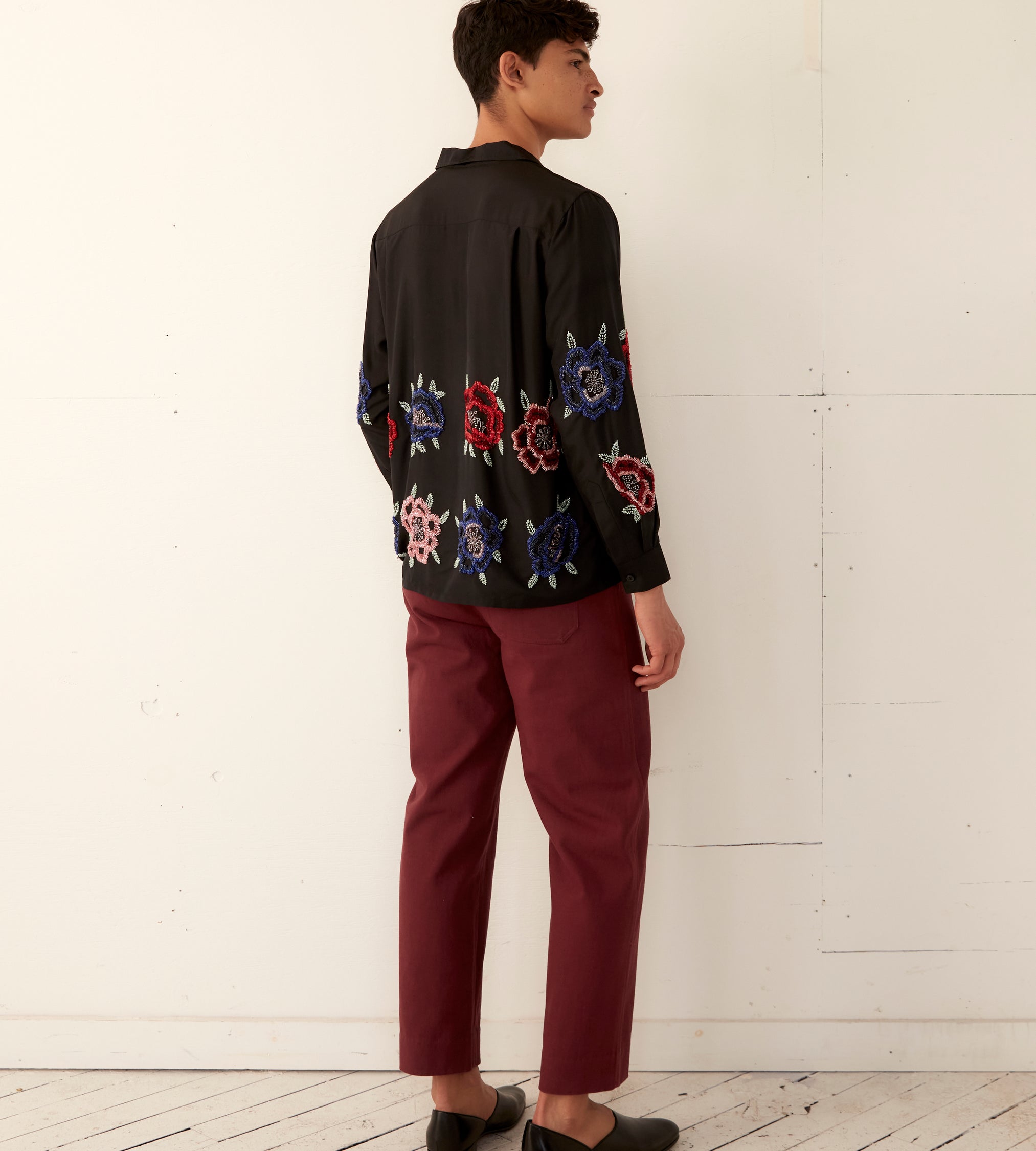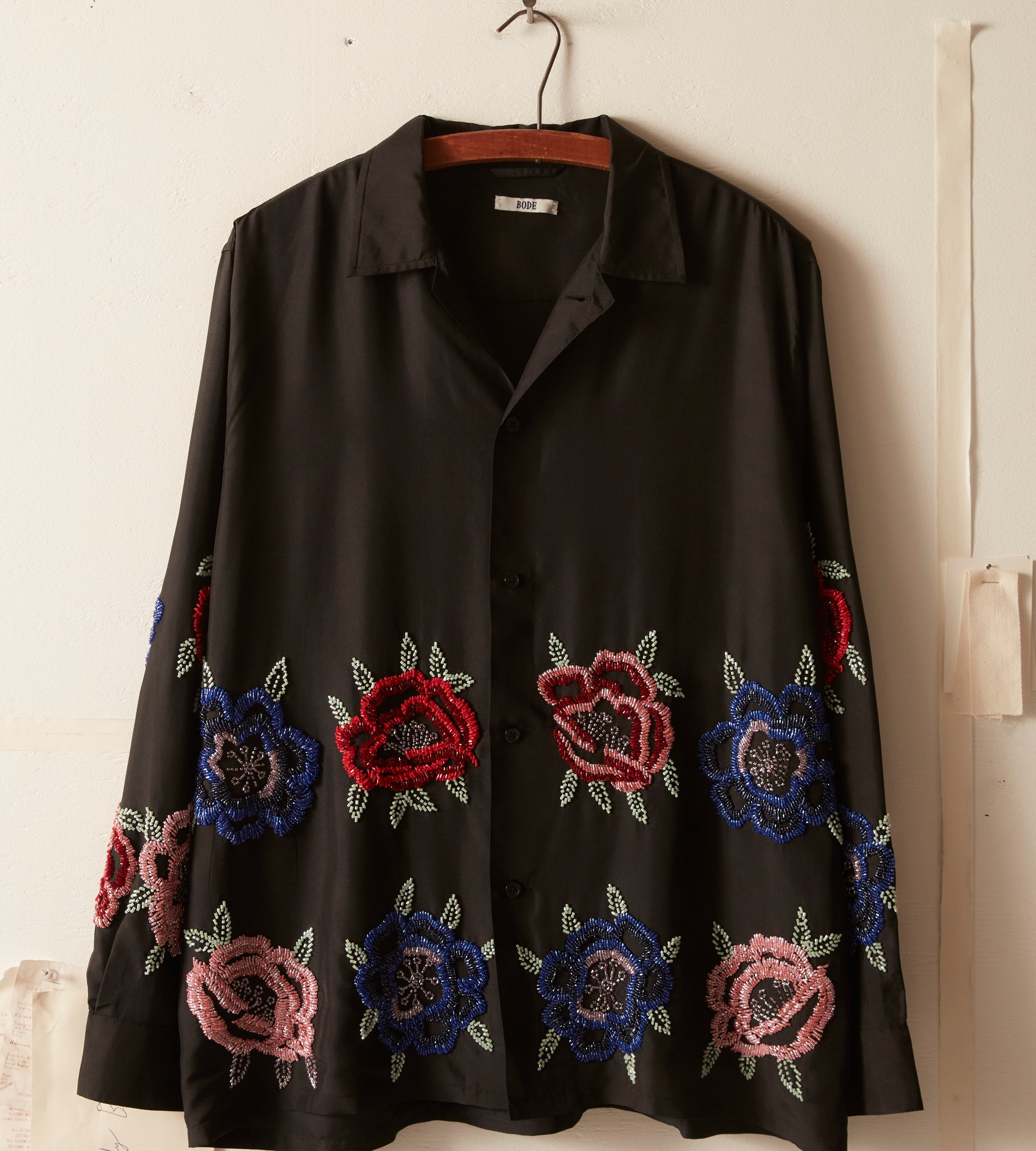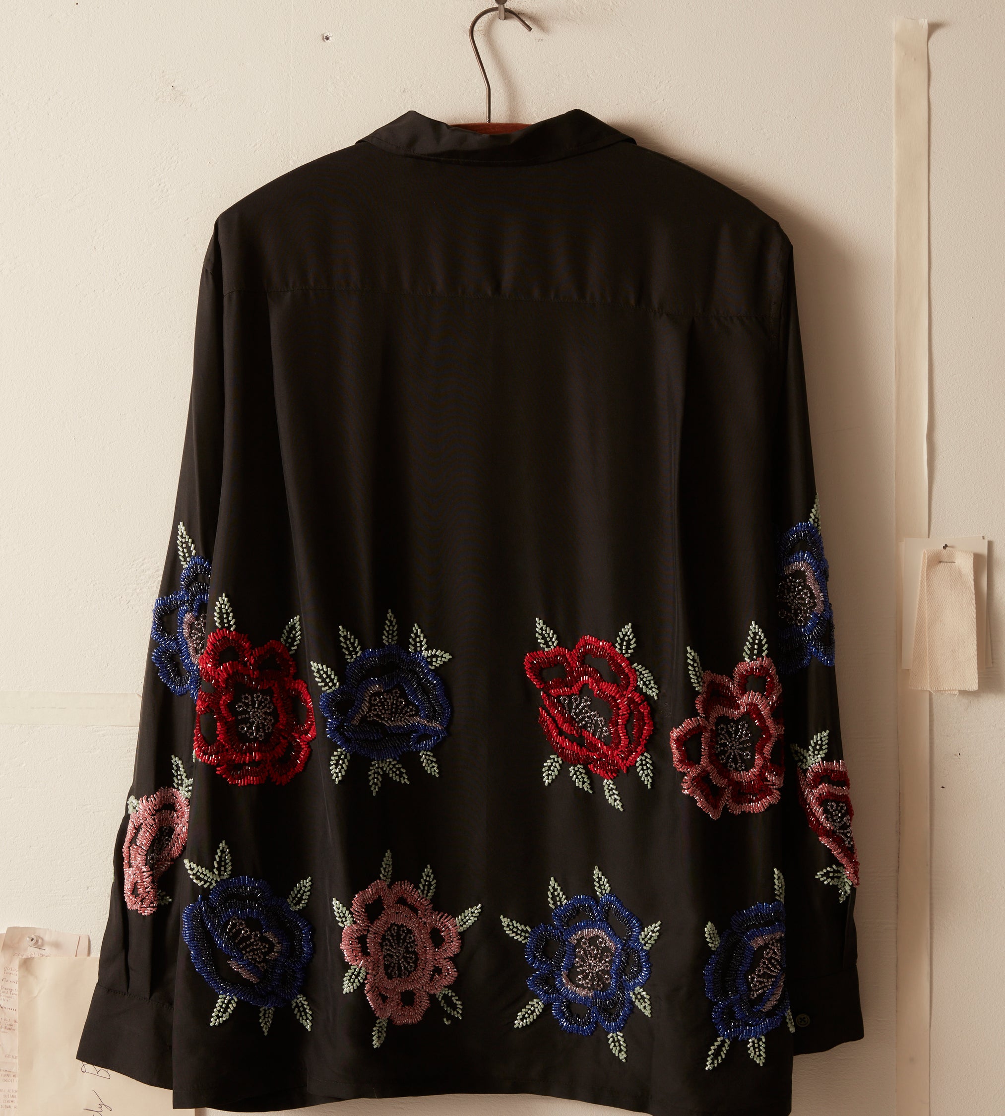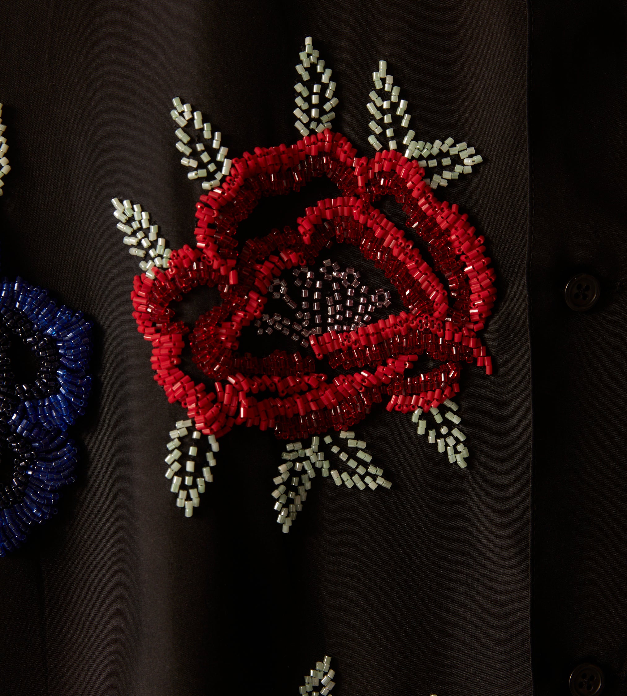 This shirt is inspired by a dress from the 1970s-1980s. Made from black silk, it has been beaded with red, blue, and pink poppies in a faithful reproduction of the original pattern.