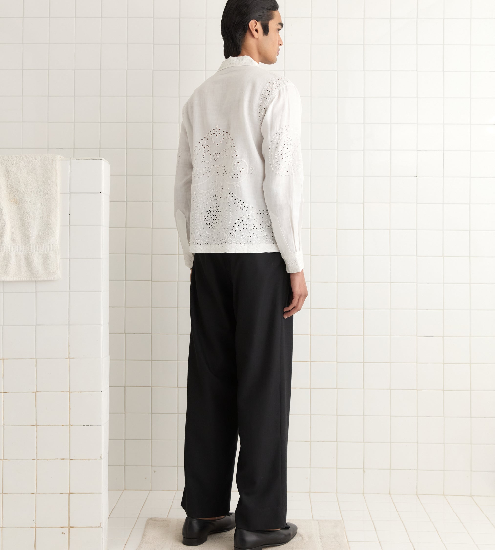 This shirt is inspired by a bed jacket from the 1890s. We reproduced the broderie anglaise lacework for this style, incorporating “Bode” into the pattern across the back.