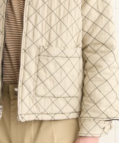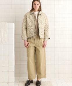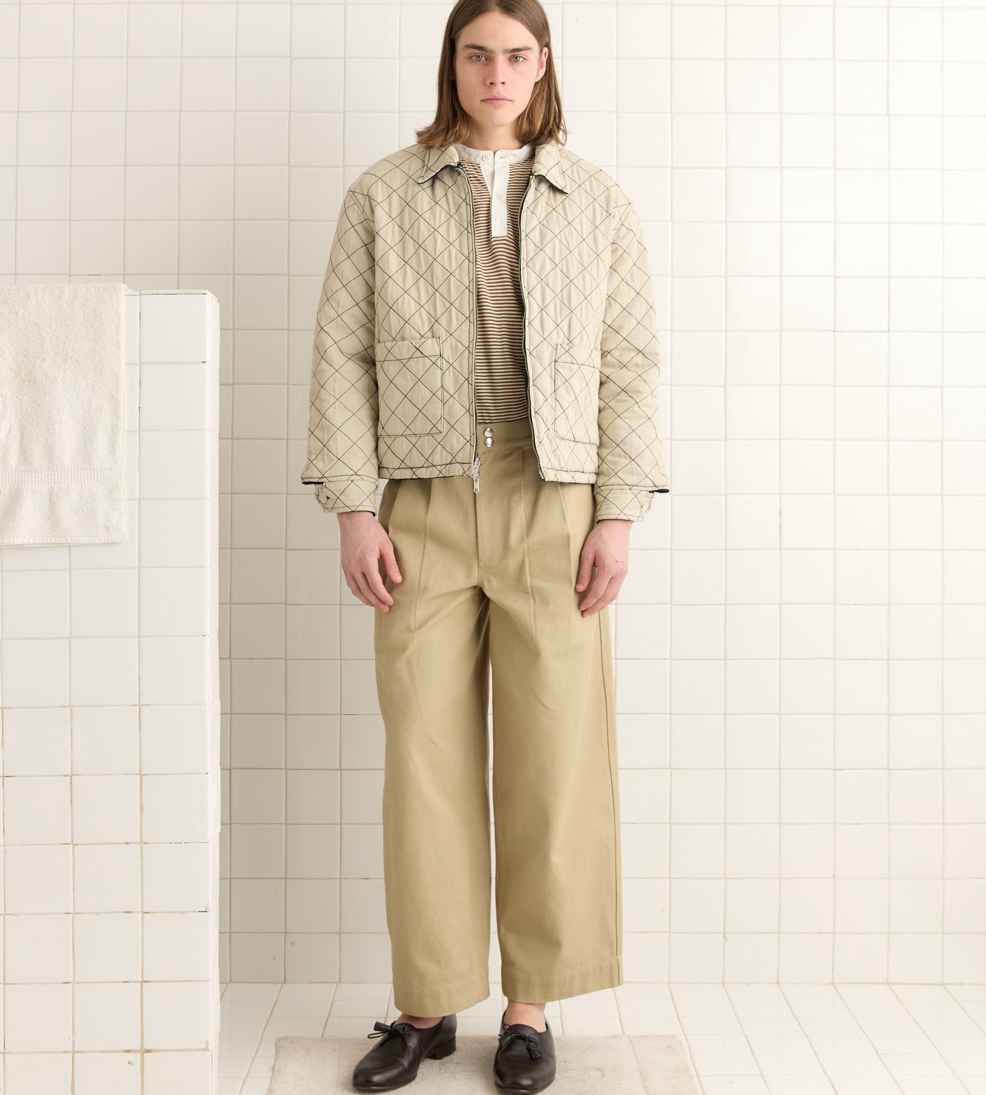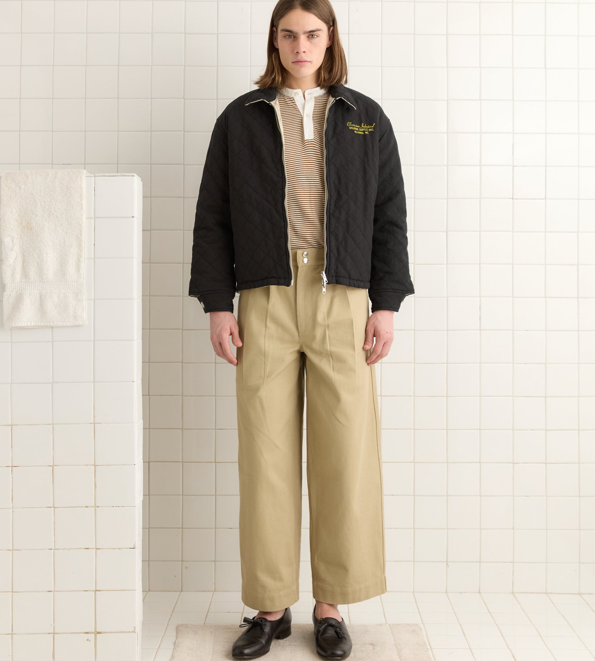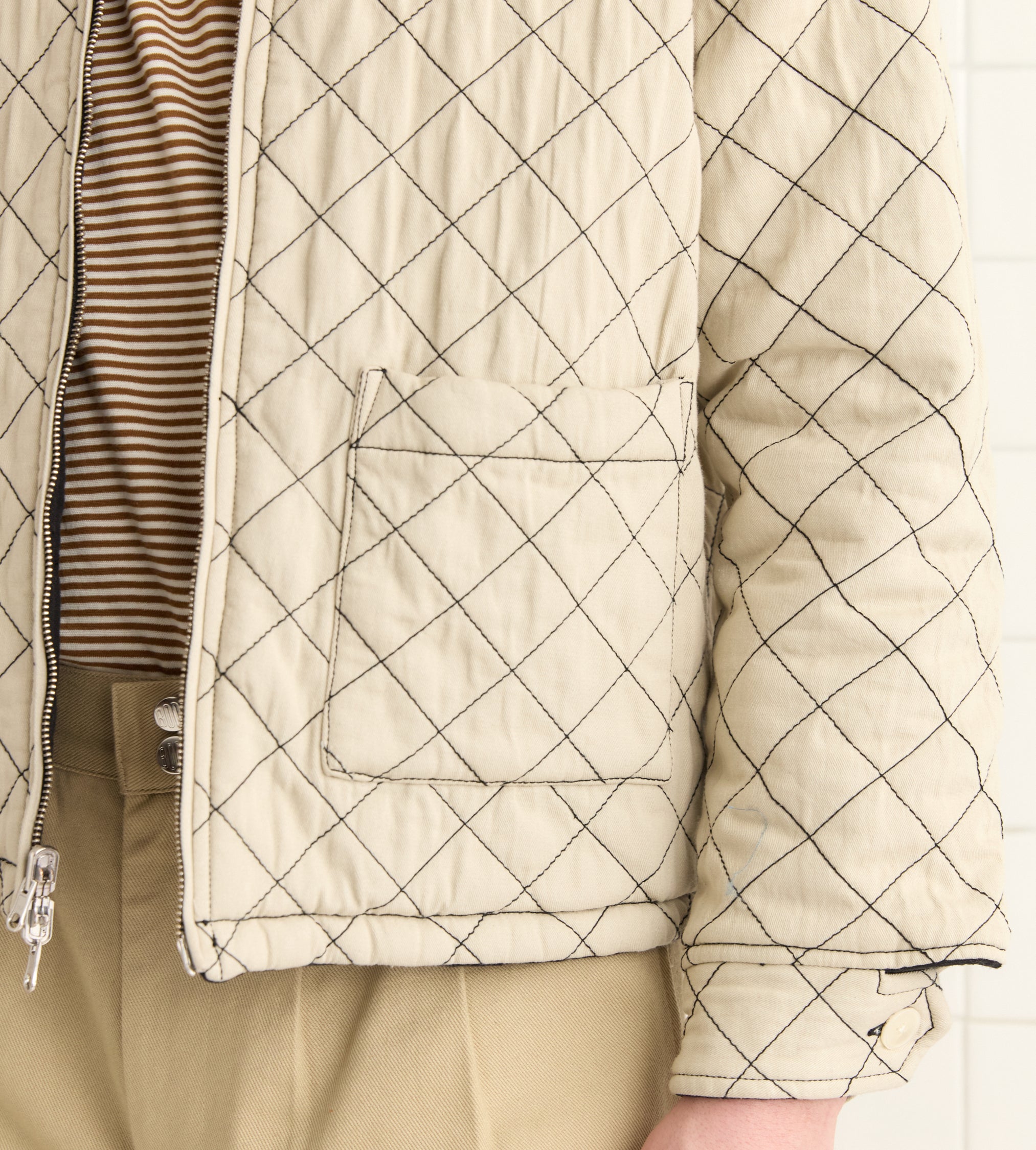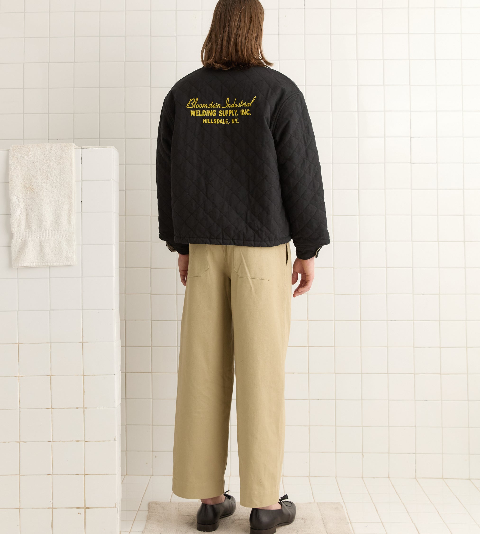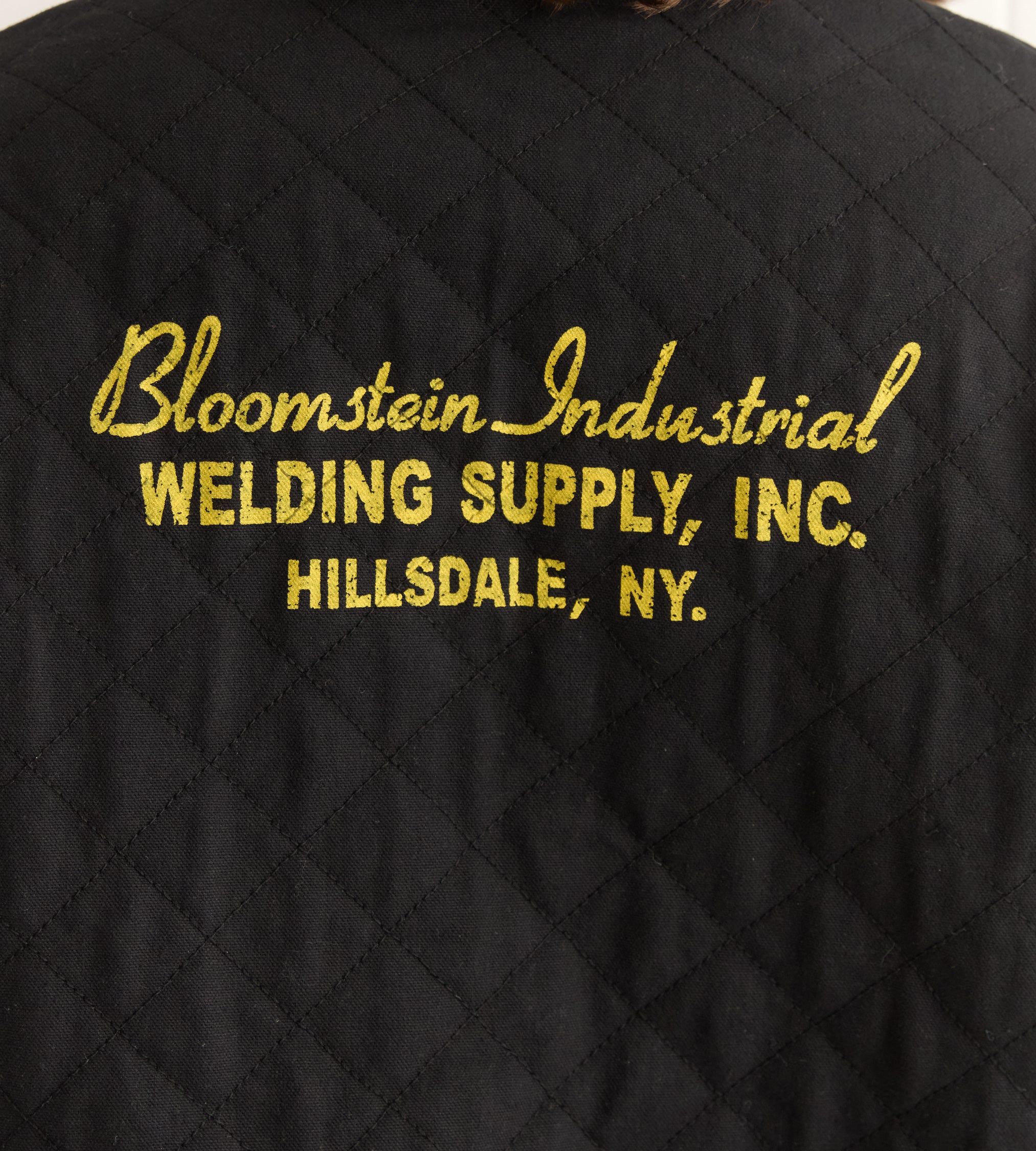 This jacket is inspired by a welding cap from the 1950s. These caps were usually quilted to provide more protection from sparks and were commonly handed out as promotional material from welding supply companies. We reproduced the quilting and lettering for this jacket, which is cut in a workwear silhouette.