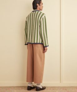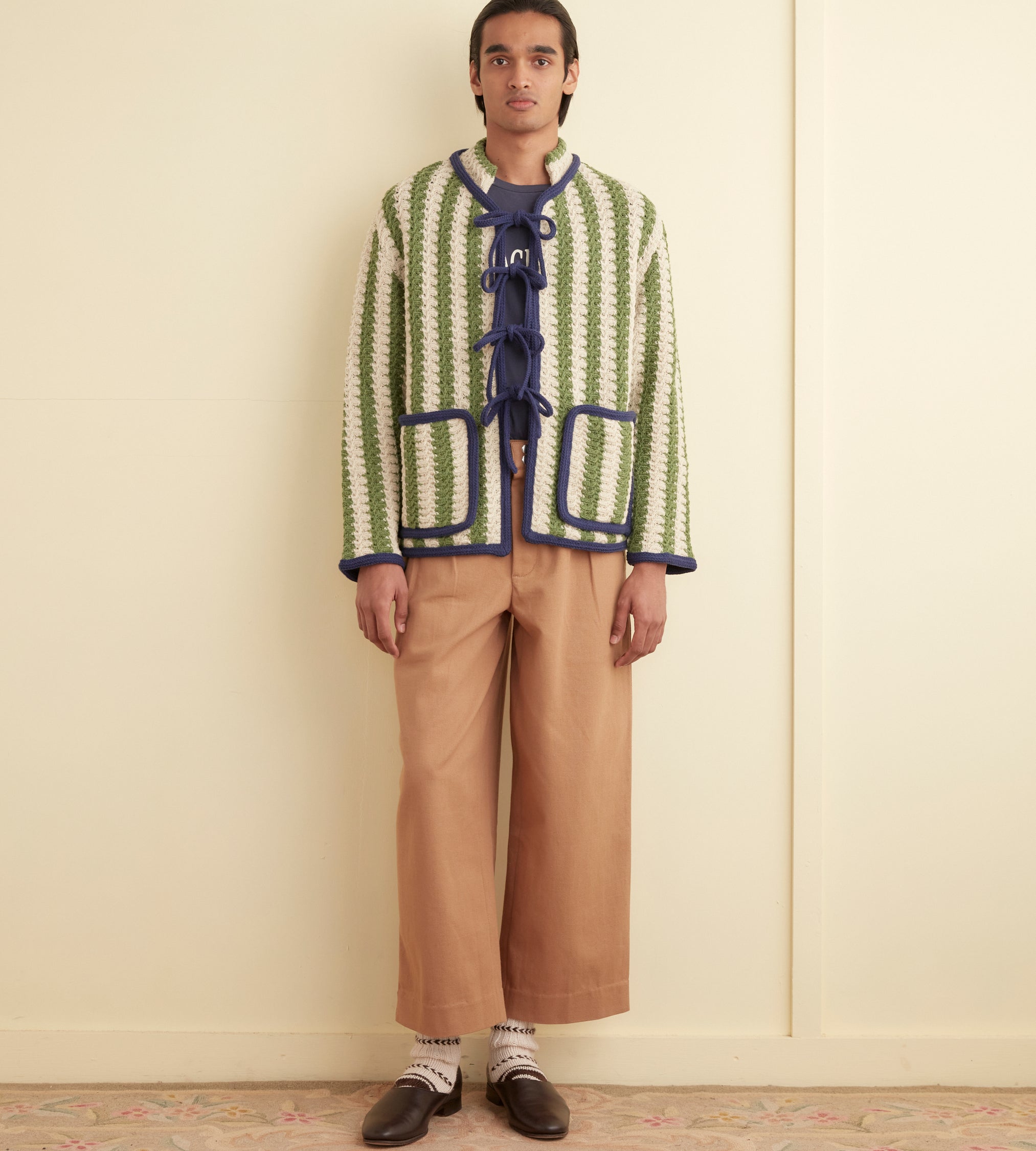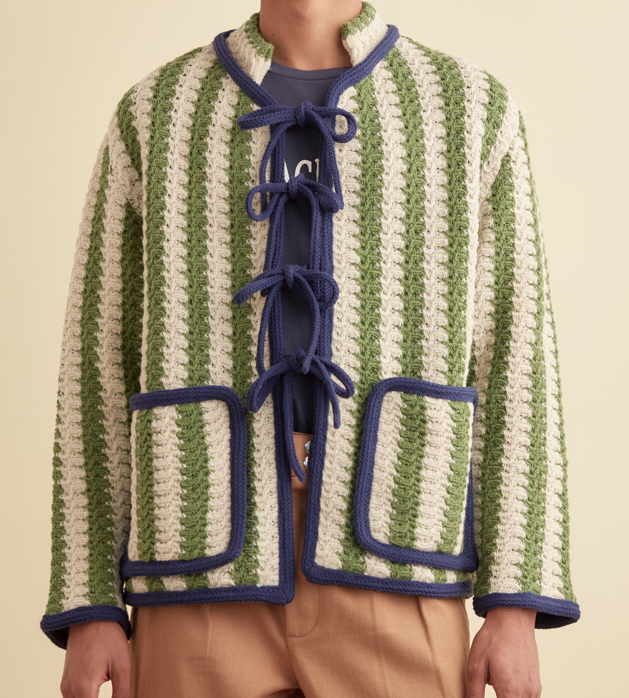This cardigan is inspired by a vintage sweater from the 1940s-1950s. We reproduced the textured stripes and rope edge detail for this style, which can be tied with a series of bows.