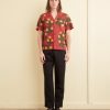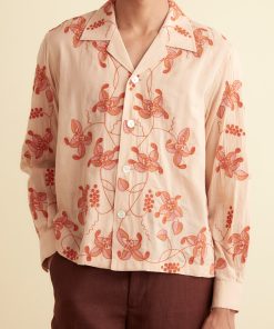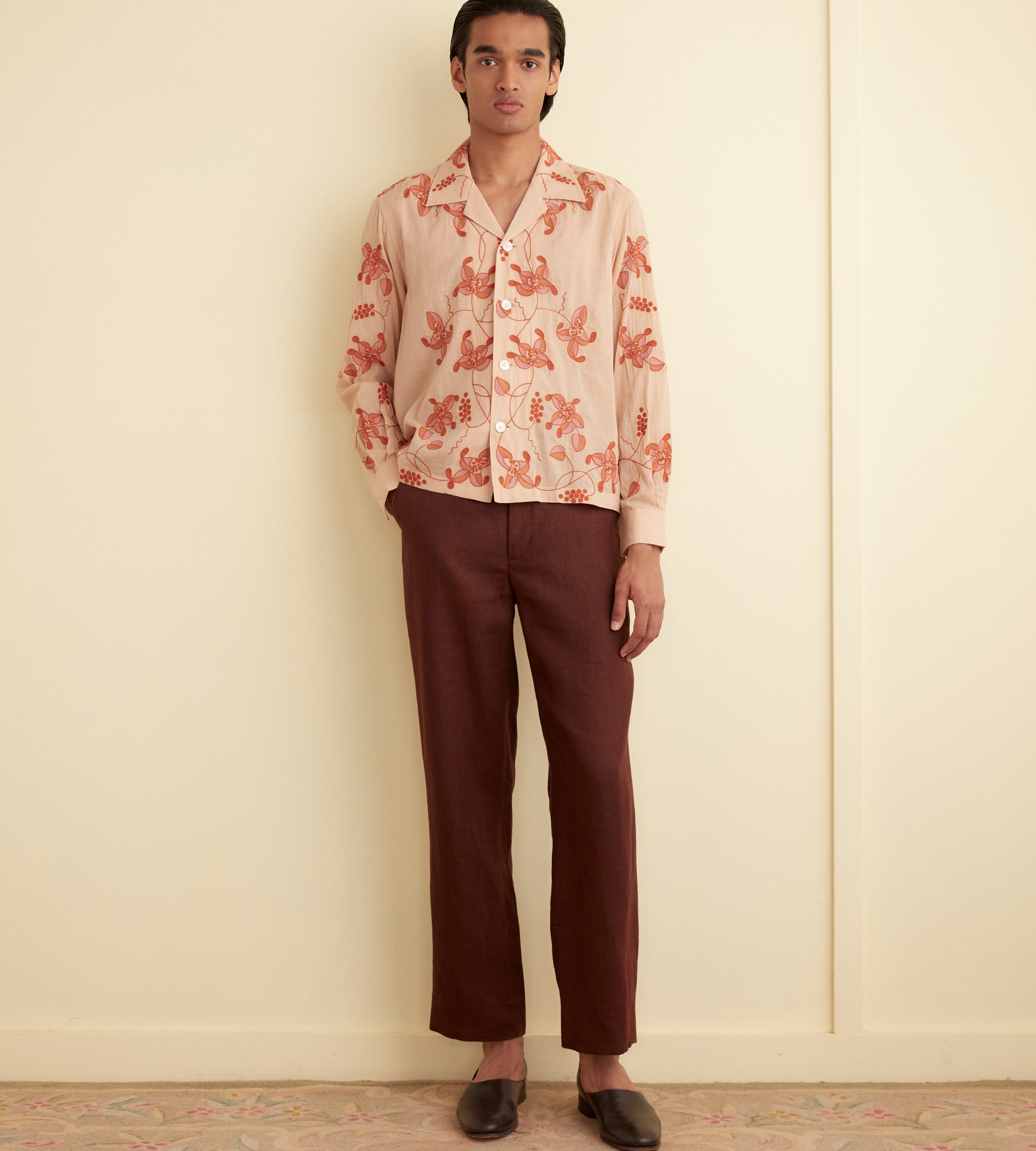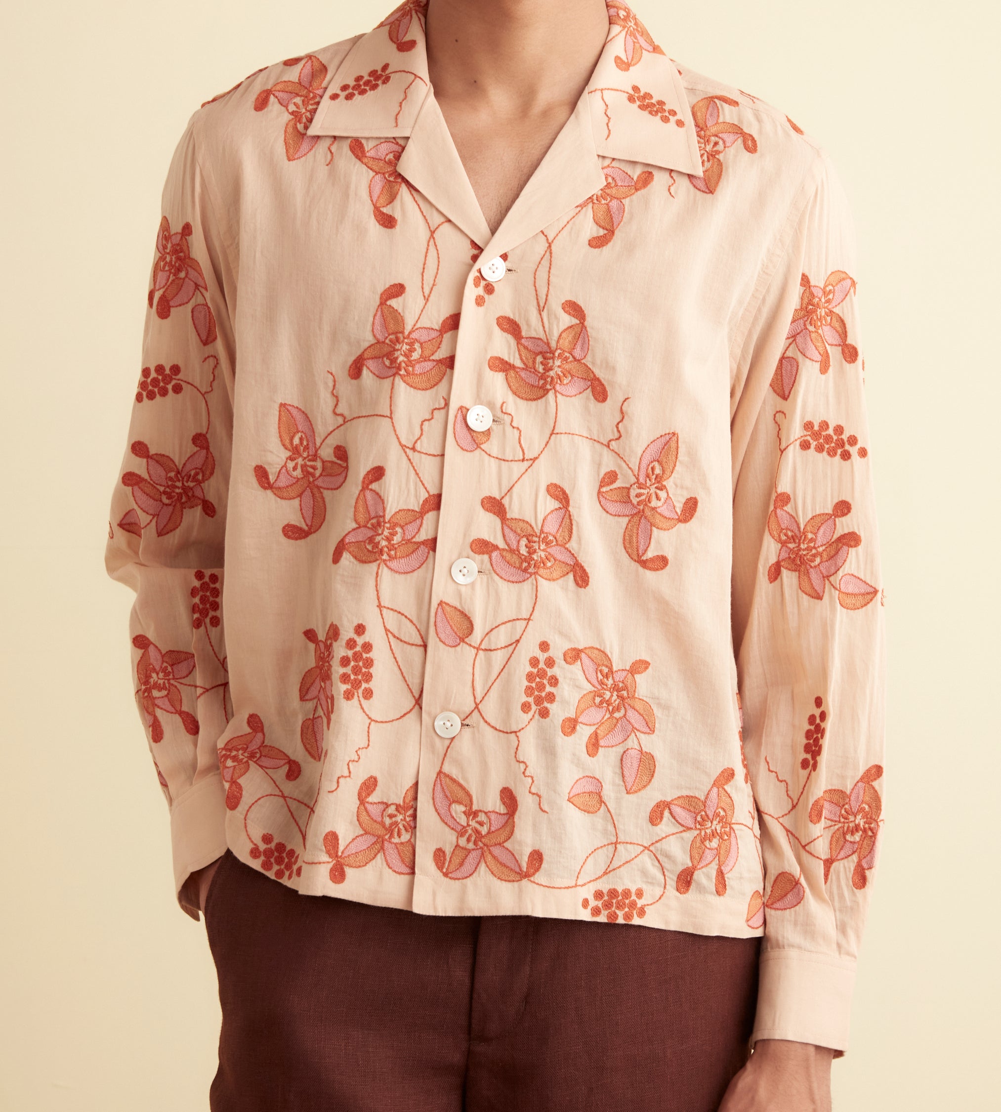 This shirt is inspired by an embroidered tablecloth from the midcentury. We reproduced the embroidery—a tonal pink and orange pattern of flowers and berries—on a slightly sheer cotton voile.