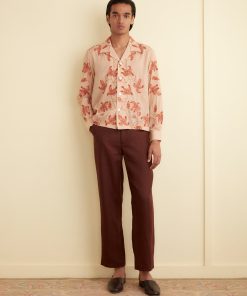 This shirt is inspired by an embroidered tablecloth from the midcentury. We reproduced the embroidery—a tonal pink and orange pattern of flowers and berries—on a slightly sheer cotton voile.