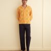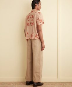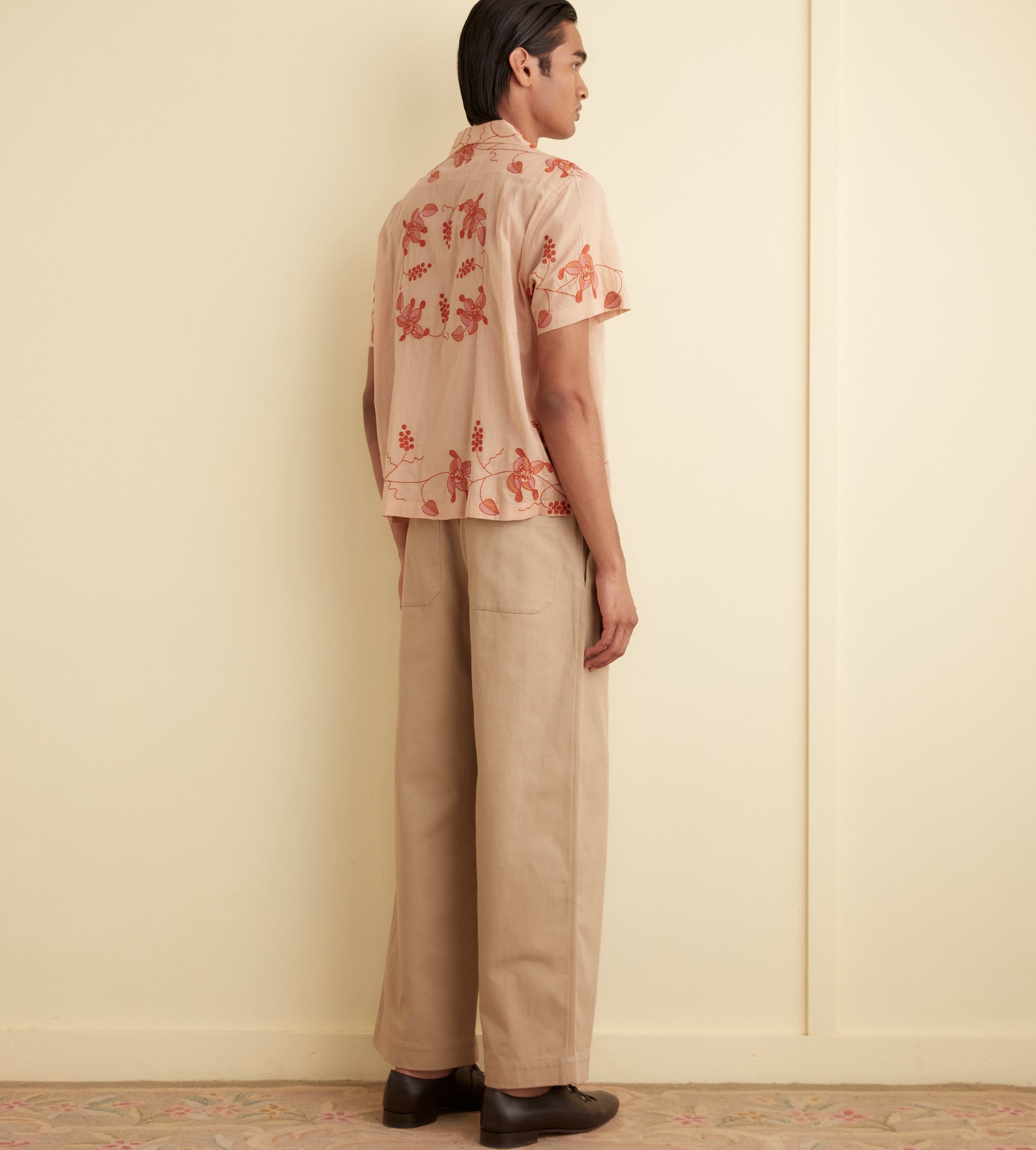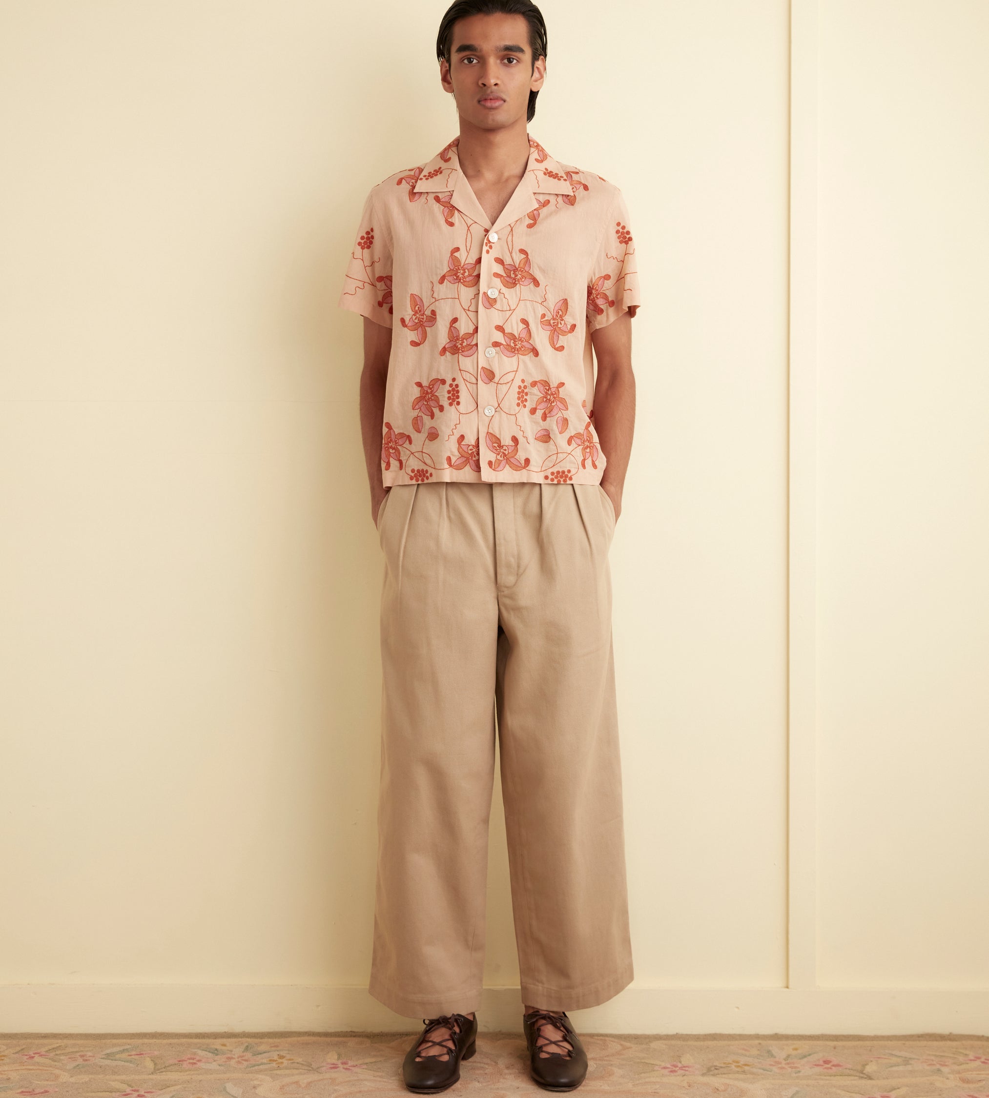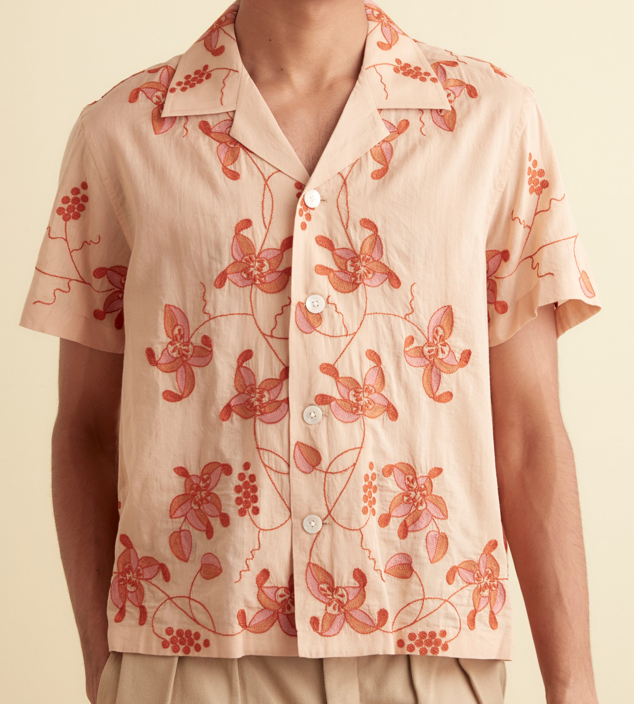 This shirt is inspired by an embroidered tablecloth from the midcentury. We reproduced the embroidery—a tonal pink and orange pattern of flowers and berries—on a slightly sheer cotton voile.