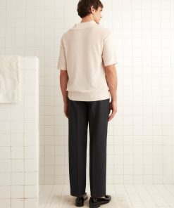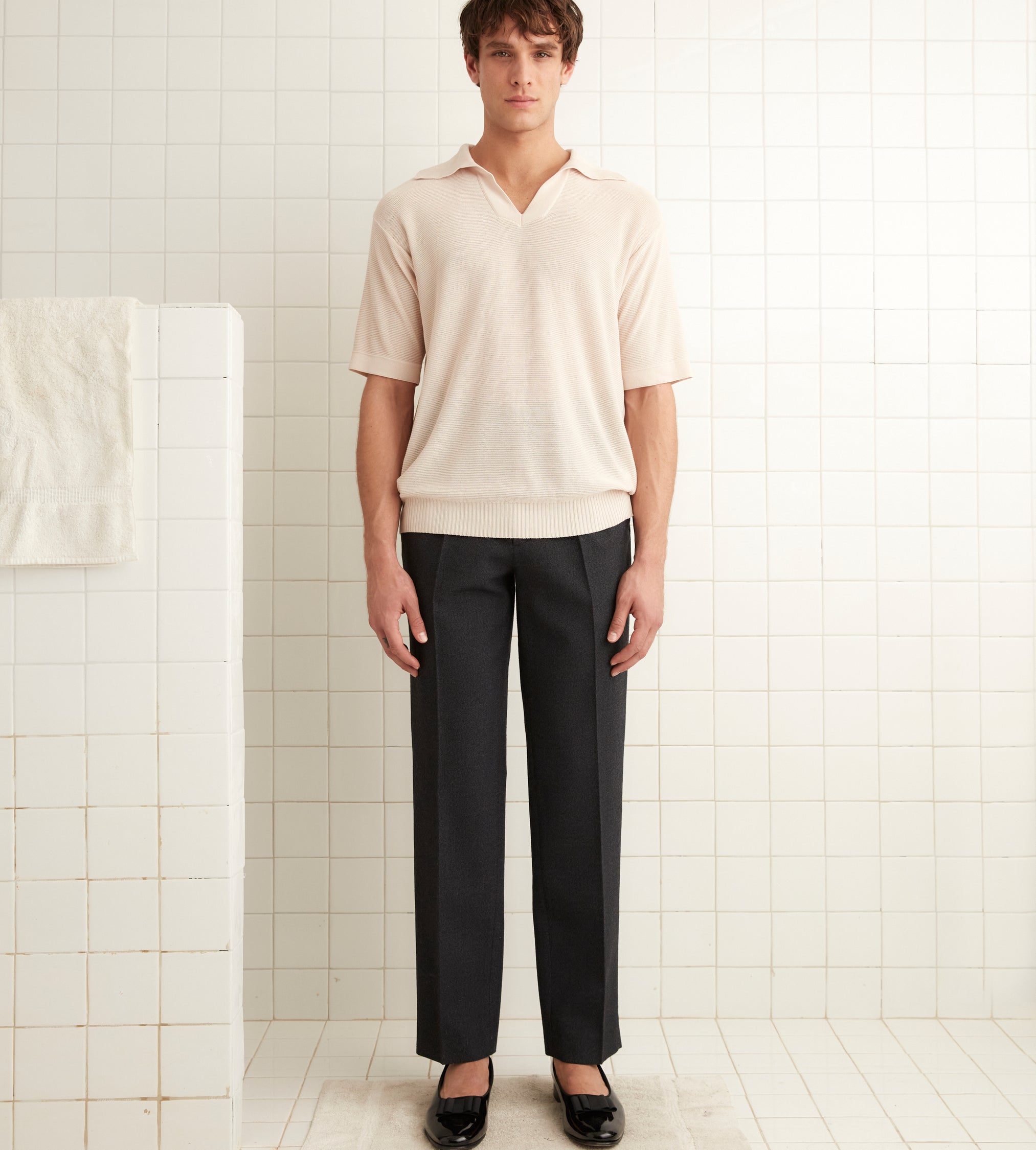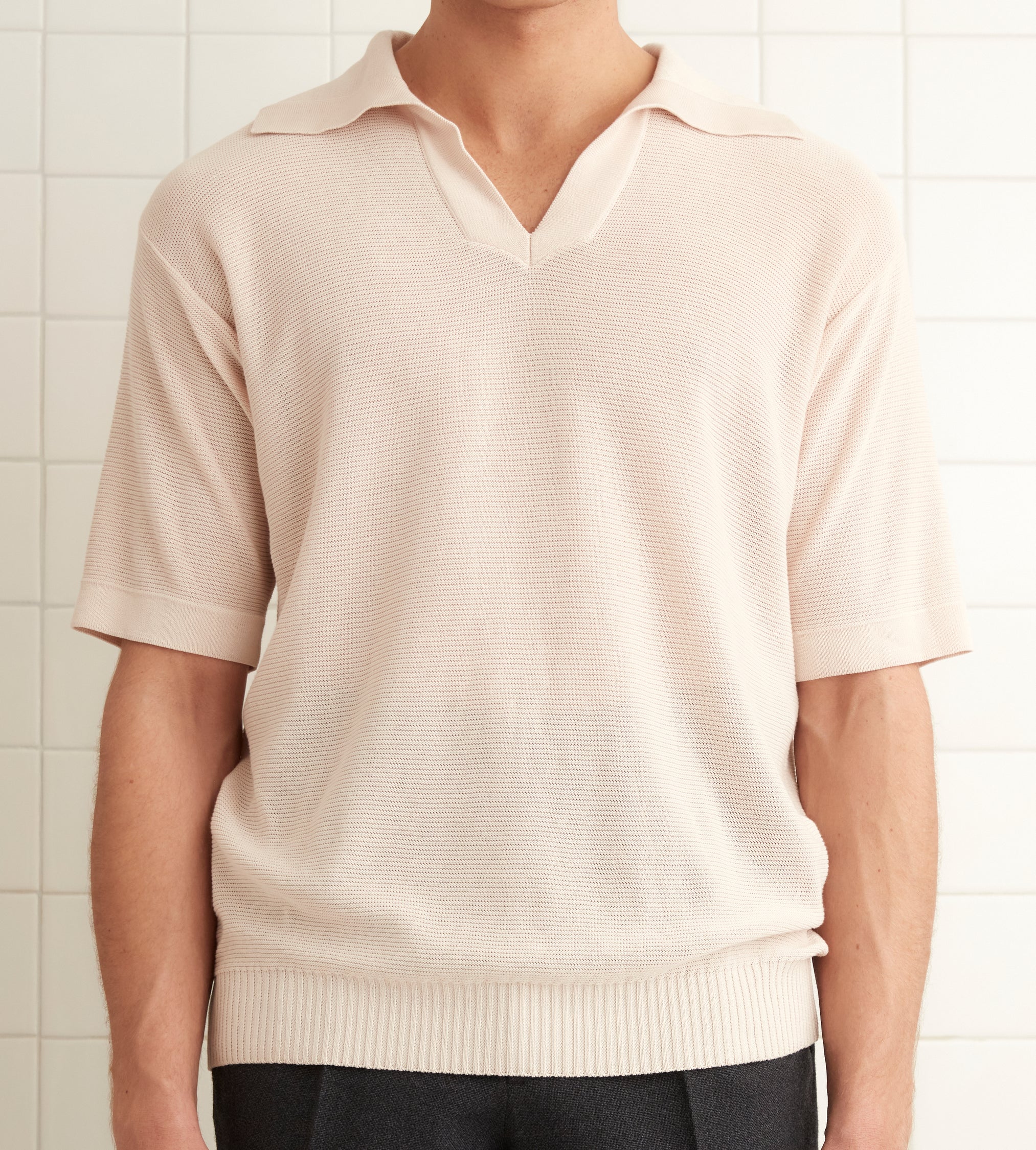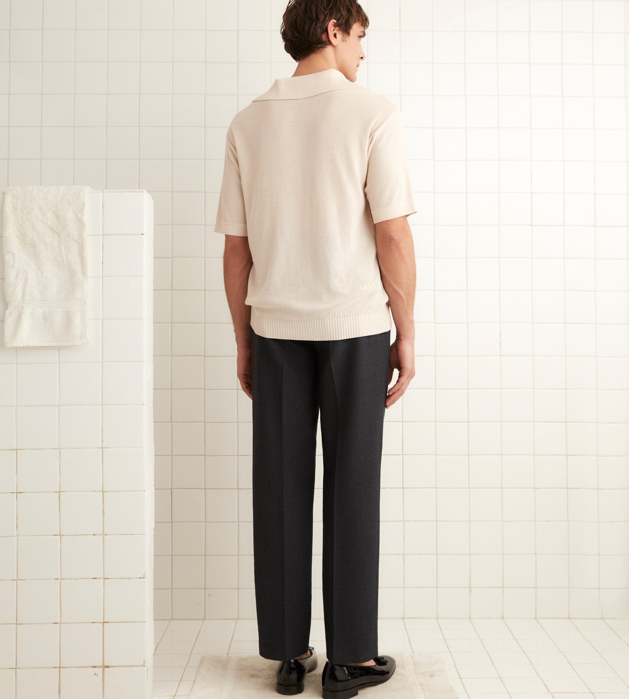 This piece is inspired by a polo from the 1970s. We imitated the boxy silhouette of the original for this shirt, which is knit from a light crepe yarn.
