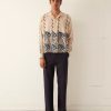 This shirt is inspired by deadstock yardage from the 1930s-1940s, which was printed with this yellow, white, and green pattern of overlapping dots. We reproduced the fabric for this style.