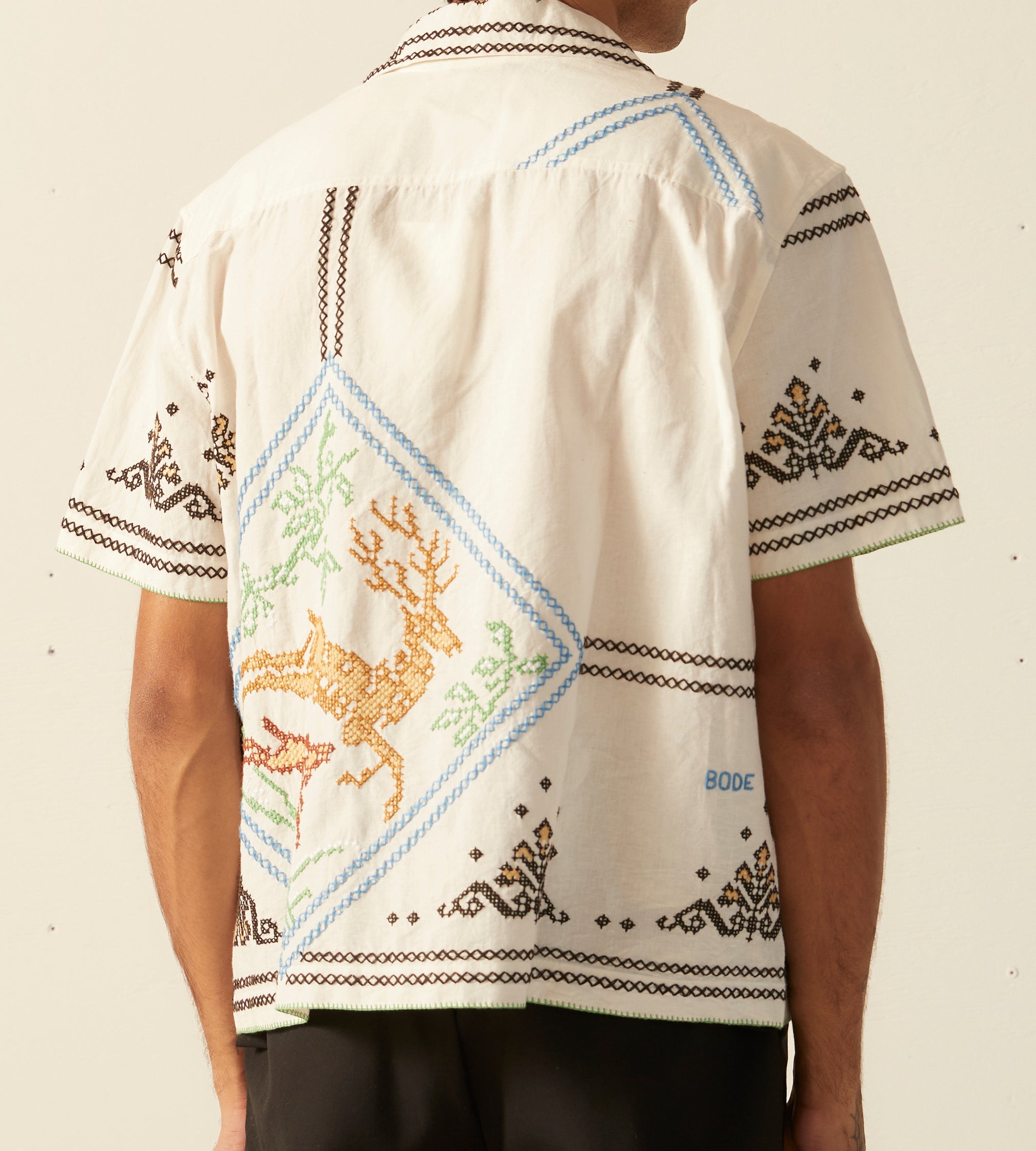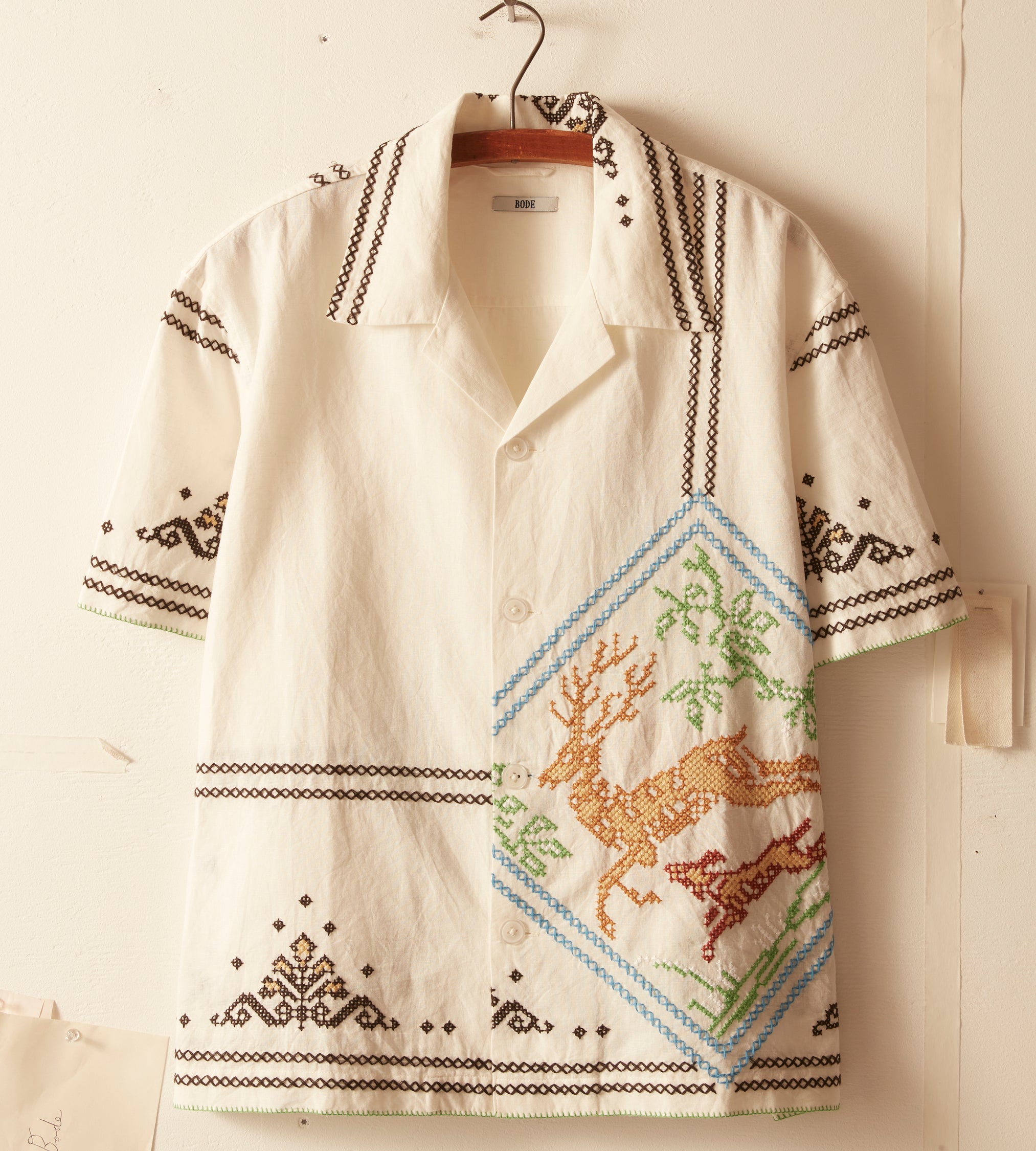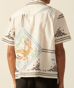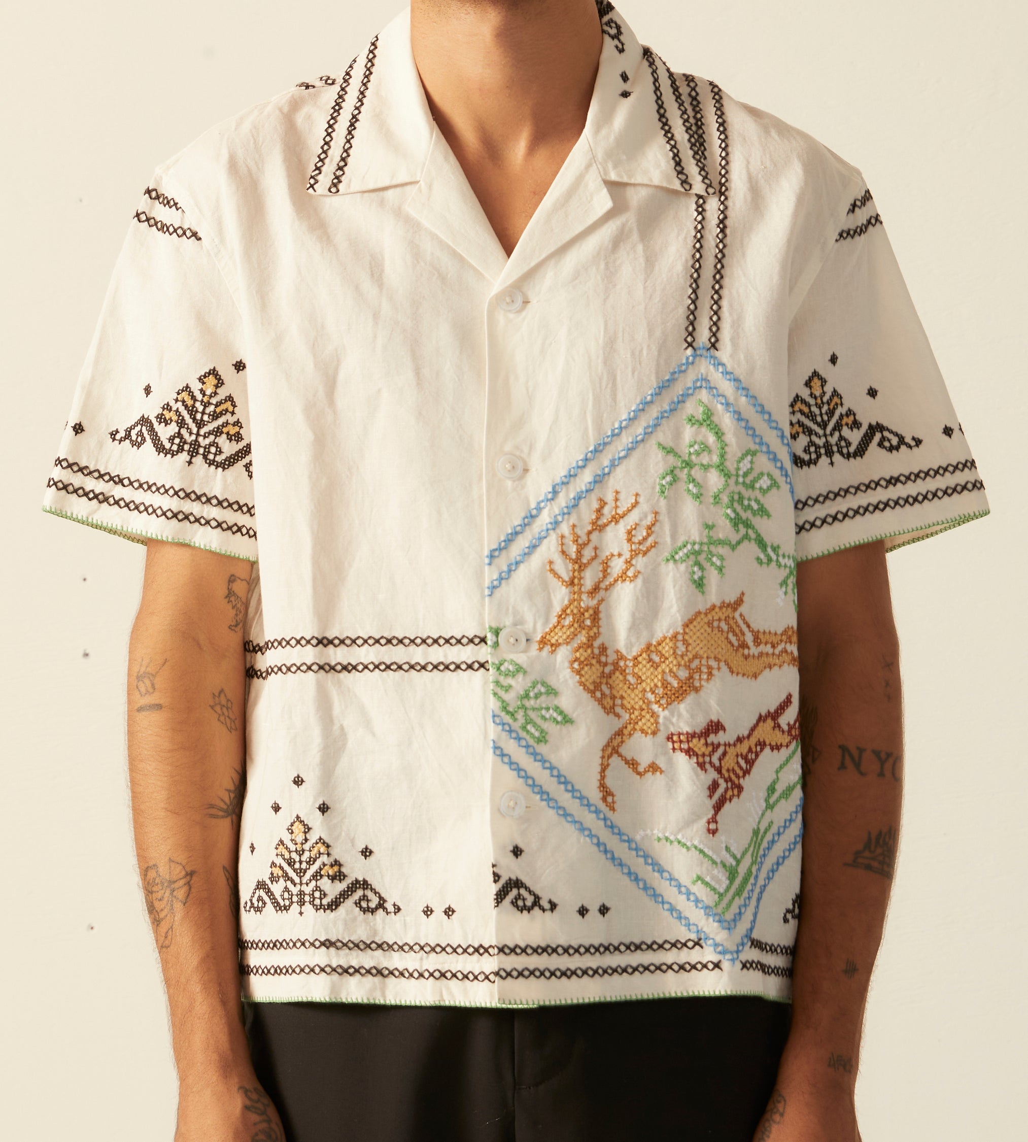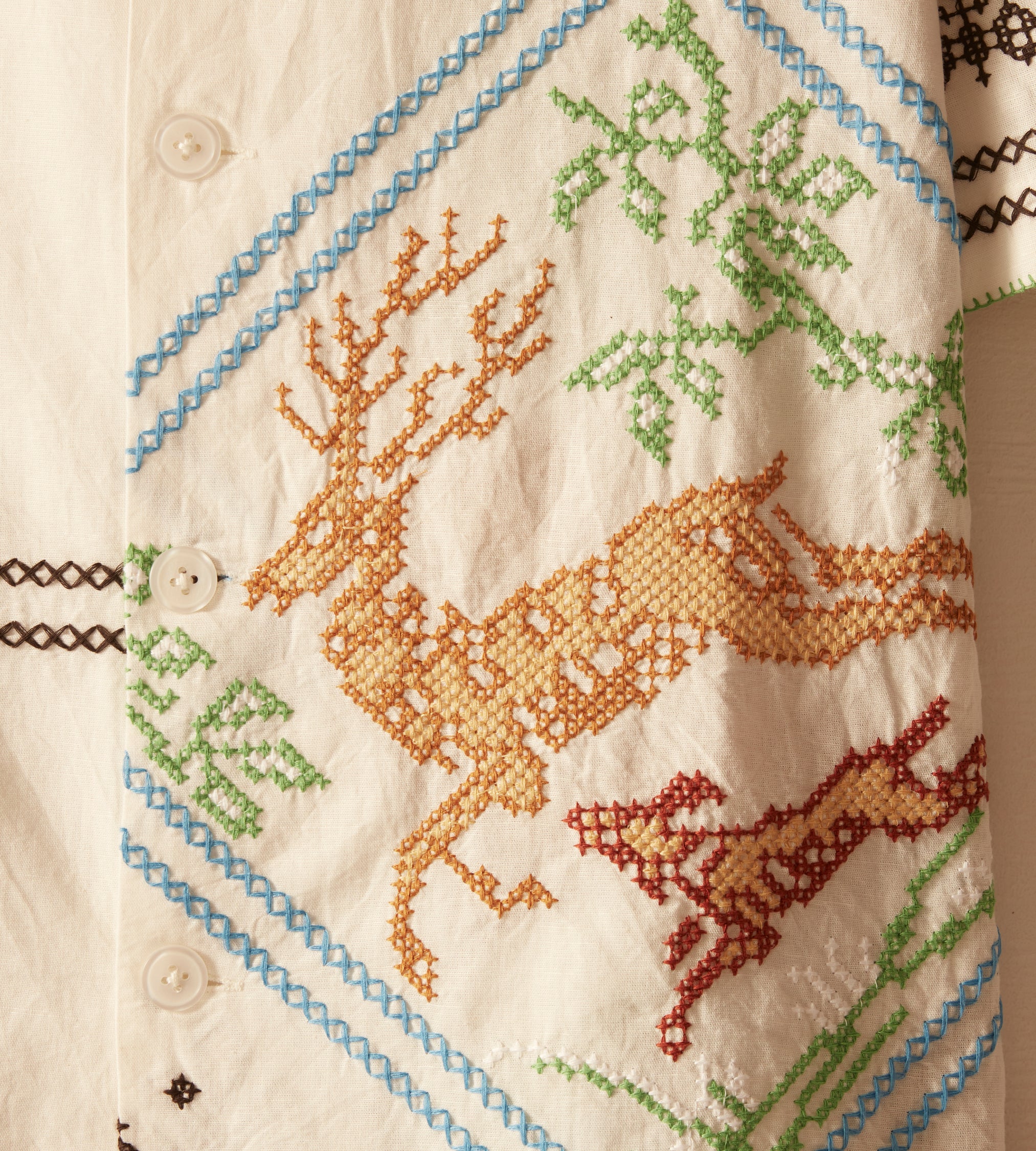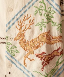This shirt is inspired by a 1920s-1940s tablecloth. The shirt features a faithful reproduction of a cross stitch embroidered motif of a buck being chased down by a hunting dog found on the original tablecloth.