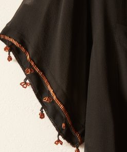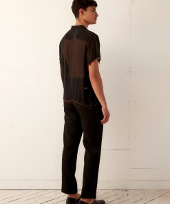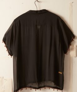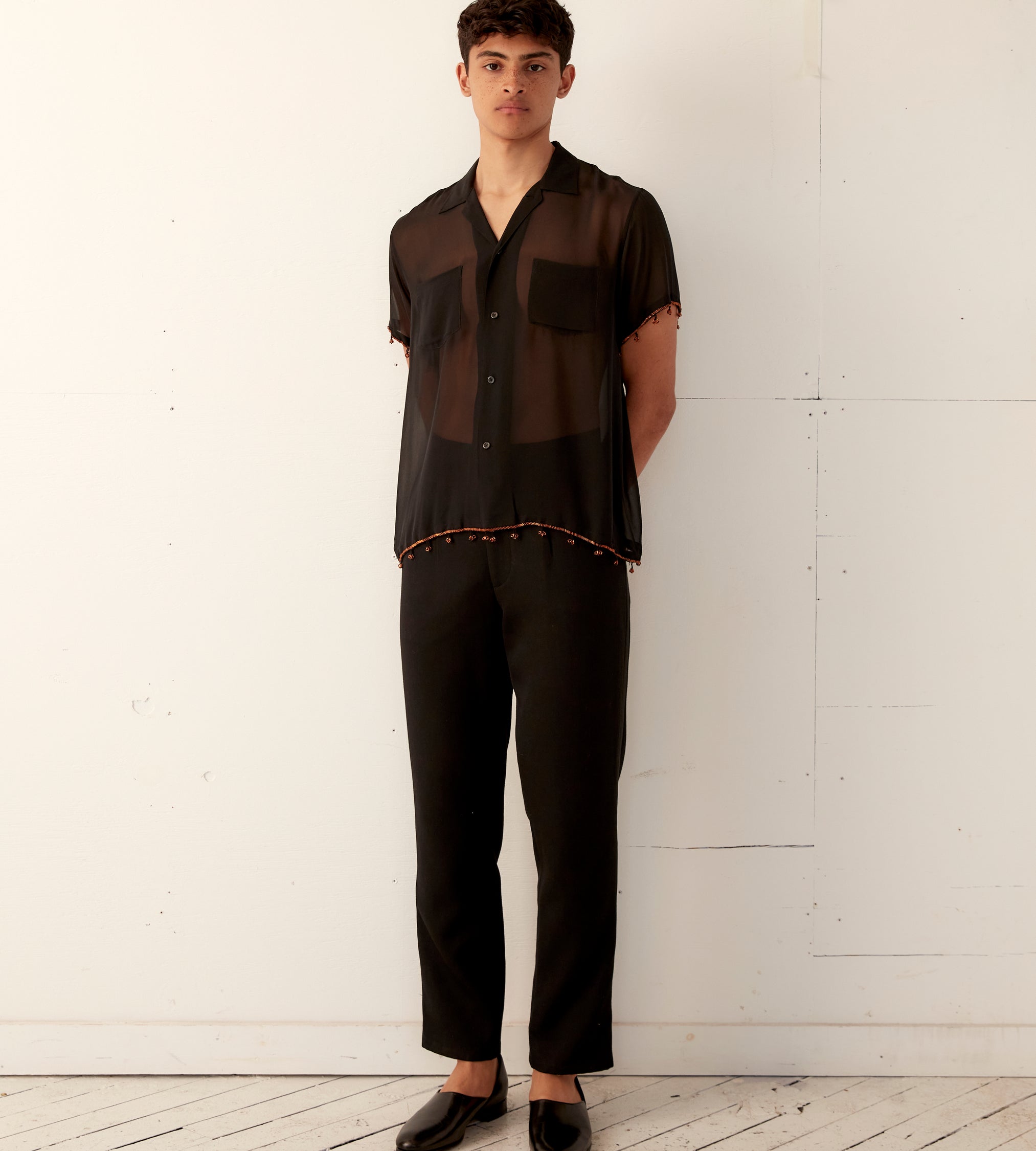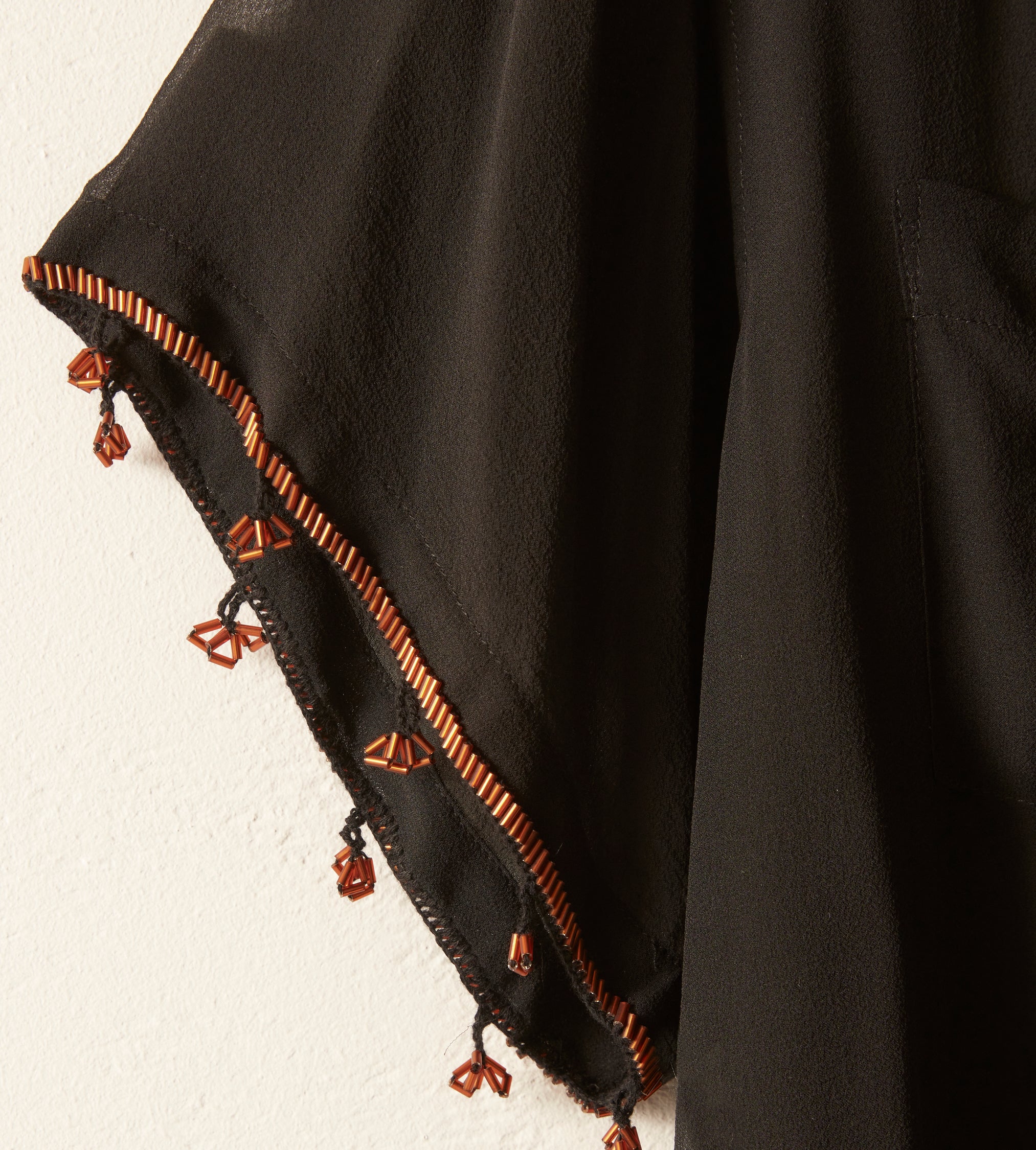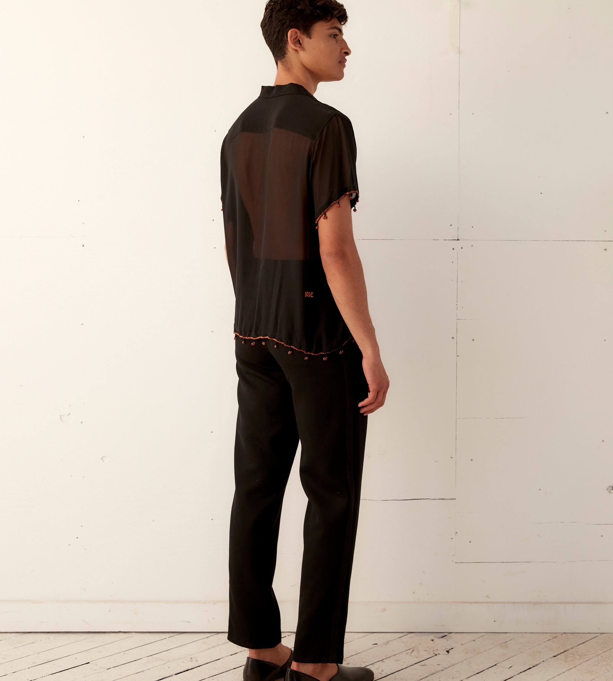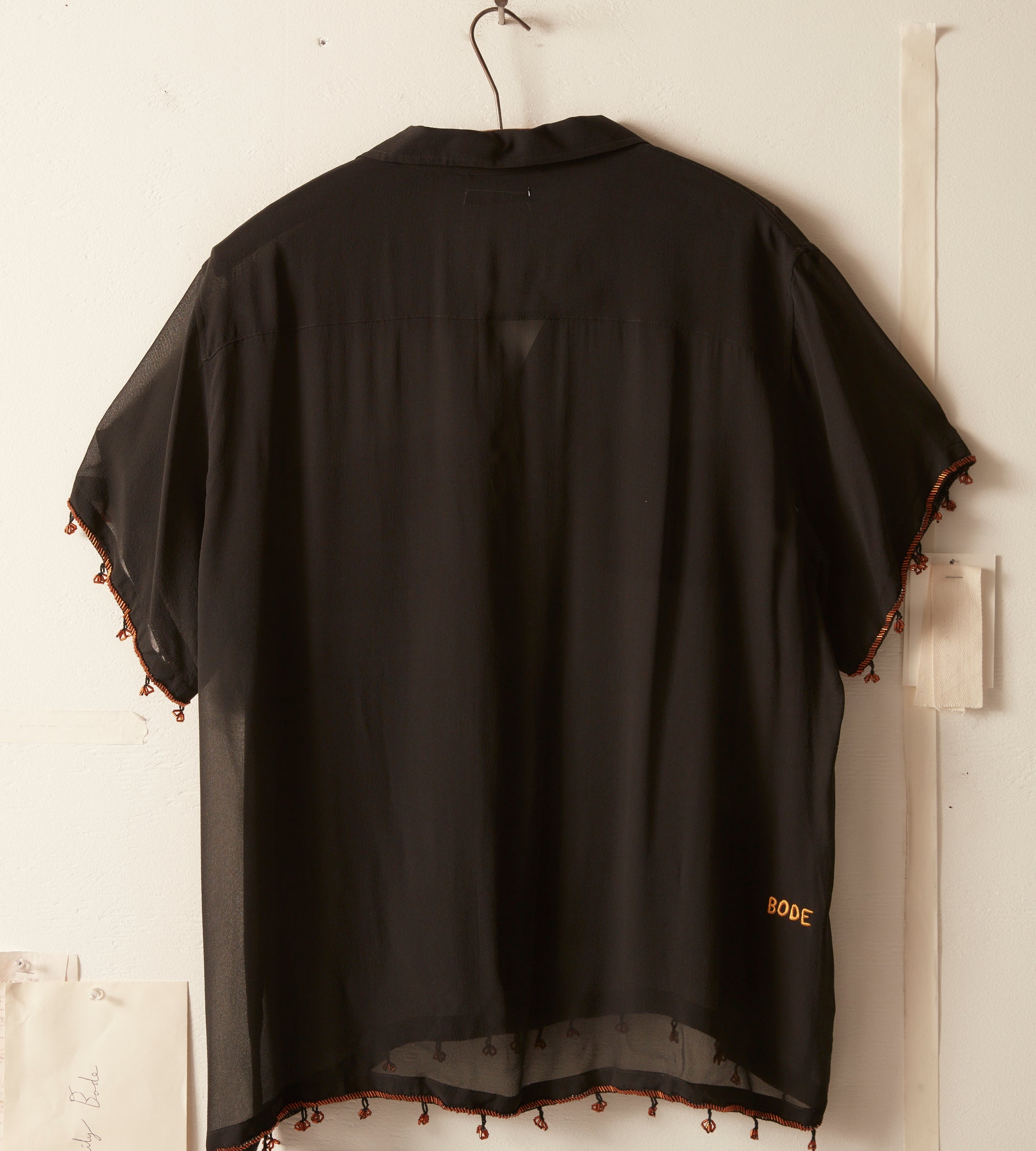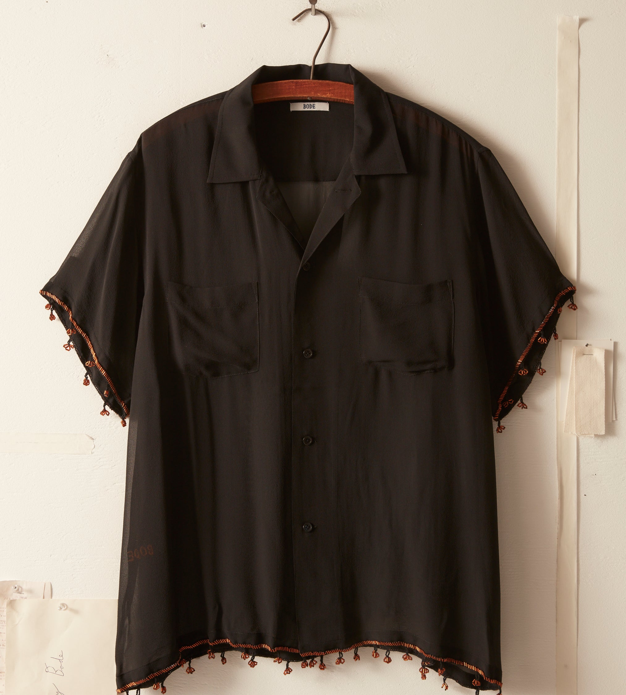 This shirt is inspired by a beaded scarf from the 1920s-1930s. The original trim—made from hand-threaded bugle beads—has been replicated here and applied to the sleeves and hem.