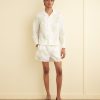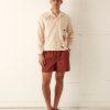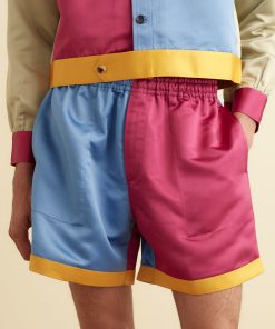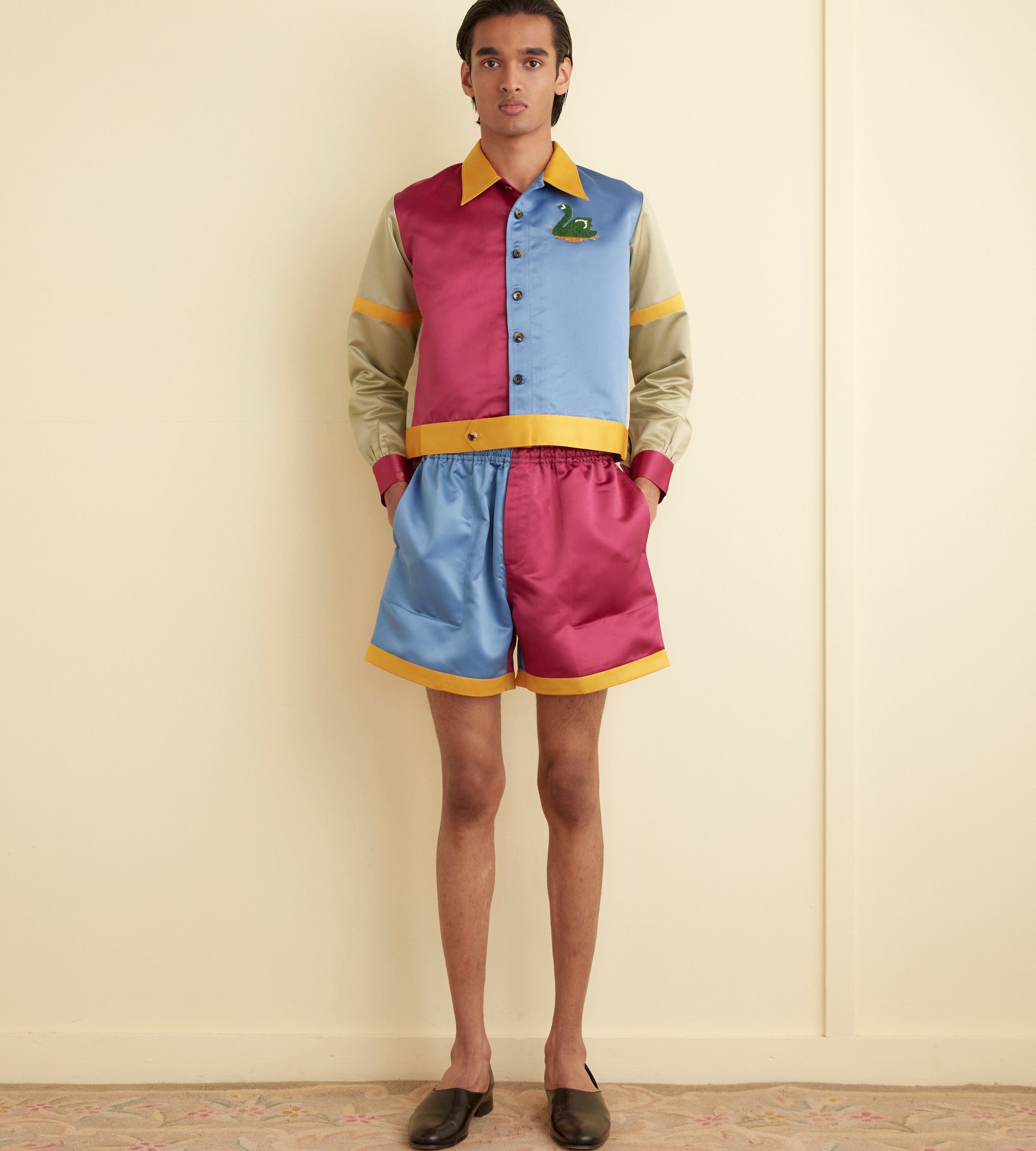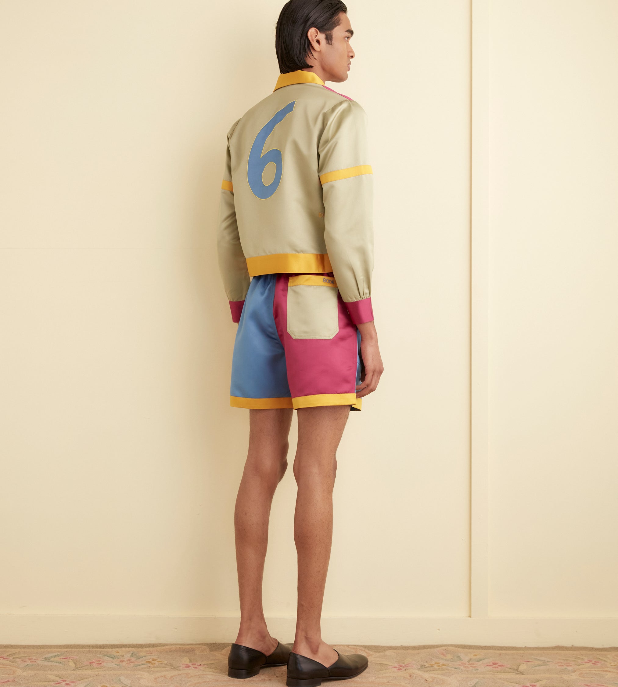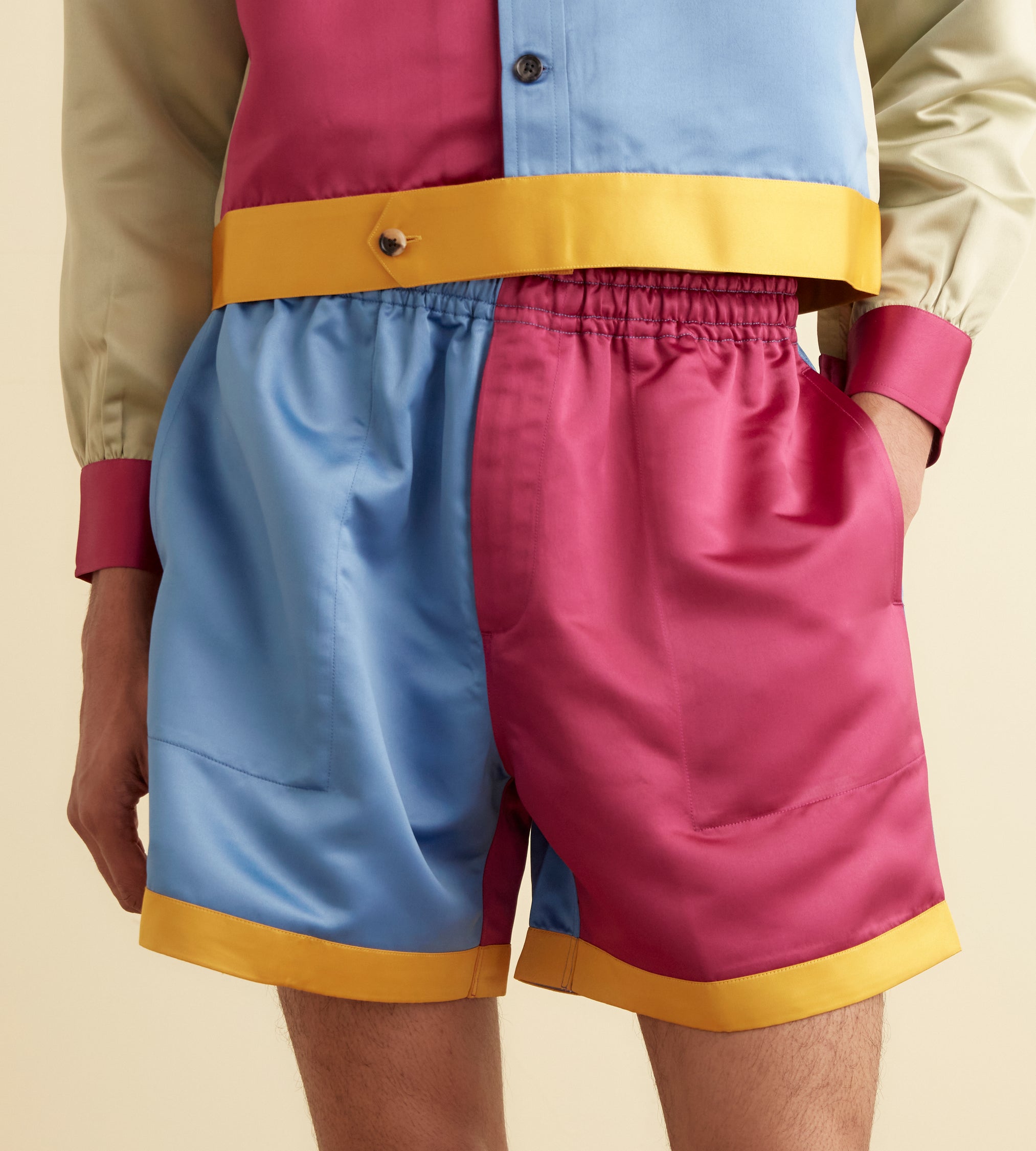 These shorts are inspired by a jockey jacket from the 1950s, which was colorblocked with sections of pink, blue, and gold. We reproduced the colorblocking for this style, which has a short inseam and a wide leg opening.