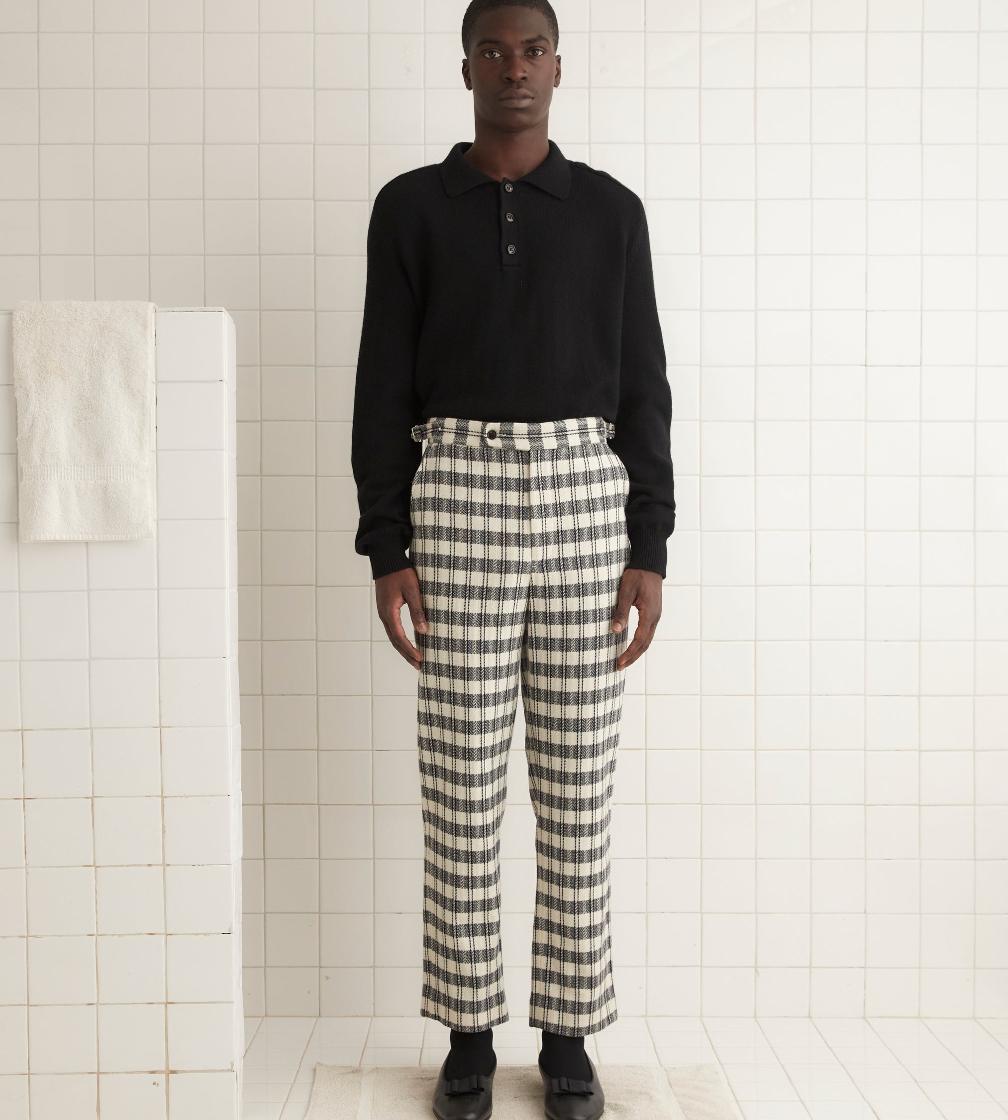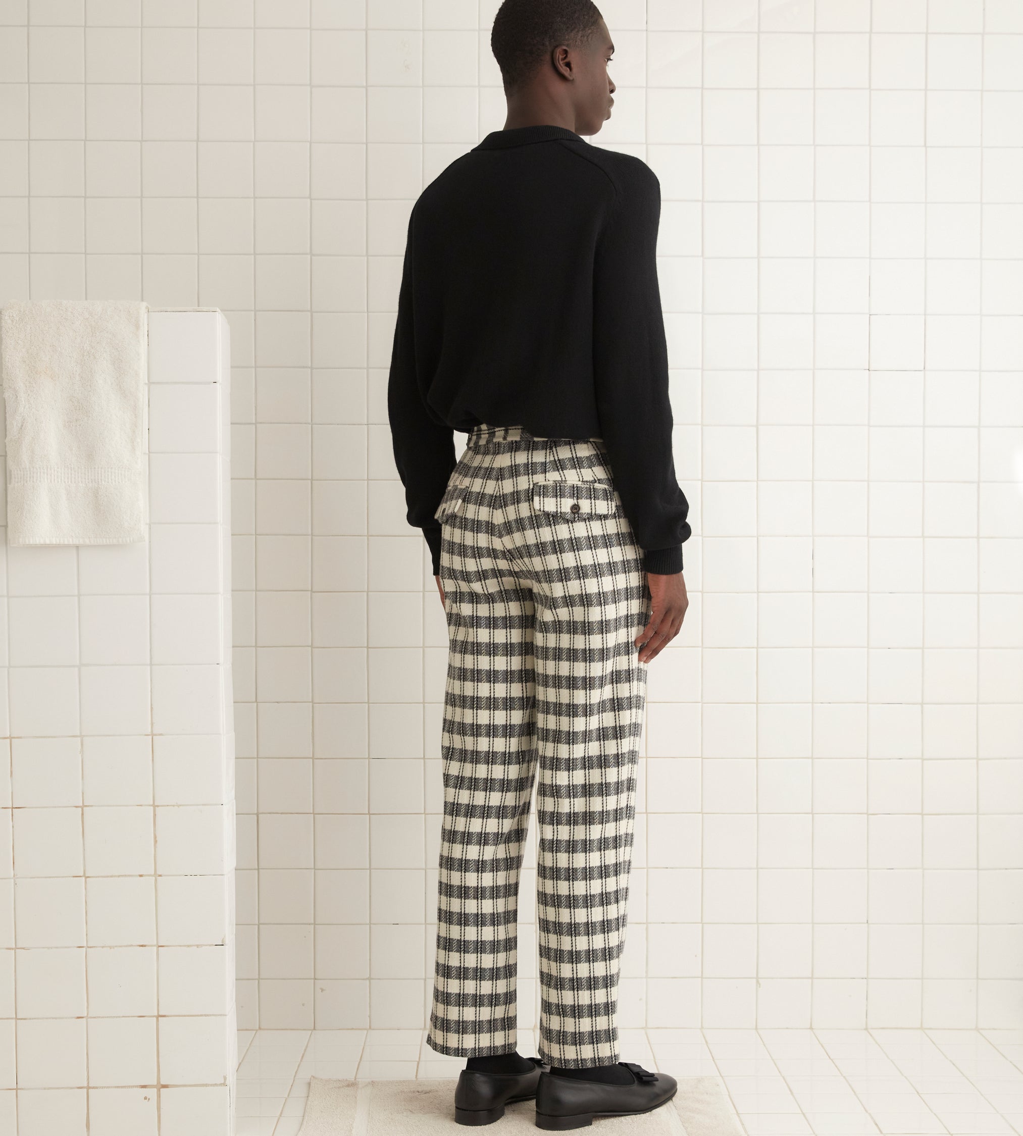 These trousers are inspired by midcentury suiting. Made from a herringbone twill check, they have a mid-rise and a straight leg.