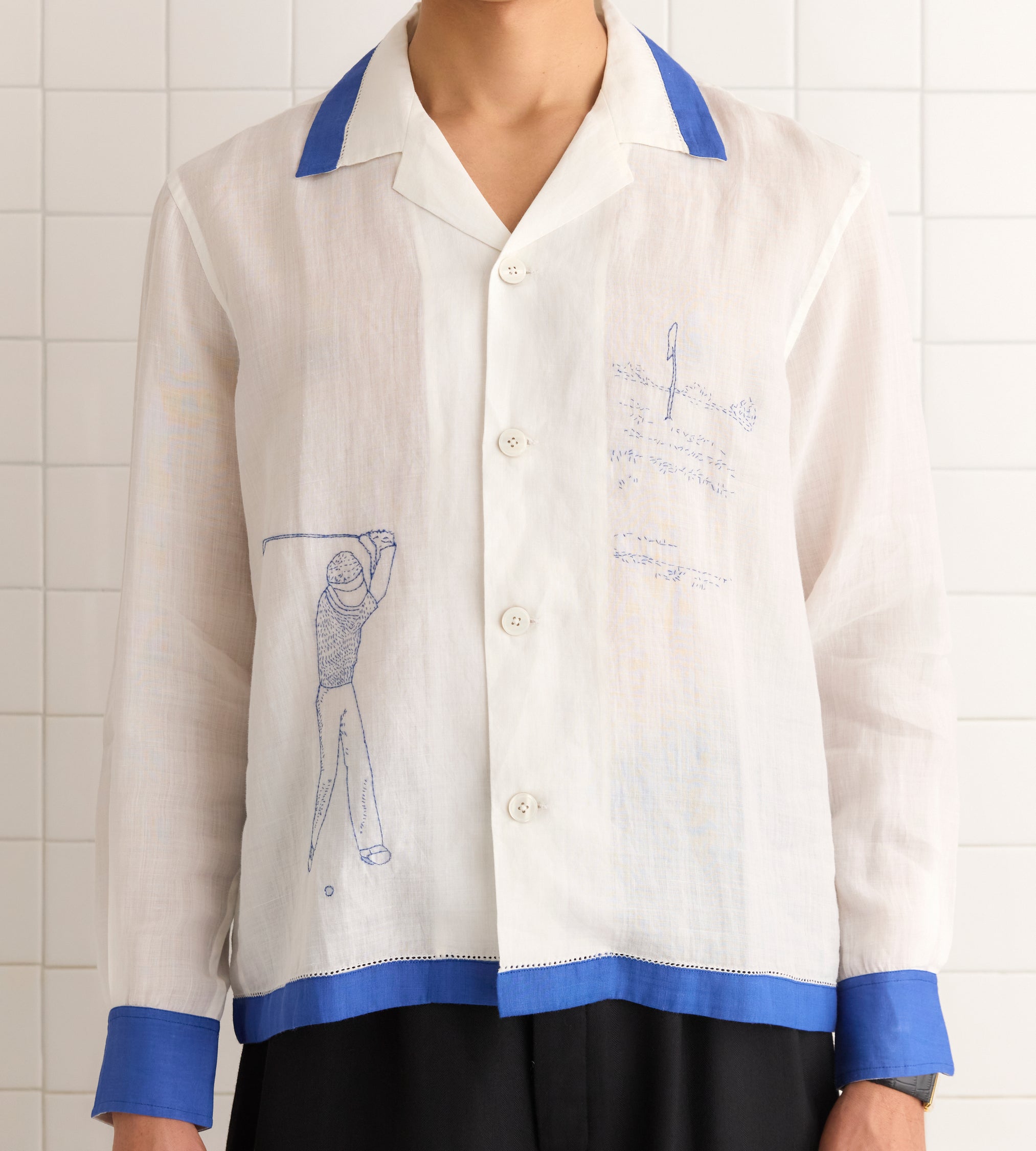 BODE Men’s Ready To Wear Club Champion Long Sleeve Shirt | White & Blue