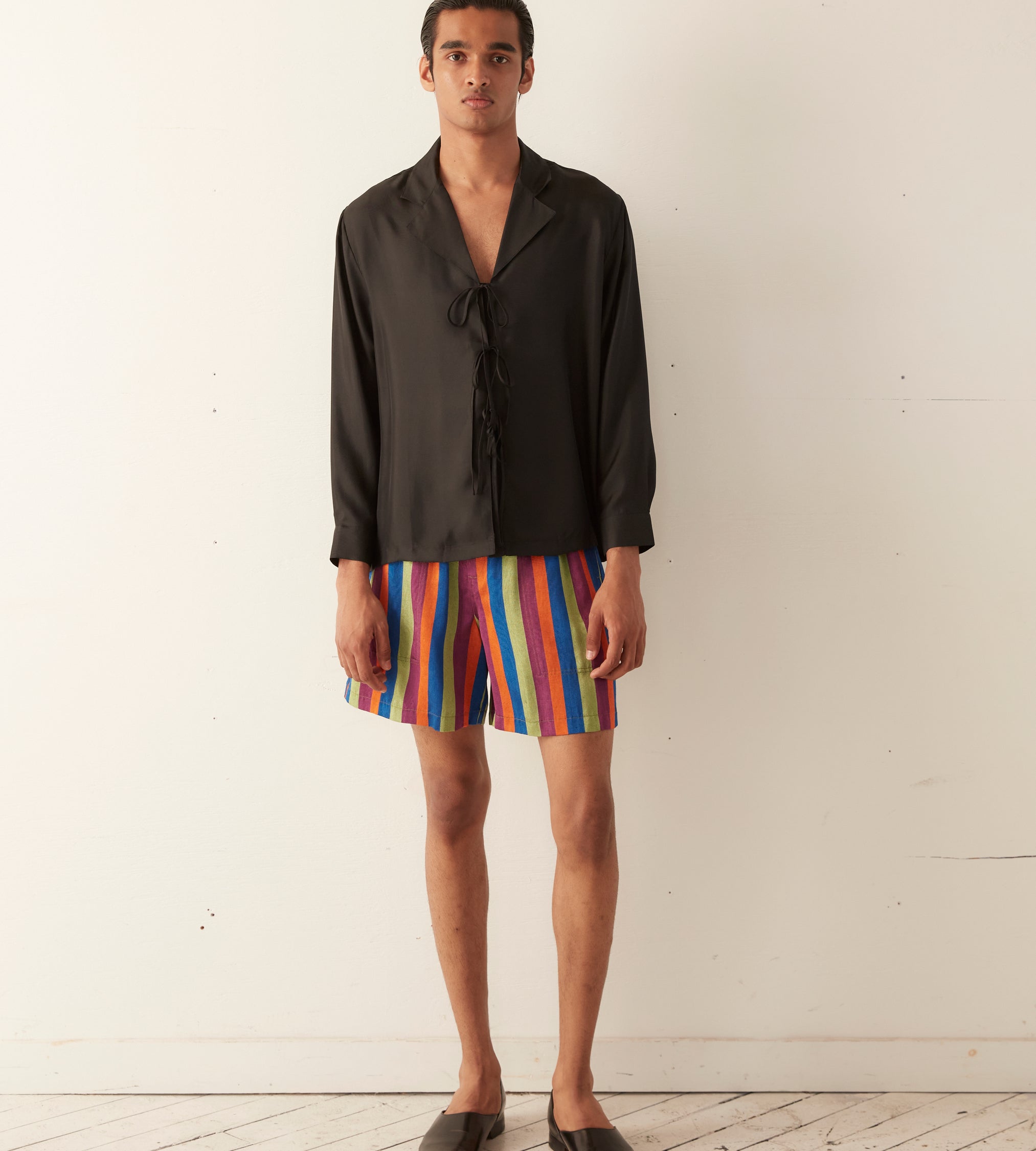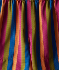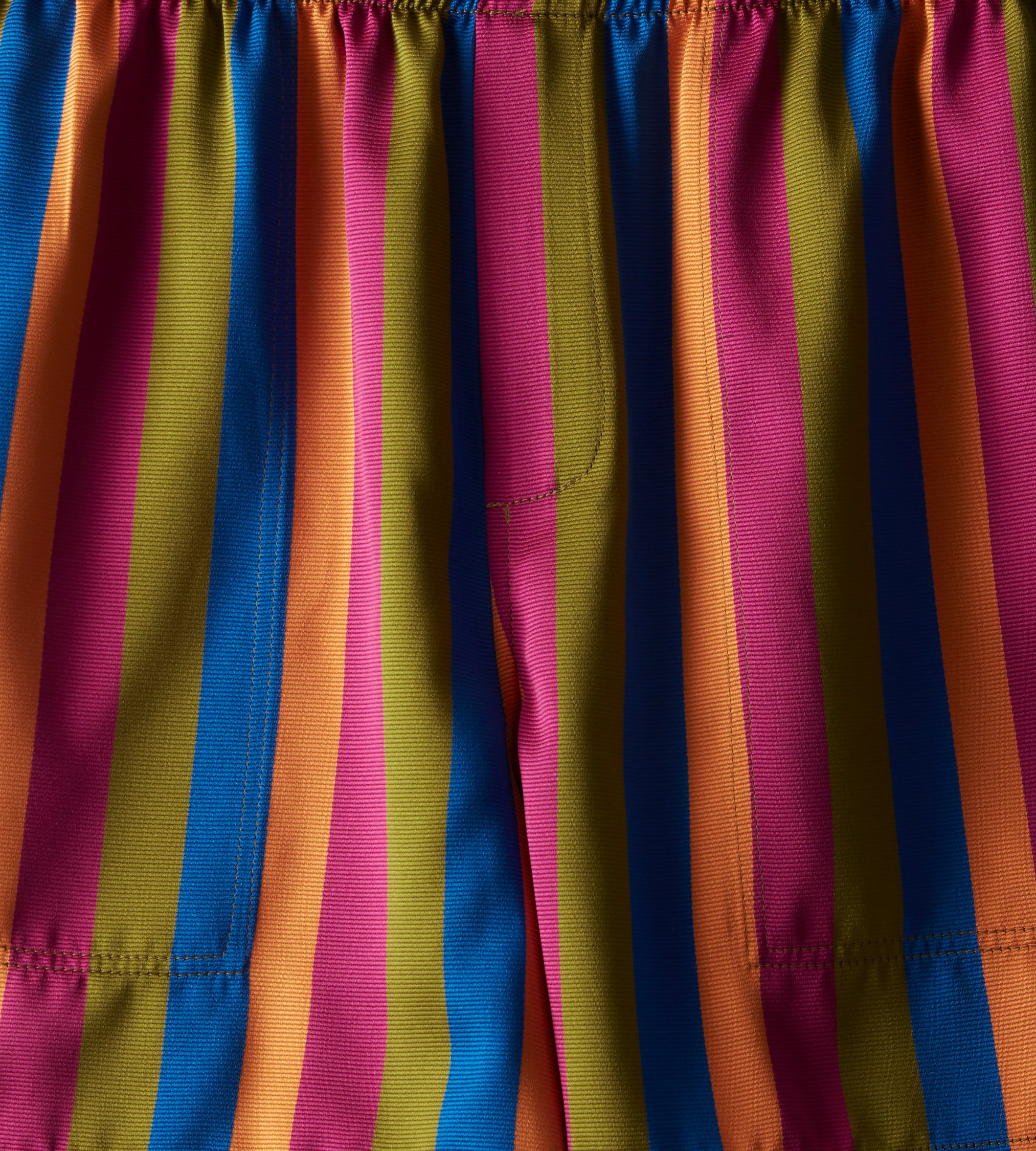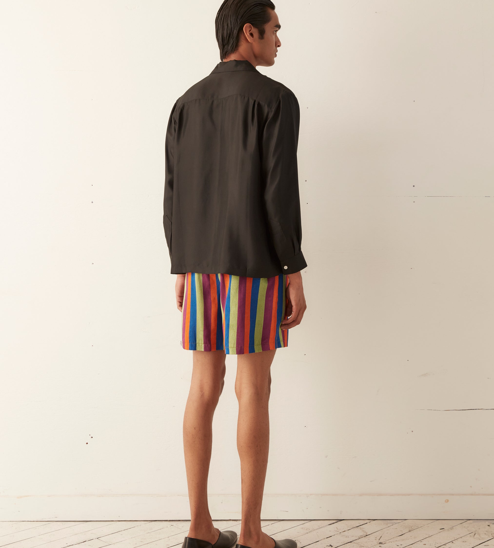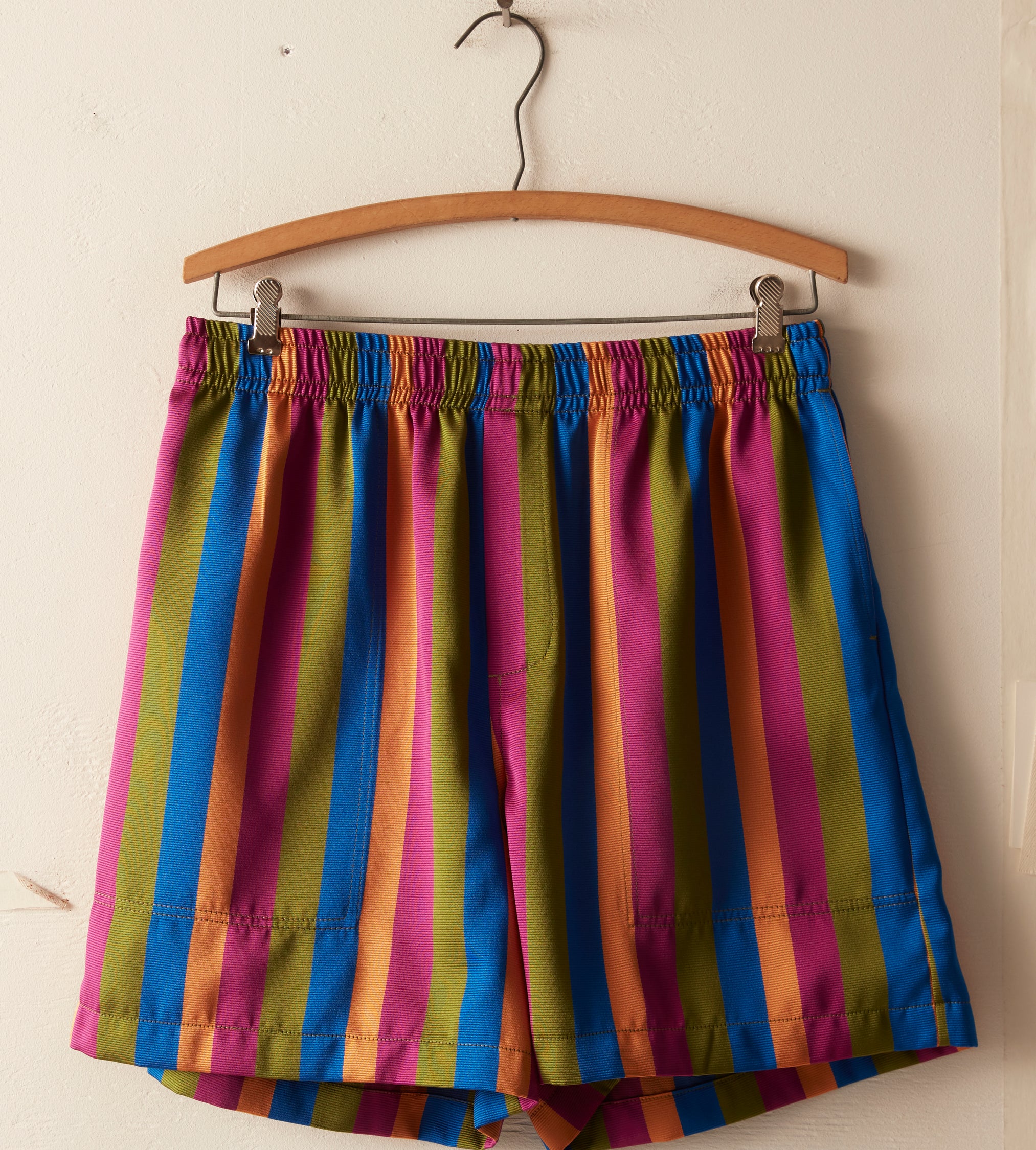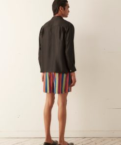 These shorts are cut to mimic traditional British Columbia rugby shorts and are inspired by Kutnu fabric. Kutnu is historically woven in Gaziantep in Southern Turkey. Rendered in satin with silk warp and cotton weft thread, the striped textile is known for its distinctive shimmer.