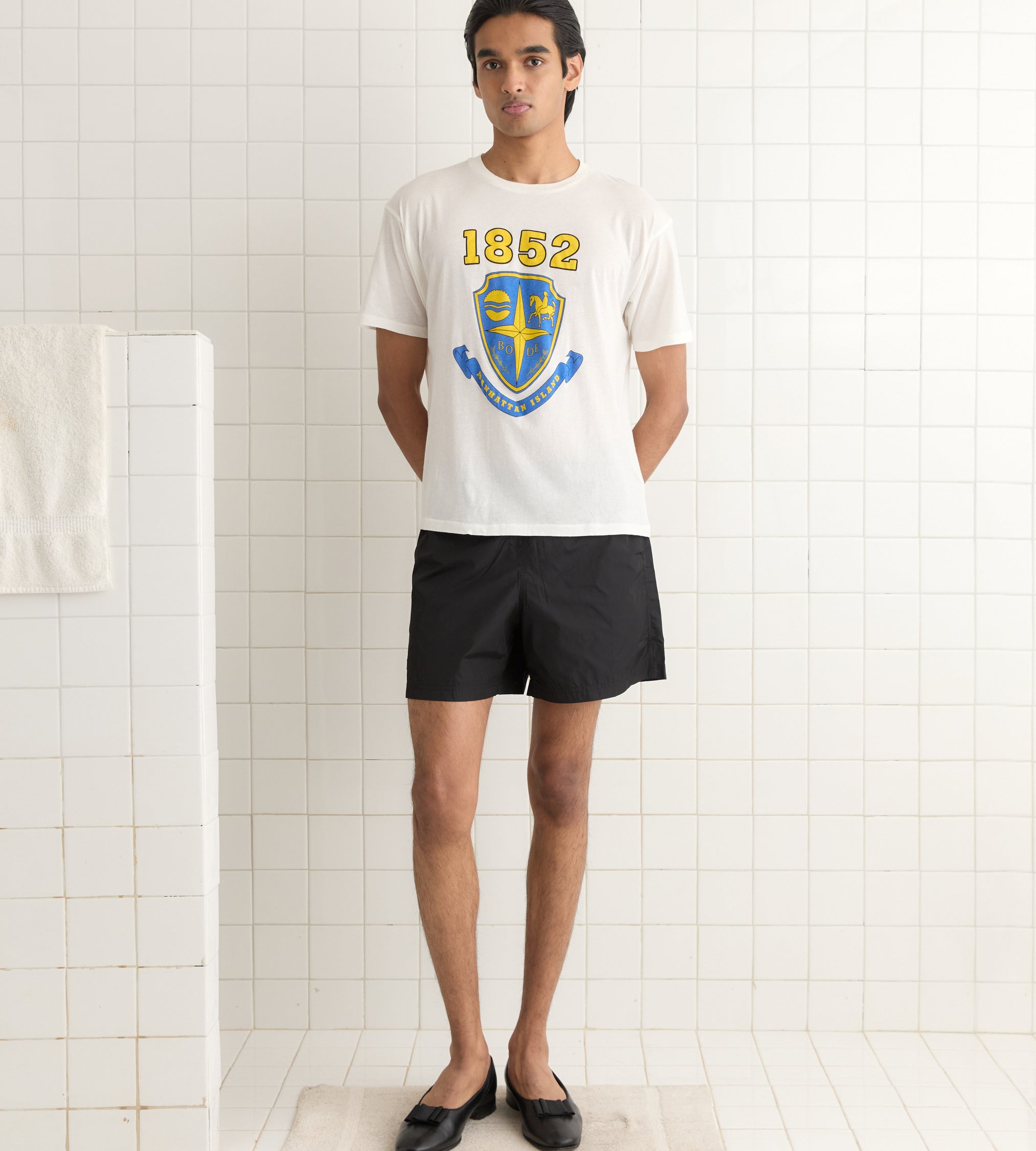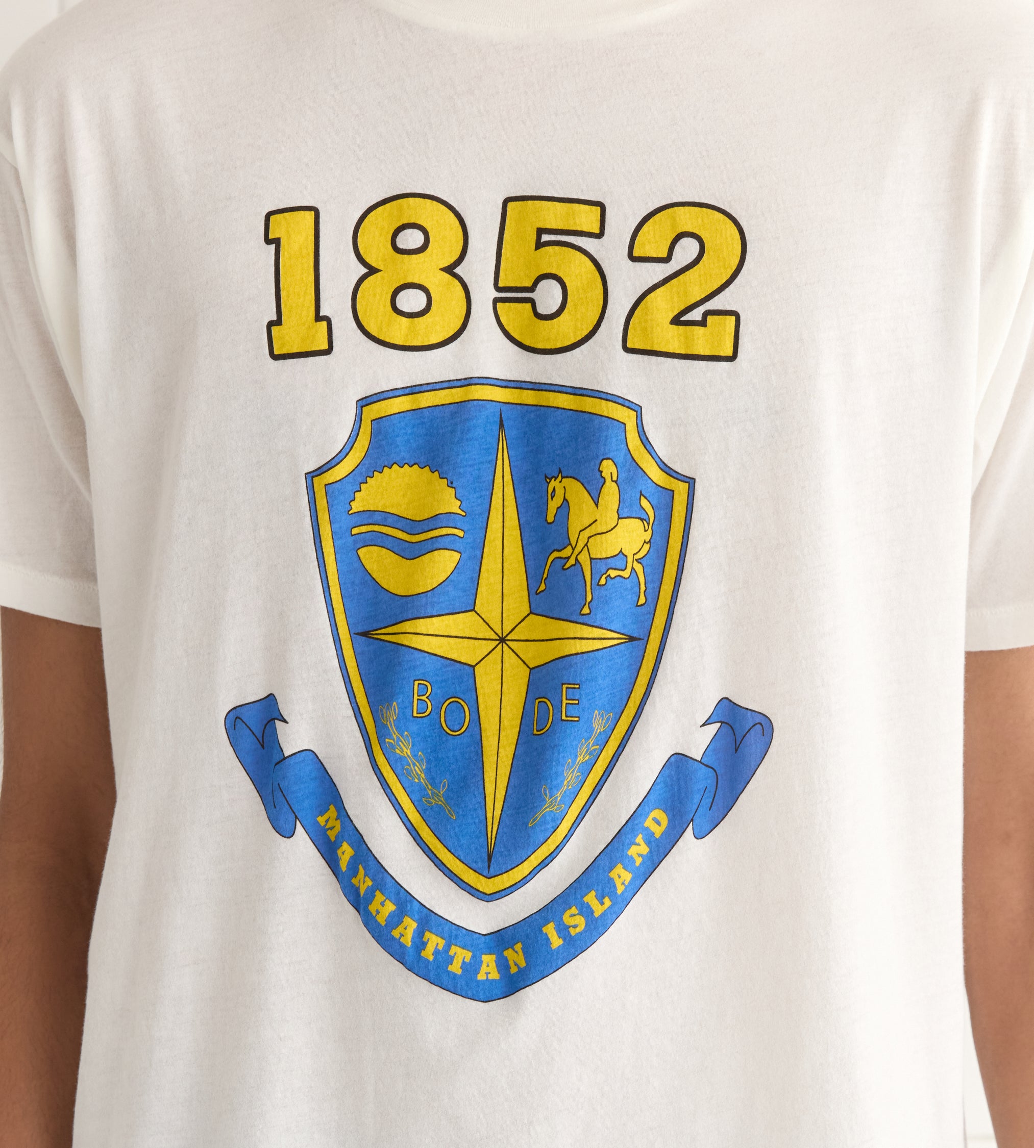 This shirt is inspired by a high school senior’s tee from the 1990s. We reimagined the crest and the lightweight, slightly sheer cotton for this style. The crest reads “1852,” the year of an infamous Harvard-Yale regatta and features a “Manhattan Island” banner underneath.