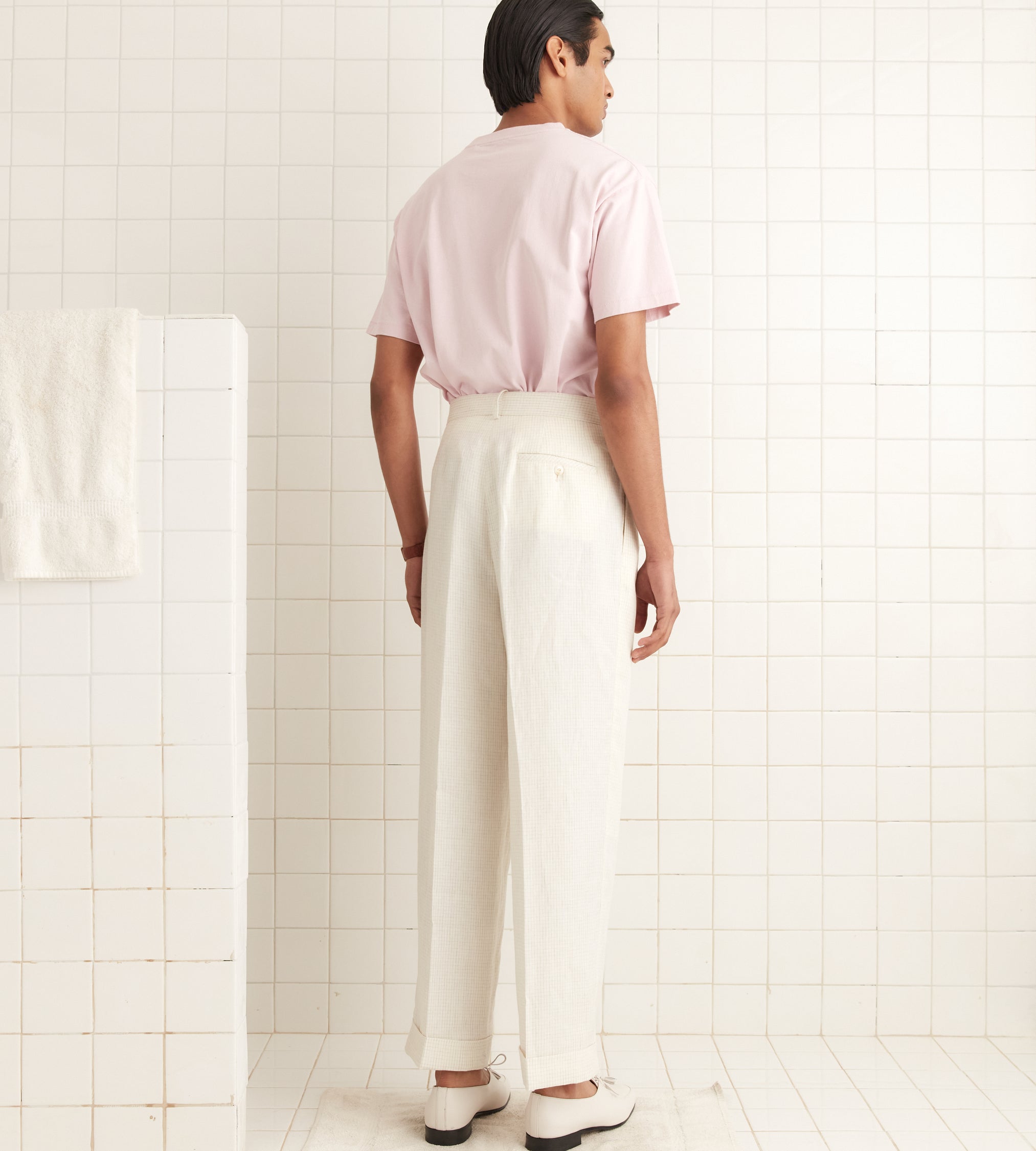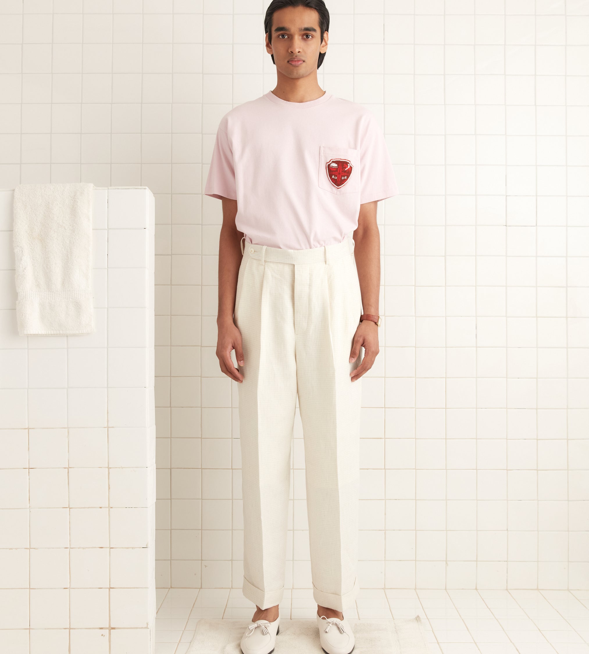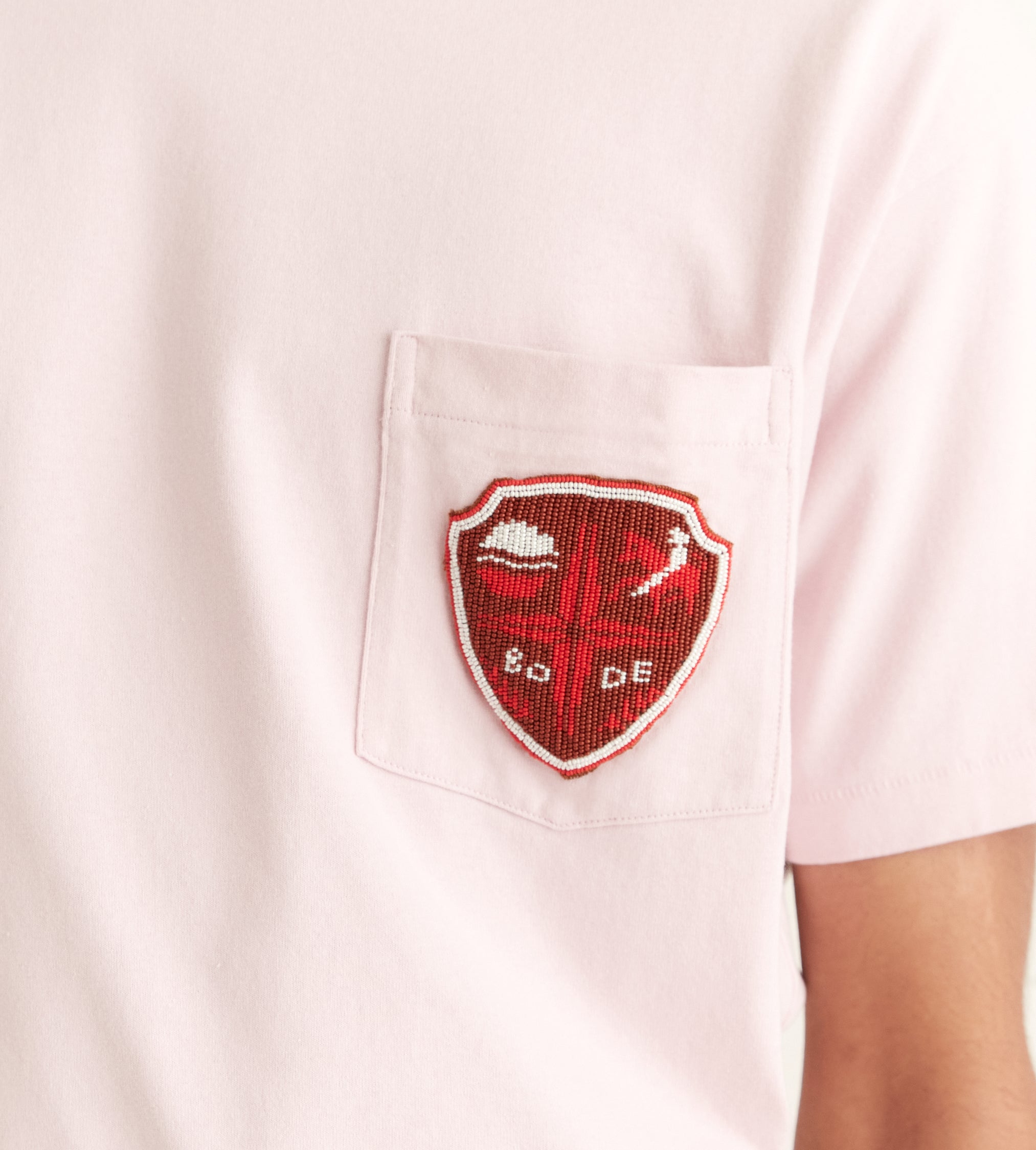 This shirt is inspired by a high school senior’s tee from the 1990s. We reimagined the crest in red and brown beadwork for this style.