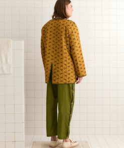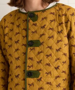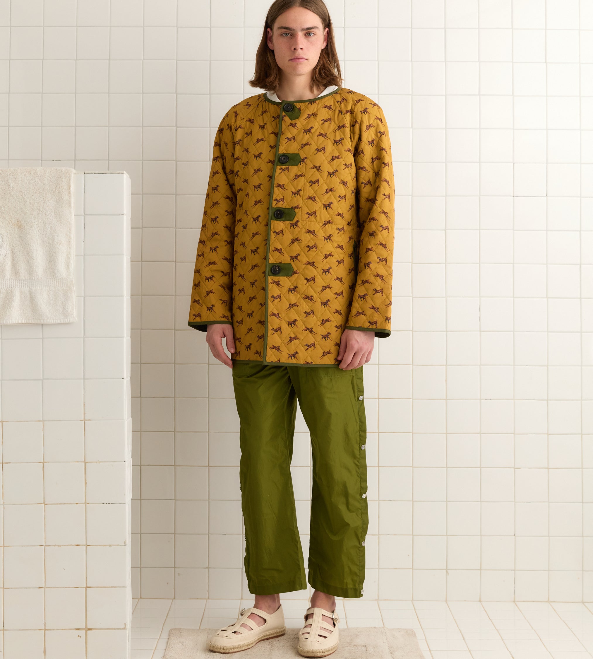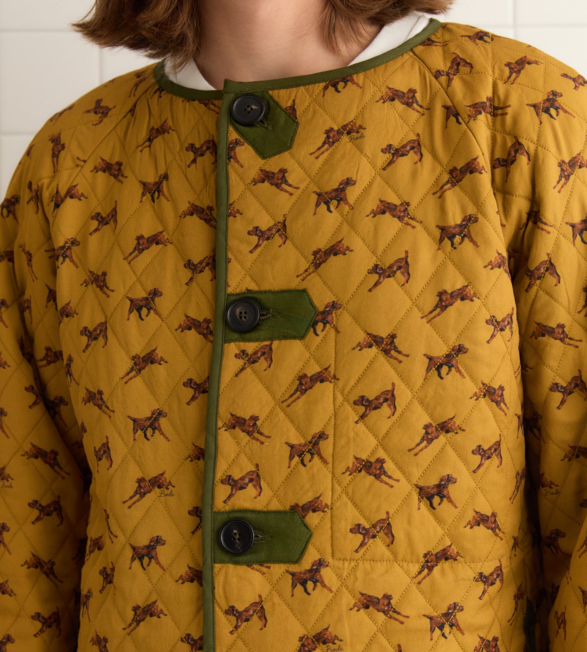 This coat is inspired by a quilted vest from the 1960s-1970s. Made from fabric with an illustrated dog motif, it features a knit collar and green accents.
