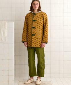 This coat is inspired by a quilted vest from the 1960s-1970s. Made from fabric with an illustrated dog motif, it features a knit collar and green accents.