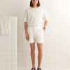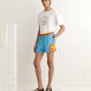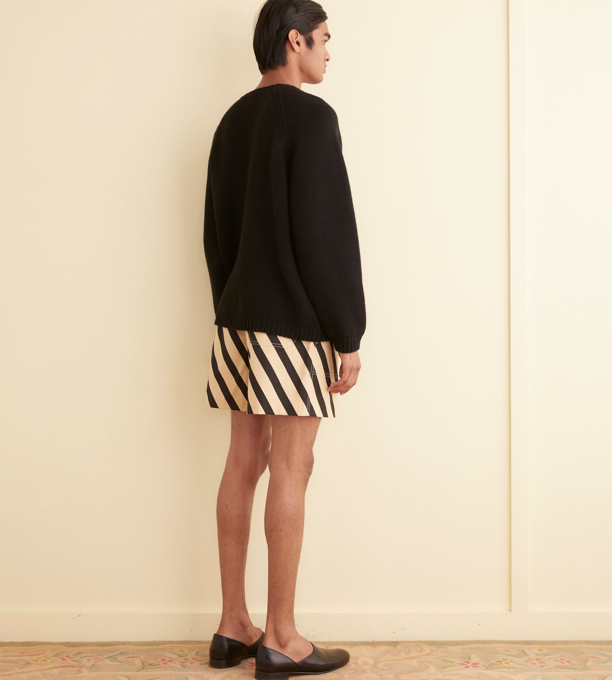 These shorts are inspired by a striped costume hat from the early 20th century. We reproduced the pattern and hand-beaded lettering for this style. The shorts feature a beaded “Bode” on the front left hem.