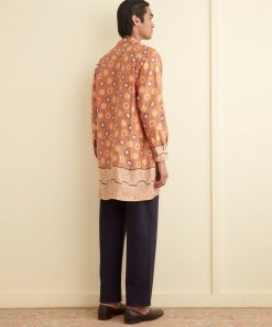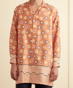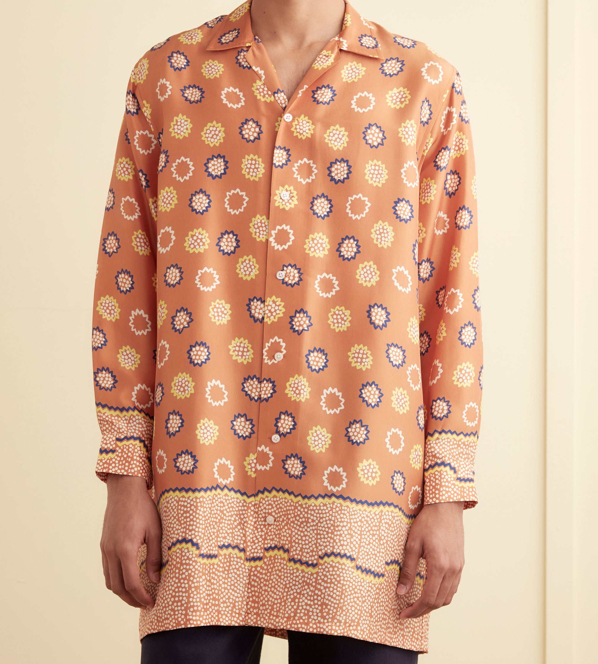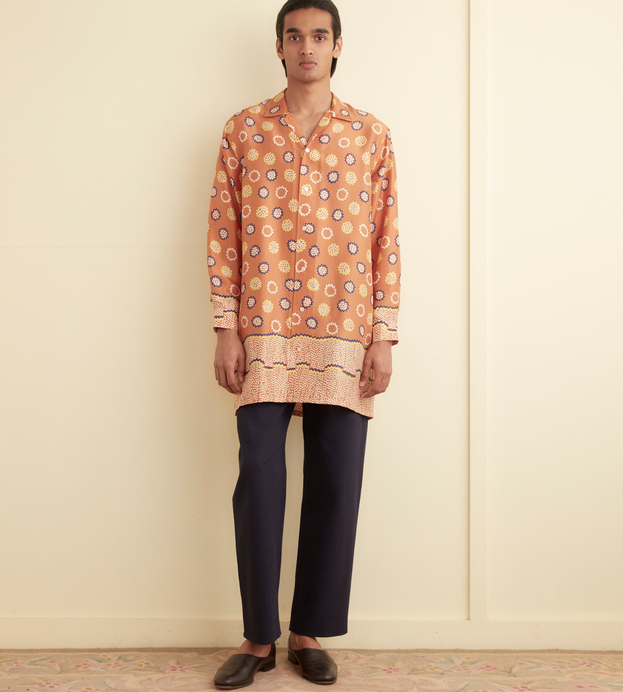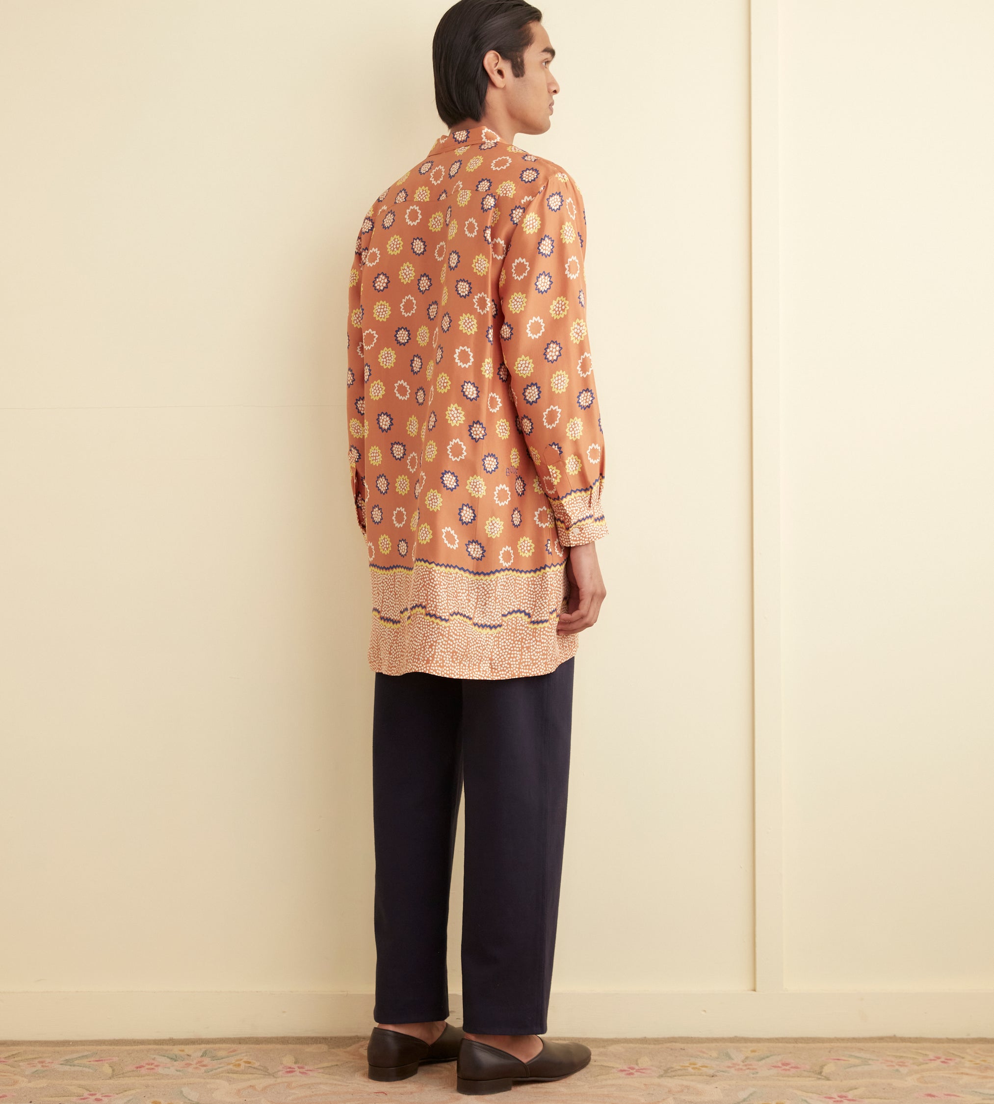 This tunic is inspired by a 1930s women’s dress. The original printed geometric pattern and the thick border were faithfully reproduced in silk.