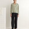 This shirt is inspired by an embroidered tablecloth from the early 20th century. We reproduced the tonal black embroidery along the placket and front pockets. The collarless silhouette is taken from a midcentury workwear style, likely something meant to be worn as a shop jacket over a collared shirt.
