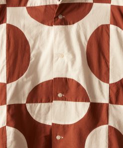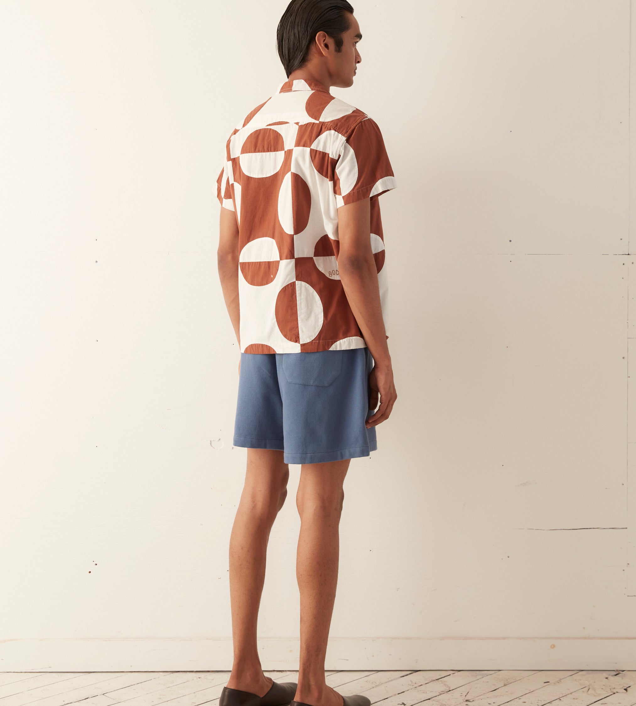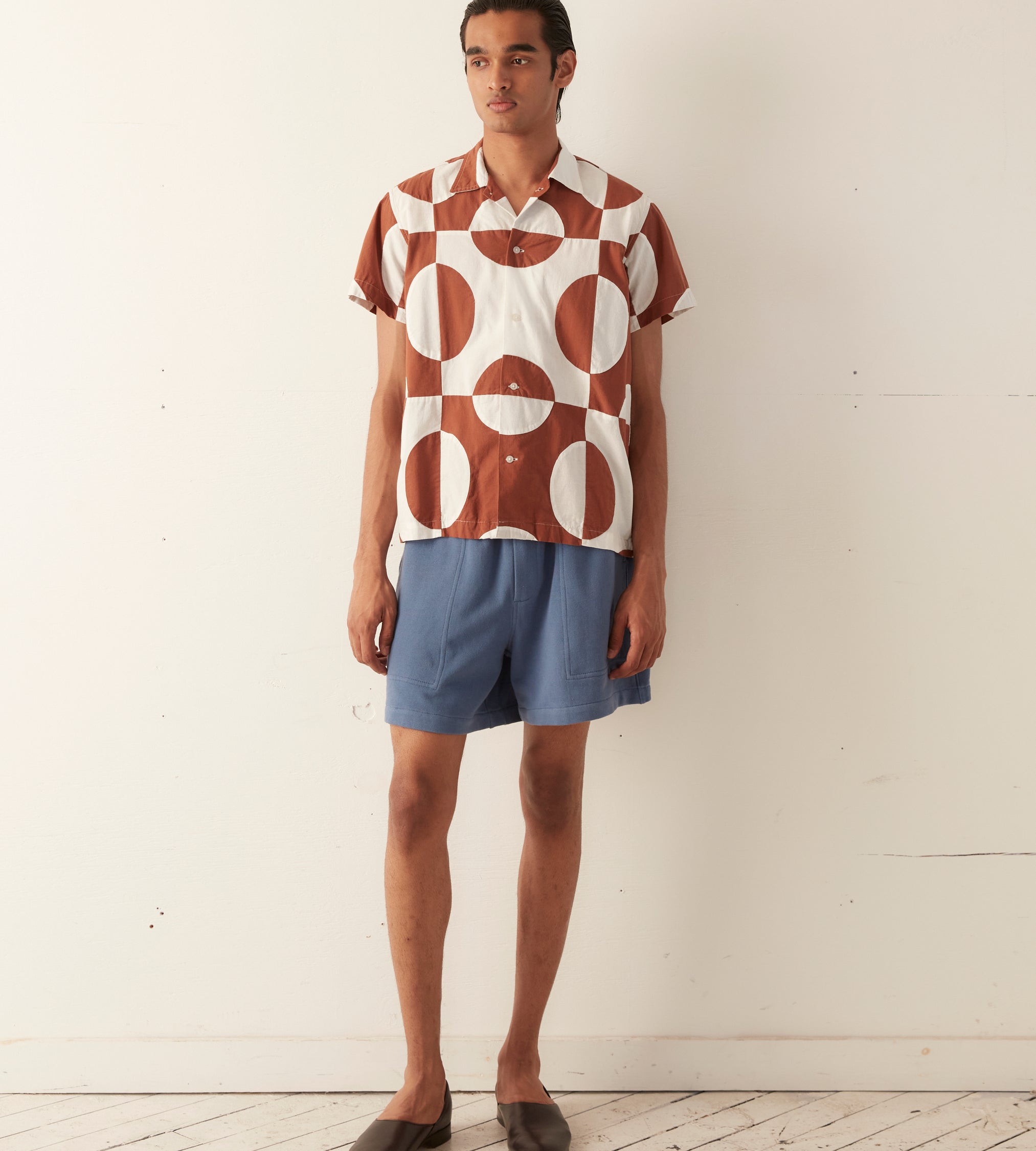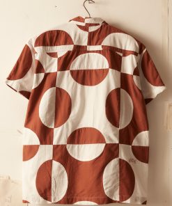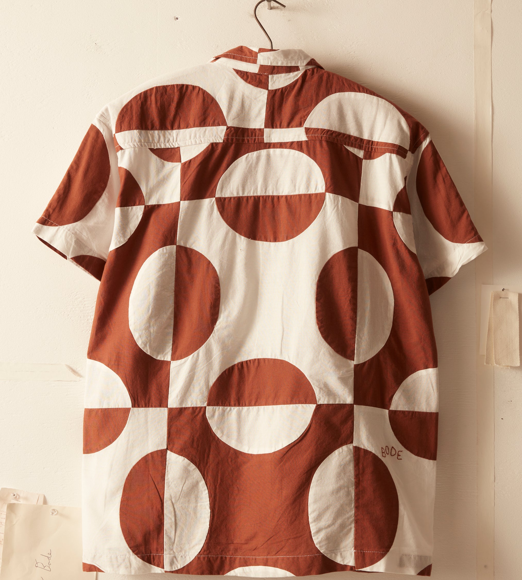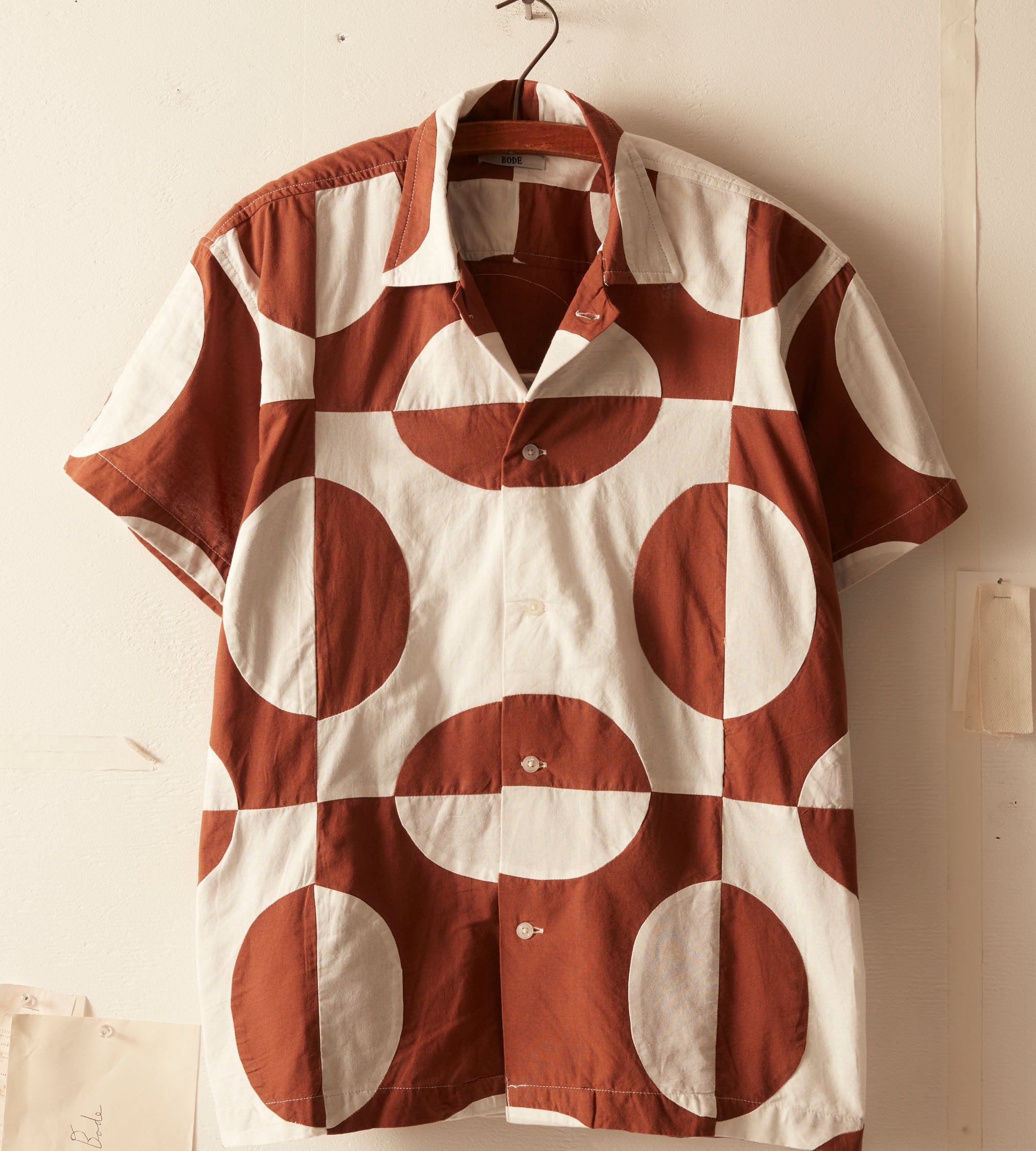 This short-sleeve shirt is inspired by a quilt top from circa 1890s. This style represents a historical reproduction of the “Robbing Peter to Pay Paul” quilt block, which rose to popularity in the mid-19th century.