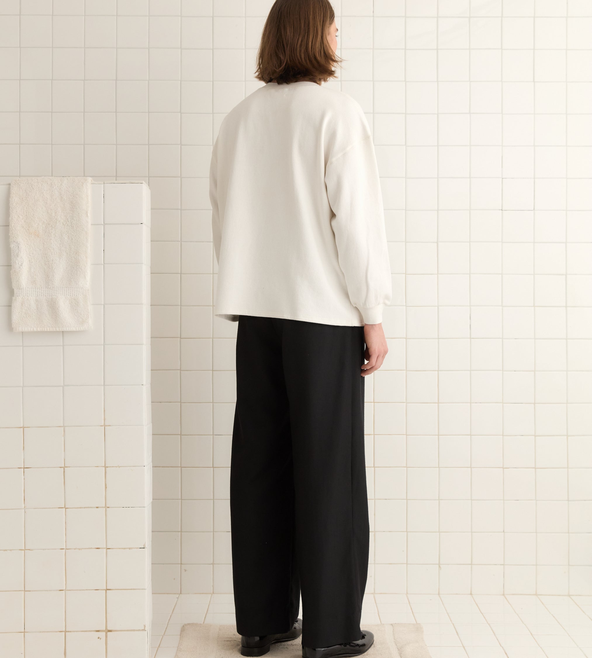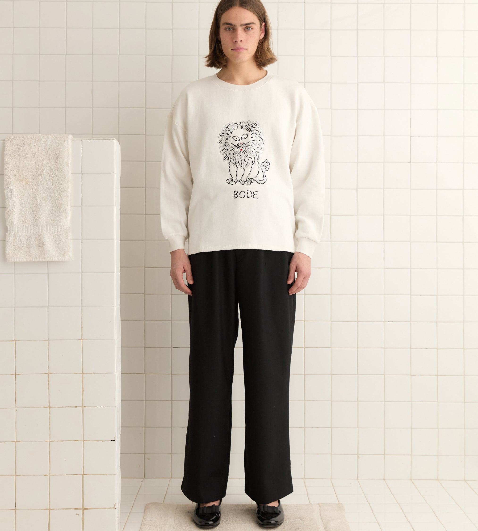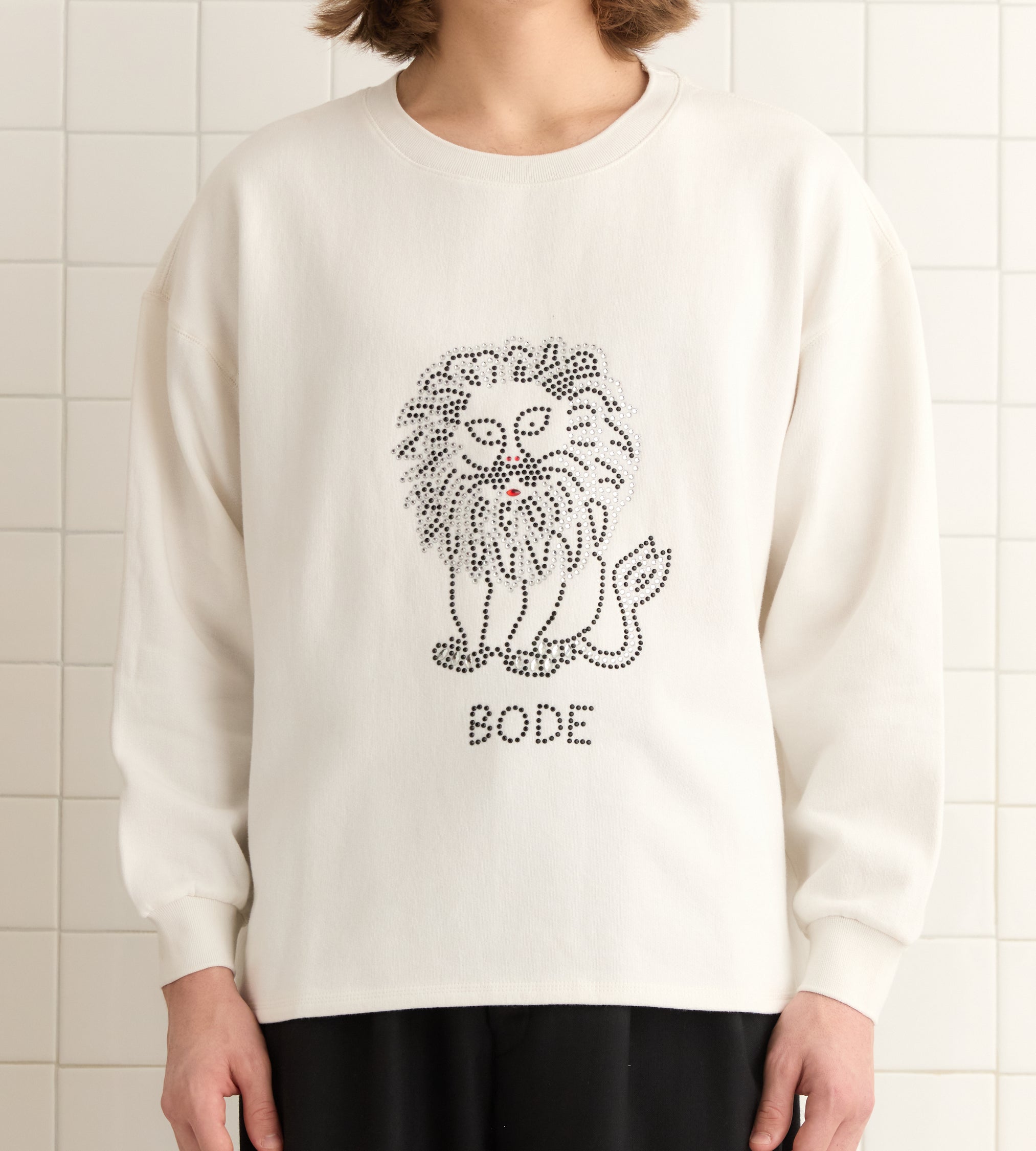 This crewneck is inspired by a children’s souvenir T-shirt from the 1970s. We reproduced the lion motif in rhinestones.