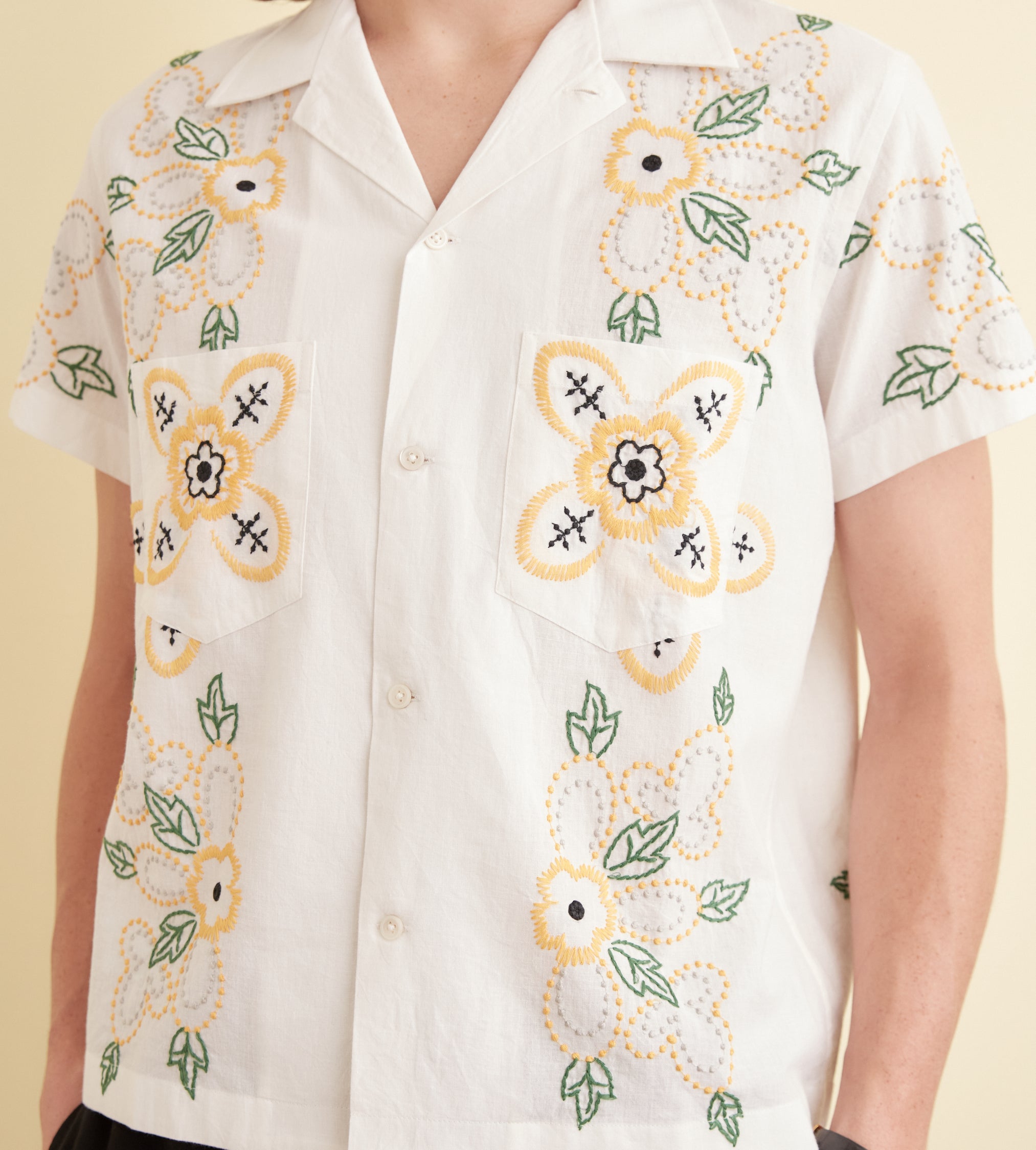 BODE Men’s Ready To Wear Embroidered Buttercup Short Sleeve Shirt | White
