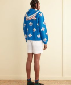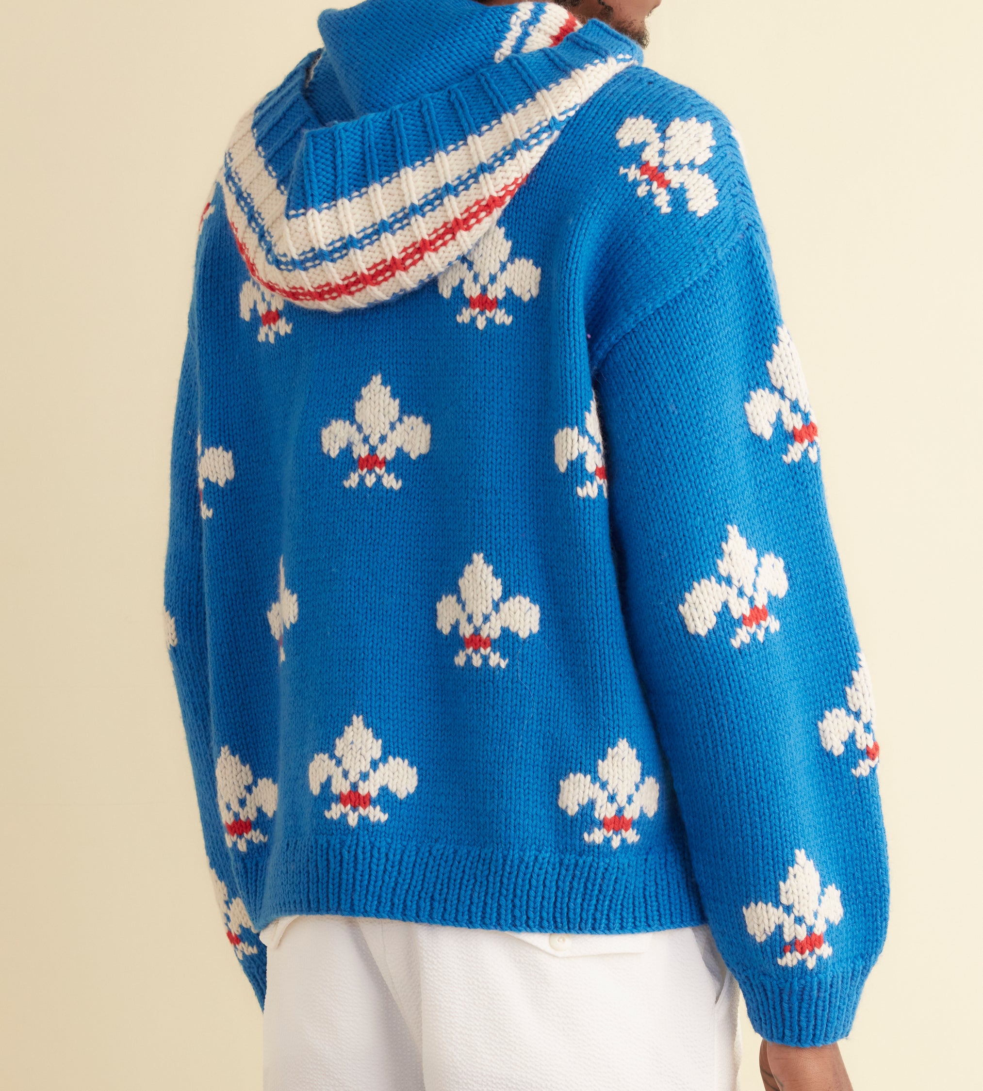 This knit is inspired by a hooded sweater from the 1970s. The original sweater likely came from a DIY kit, which were widespread throughout the 1960s and 1970s, especially for crochet and knitting patterns. We replicated its electric blue fleur-de-lis pattern on this hand-knit jacquard hoodie.