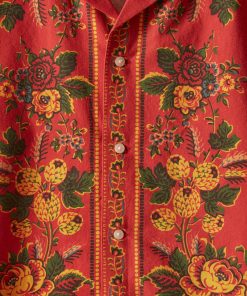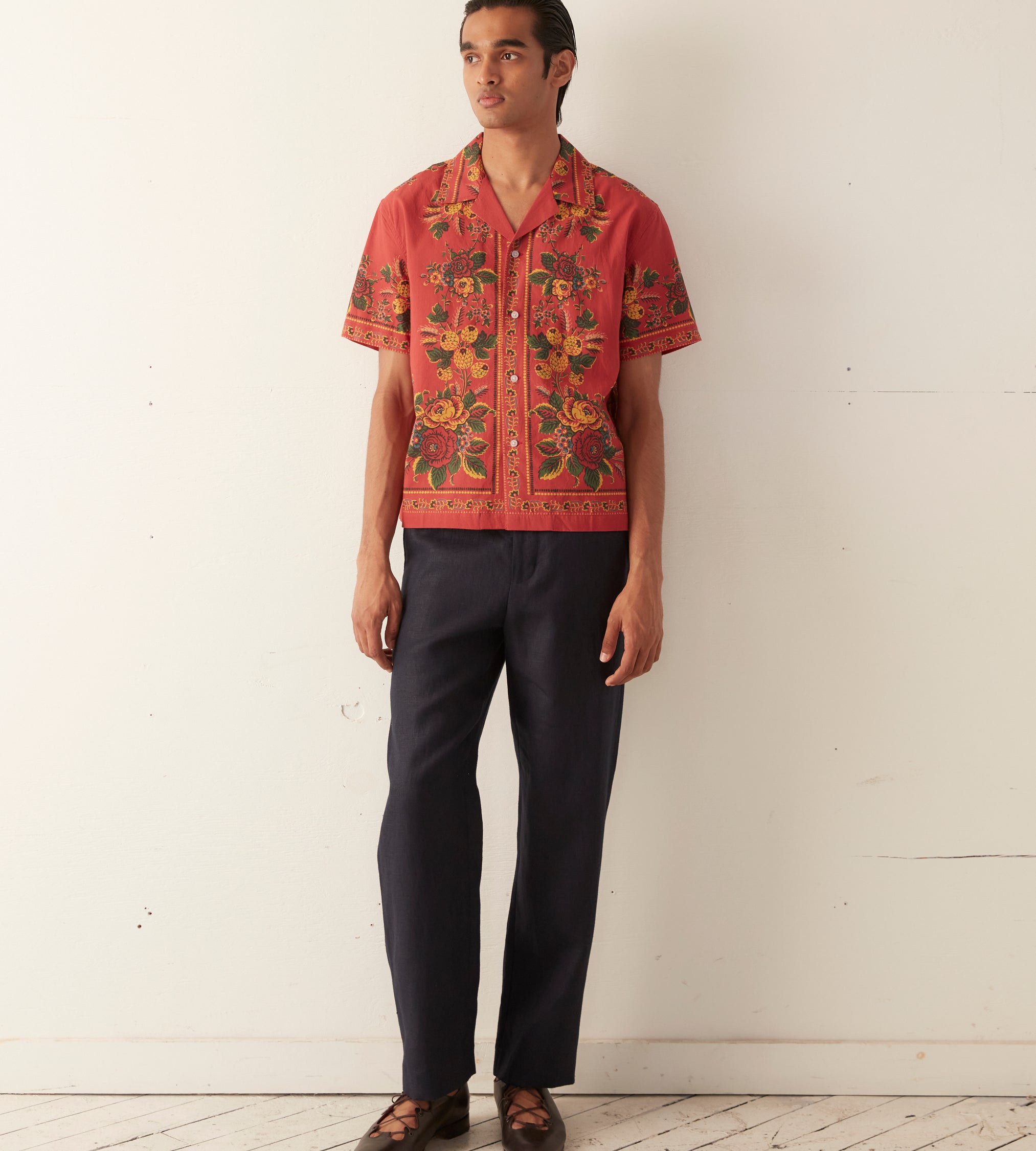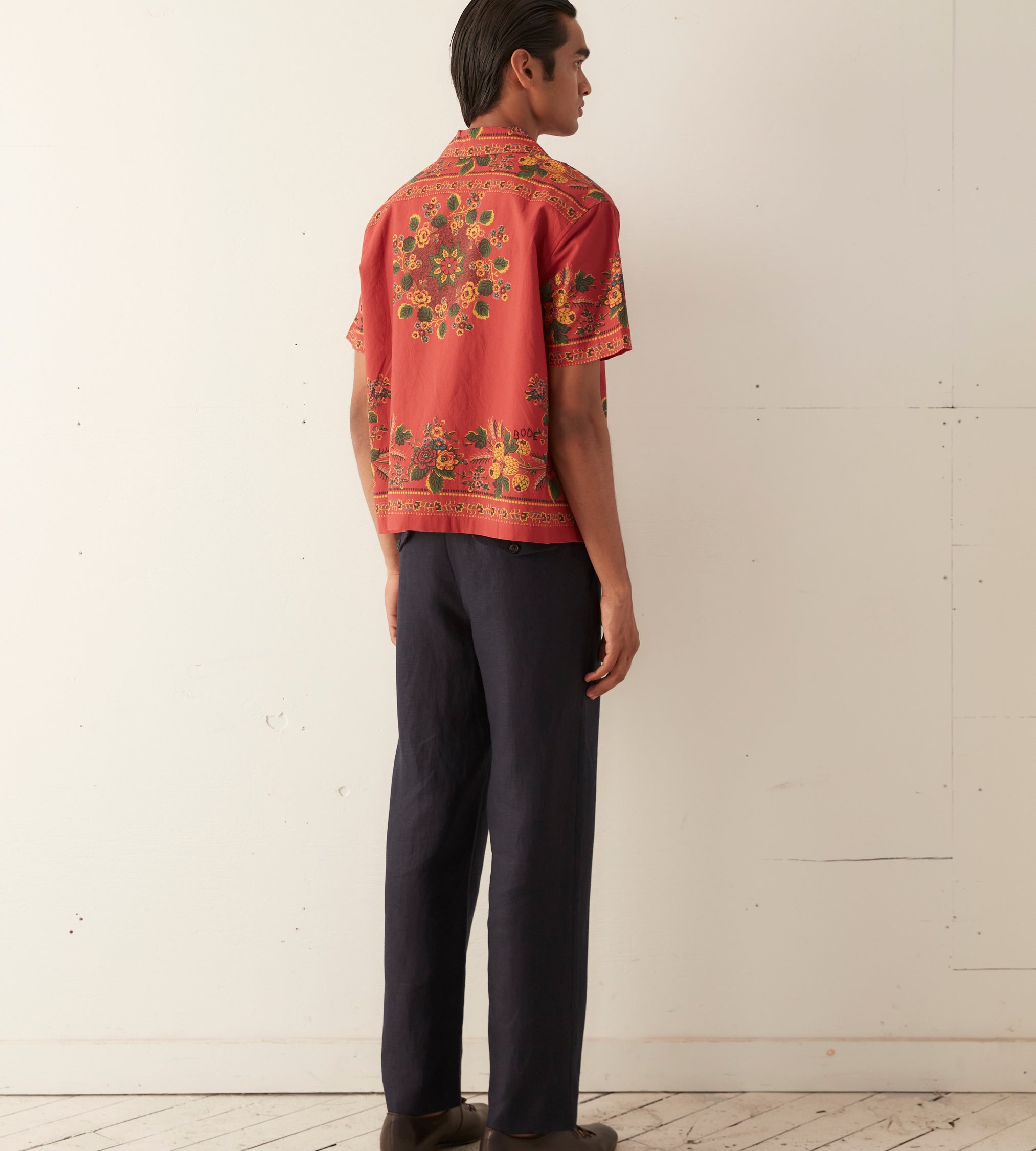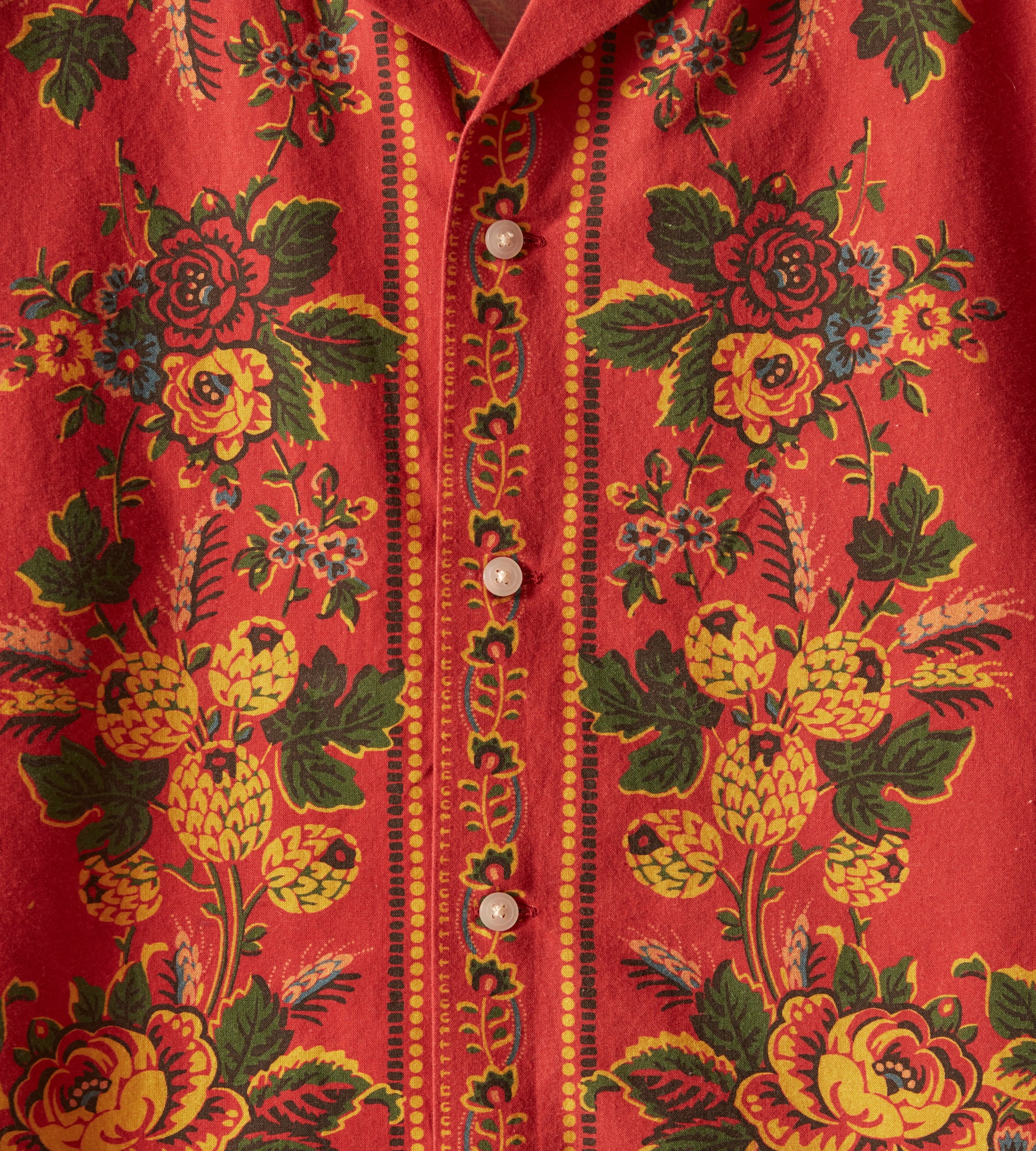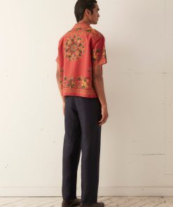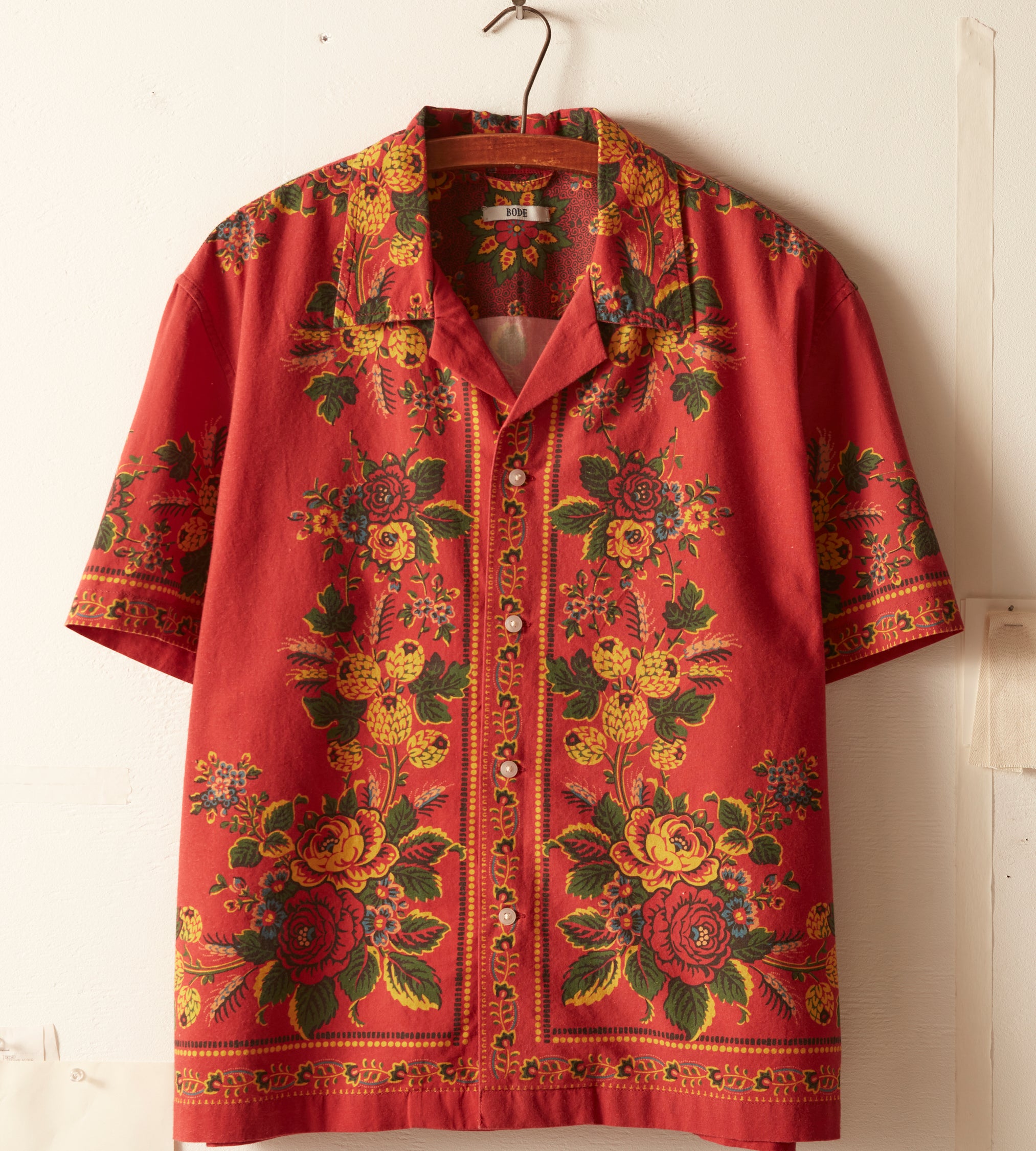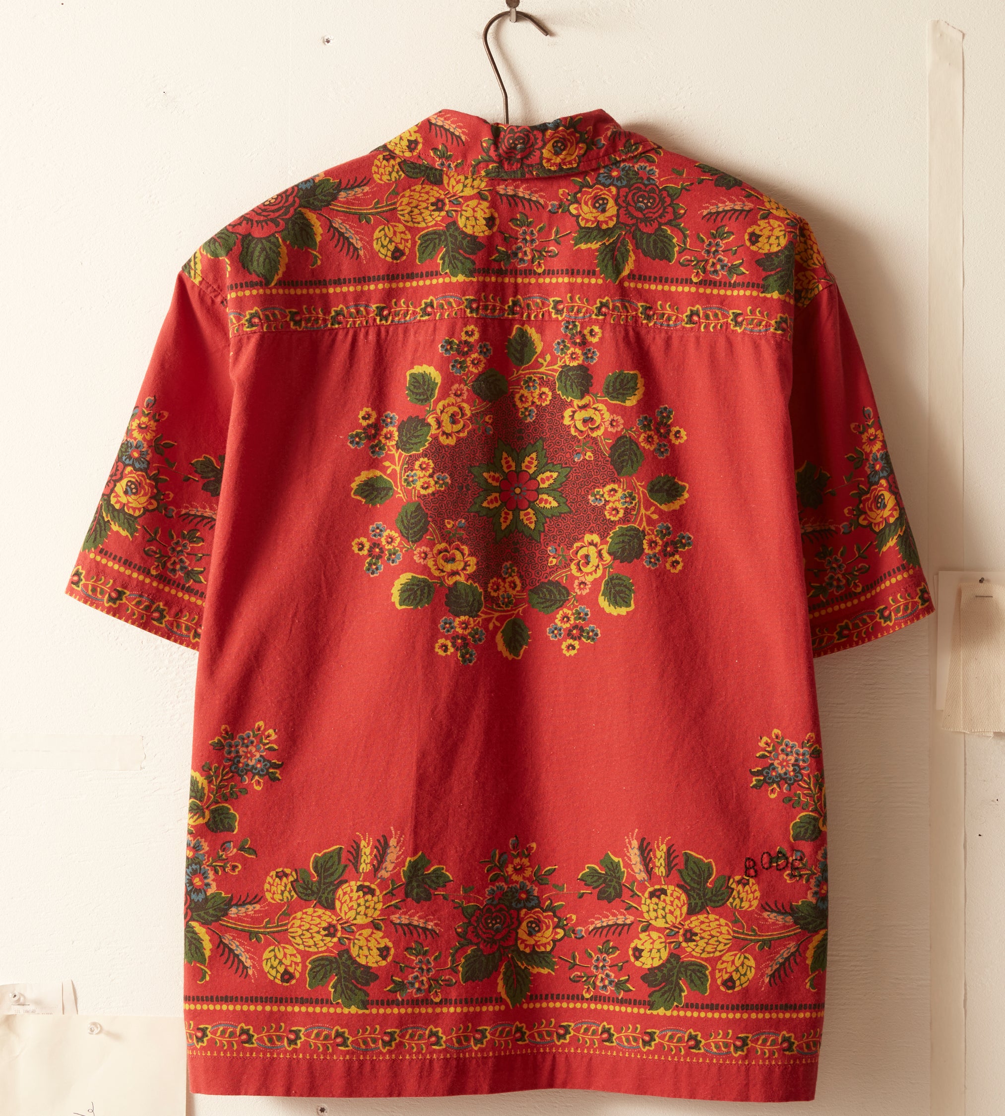 This short sleeve shirt is inspired by a late 19th-century bandana. The shirt features a faithful reproduction of the original intricate bandana motif, enlarged for scale.