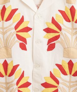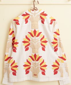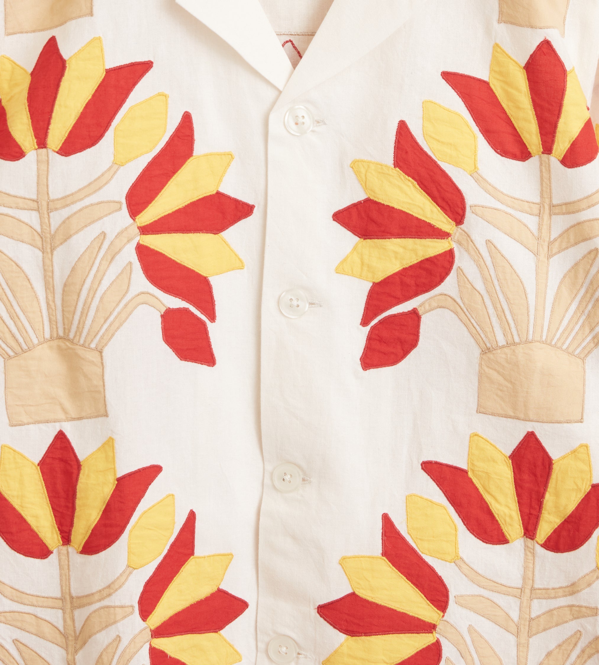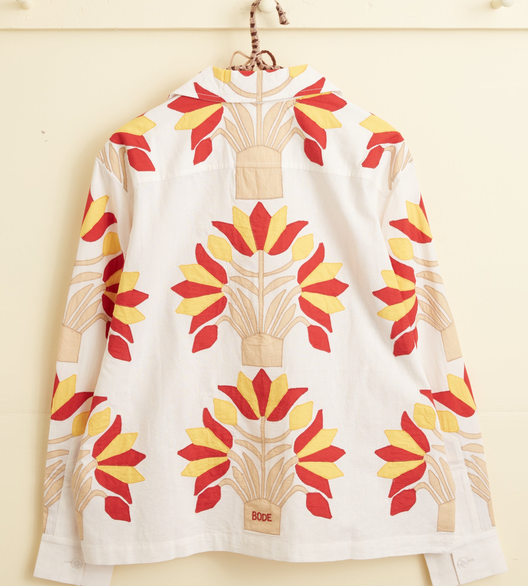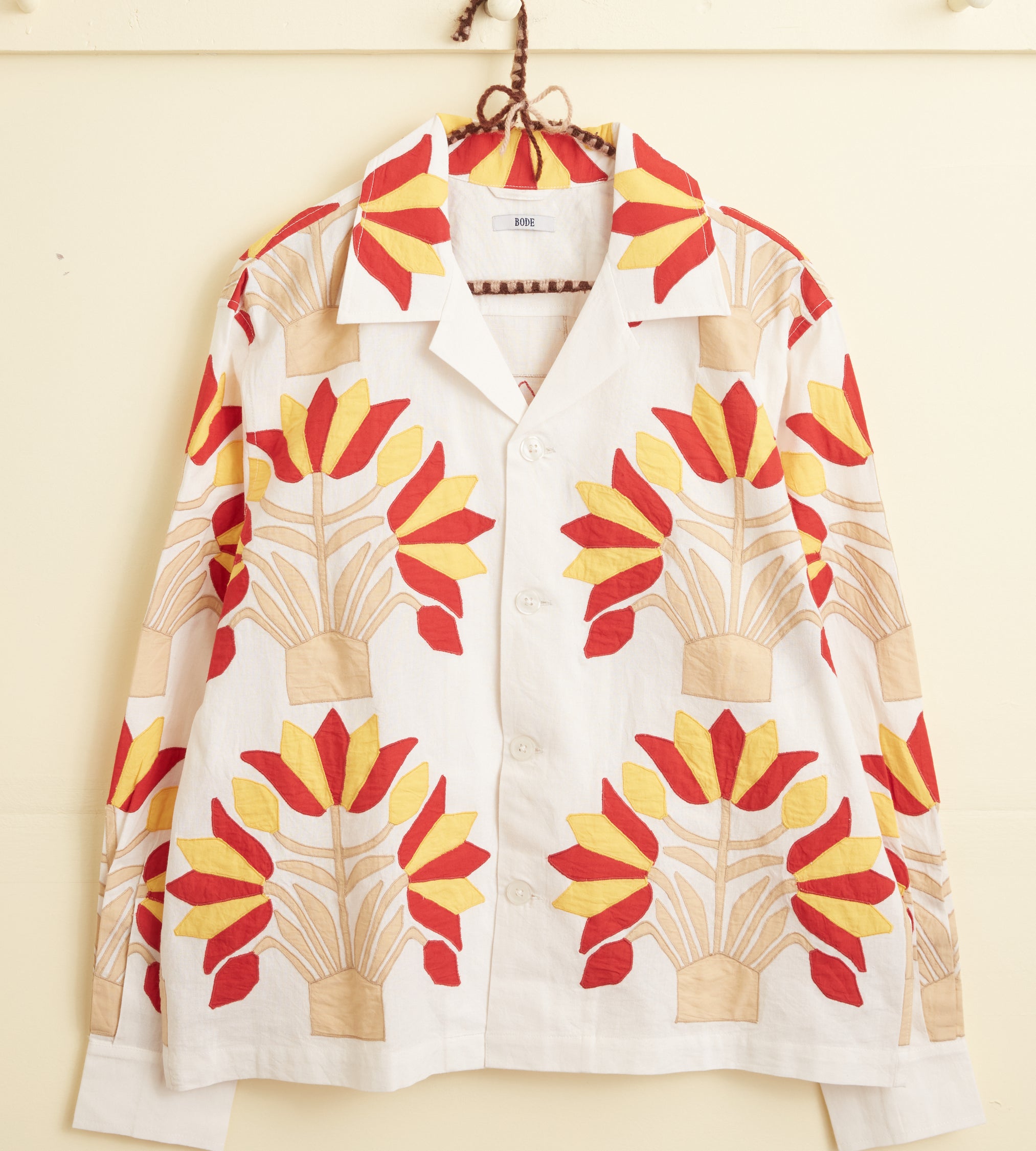 This long sleeve shirt is inspired by an unfinished quilt top from the 1900s. The shirt features a faithful reproduction of an unfinished appliqué quilt top of turkey red and yellow bunches of flowers.