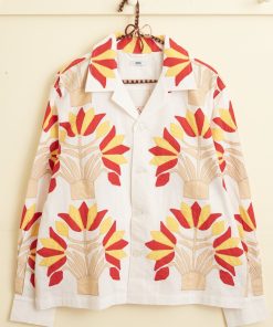 This long sleeve shirt is inspired by an unfinished quilt top from the 1900s. The shirt features a faithful reproduction of an unfinished appliqué quilt top of turkey red and yellow bunches of flowers.
