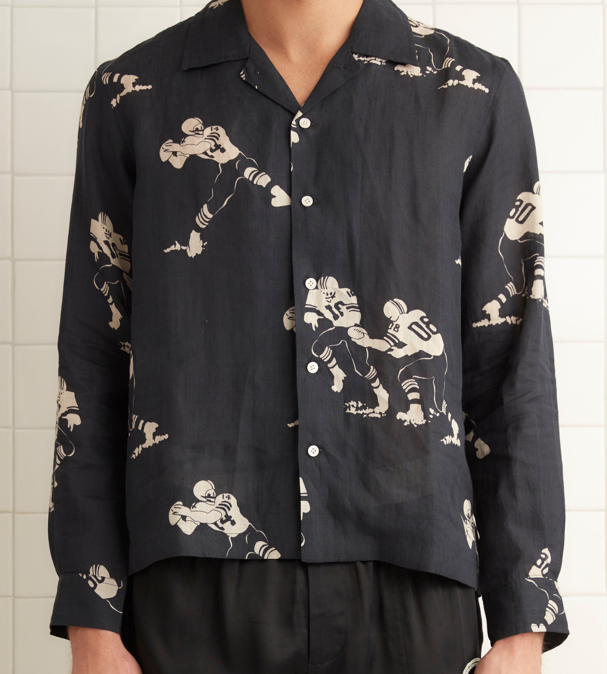 This shirt is inspired by a scrap of fabric from the 1930s. We recreated the pattern with images of football players for this style.