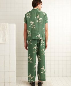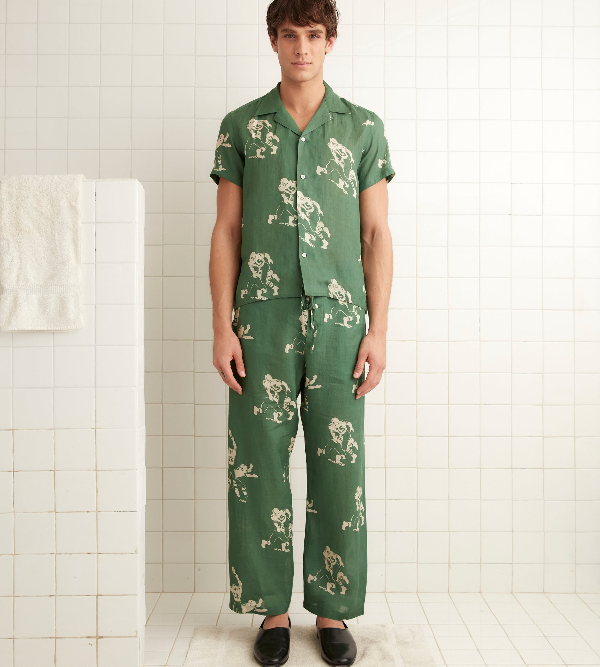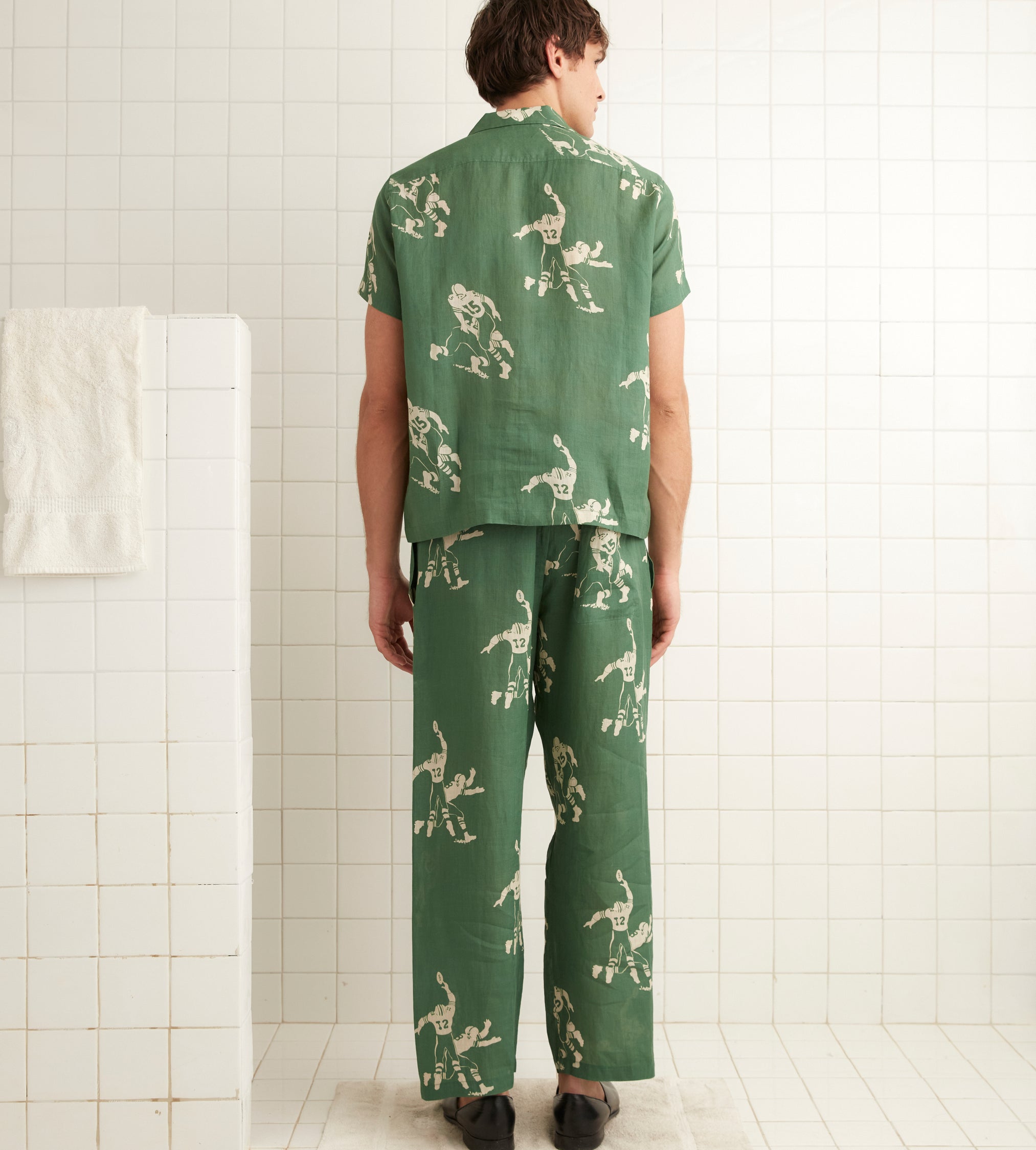 These pajama pants are inspired by a scrap of fabric from the 1930s. We recreated the pattern with images of football players for this style, which is cut according to a classic pajama pant silhouette.