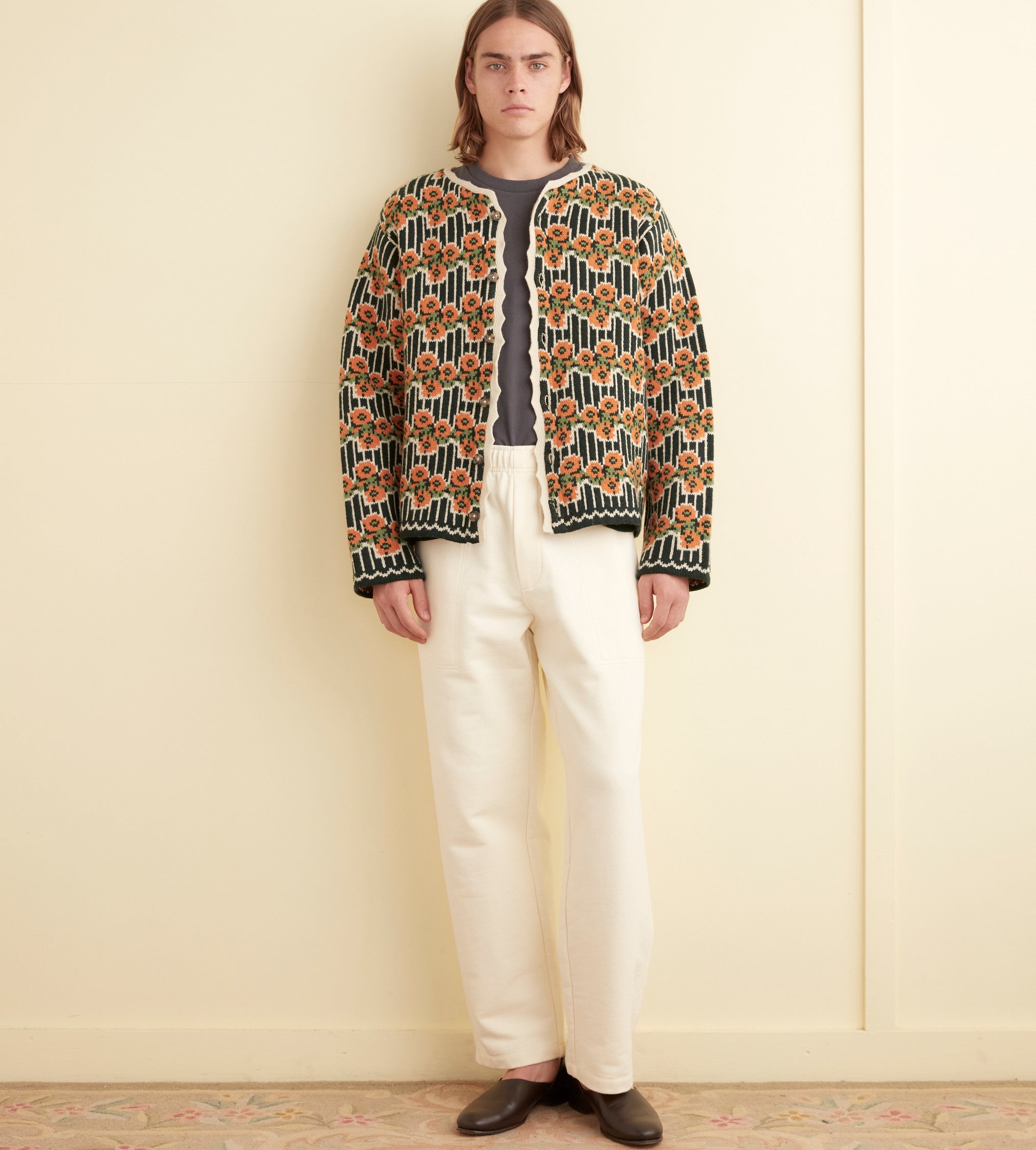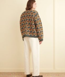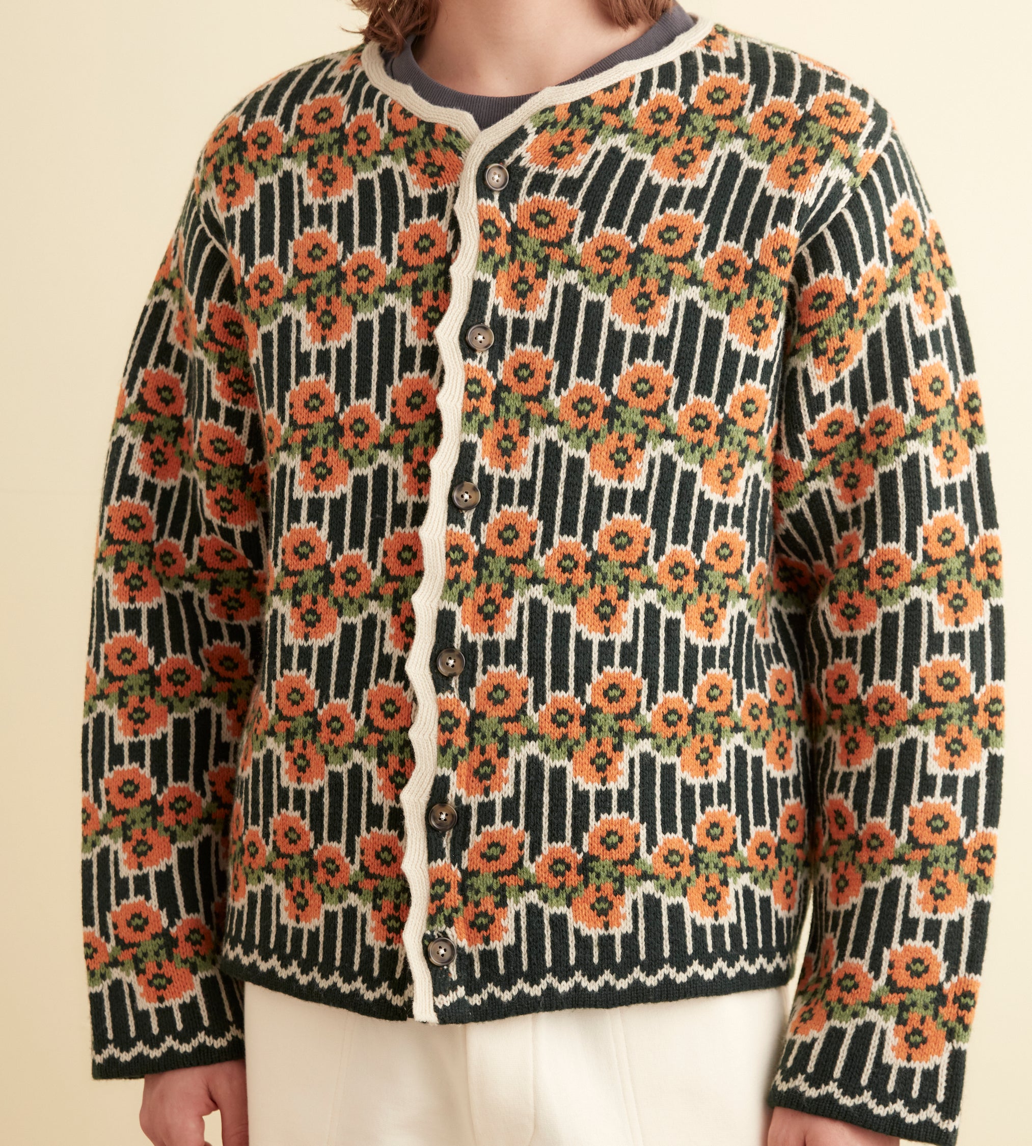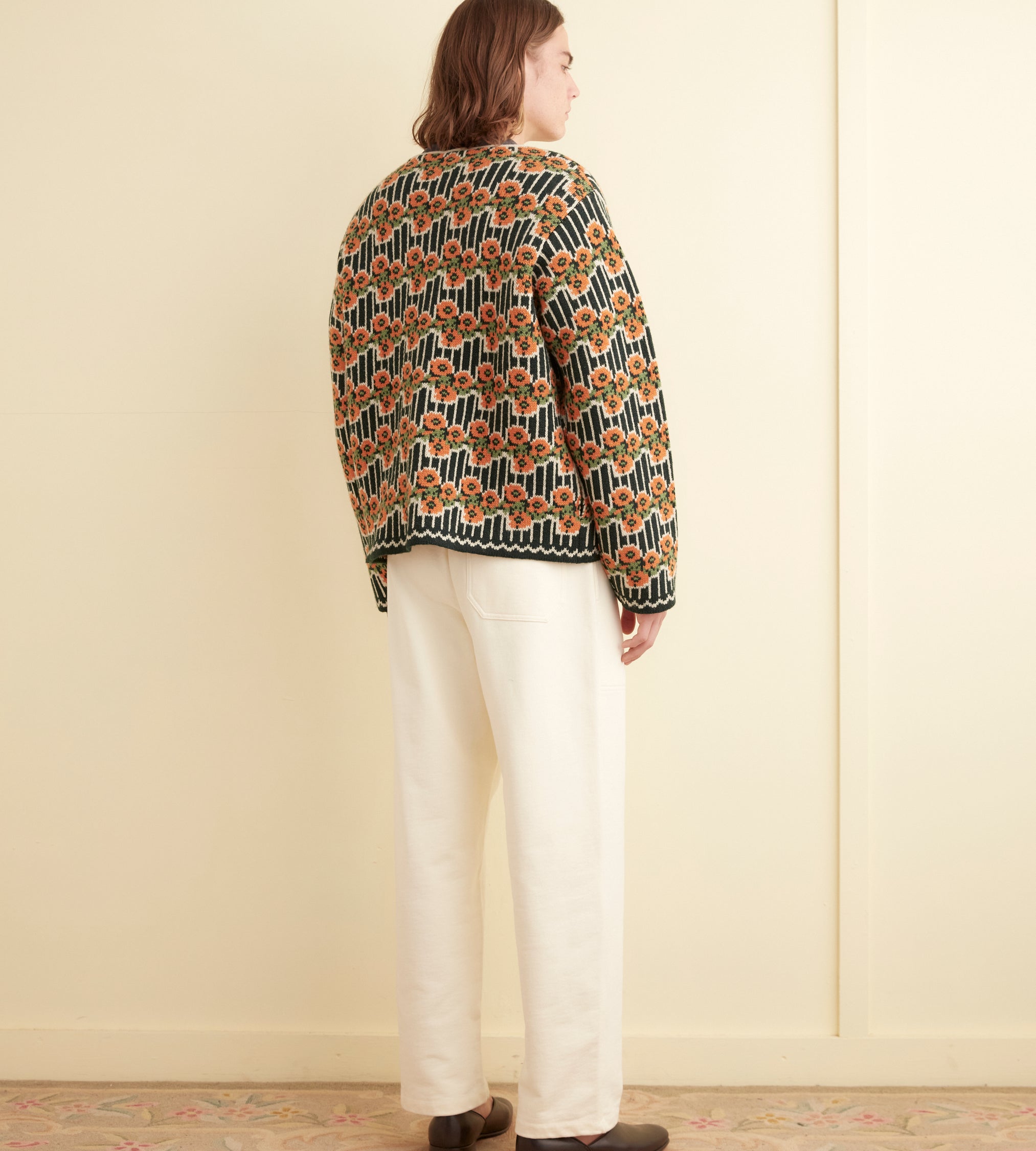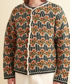 This cardigan is inspired by a sweater from the midcentury. We reproduced the orange and green floral stripes for this jacquard knit, made in a soft merino wool.