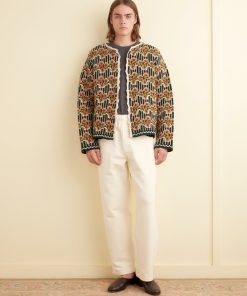 This cardigan is inspired by a sweater from the midcentury. We reproduced the orange and green floral stripes for this jacquard knit, made in a soft merino wool.