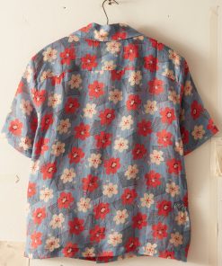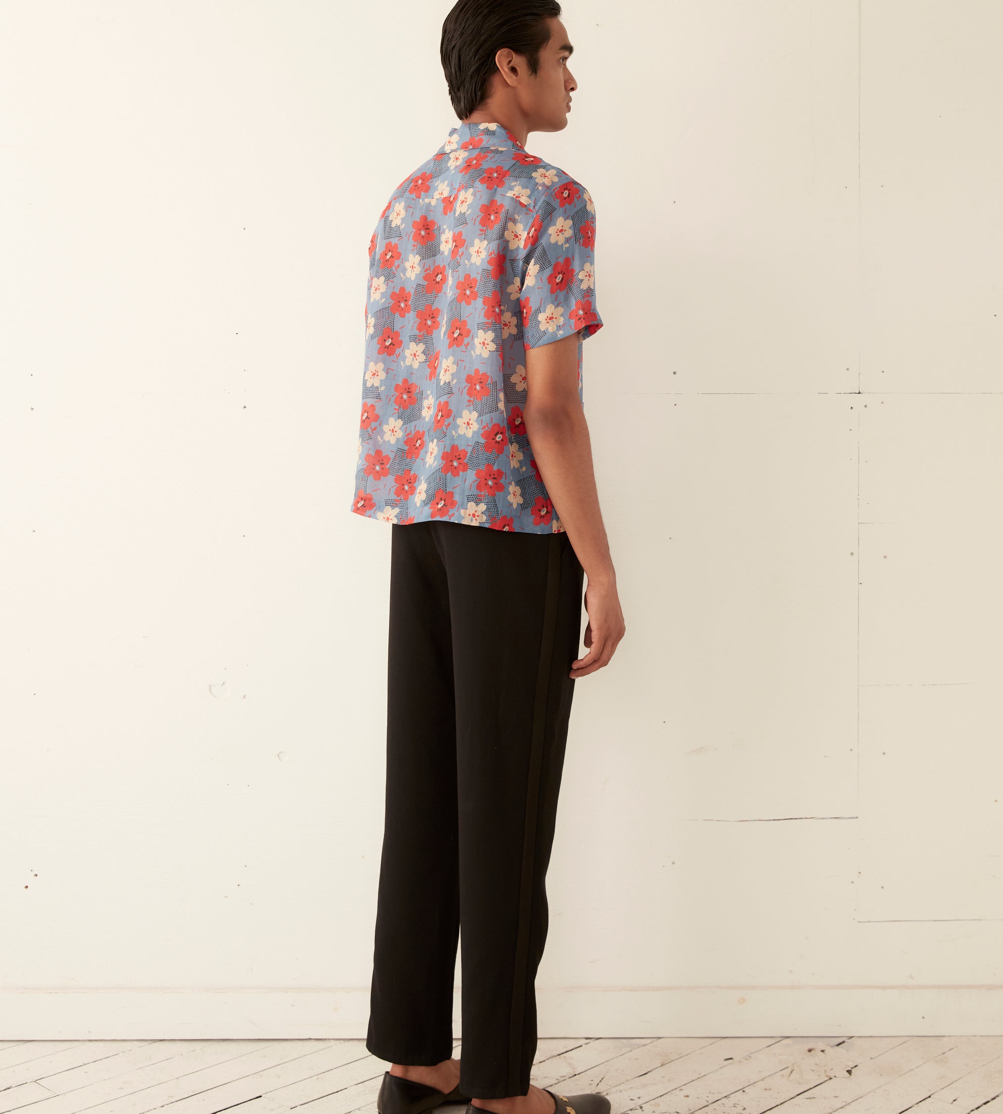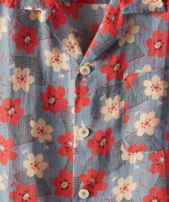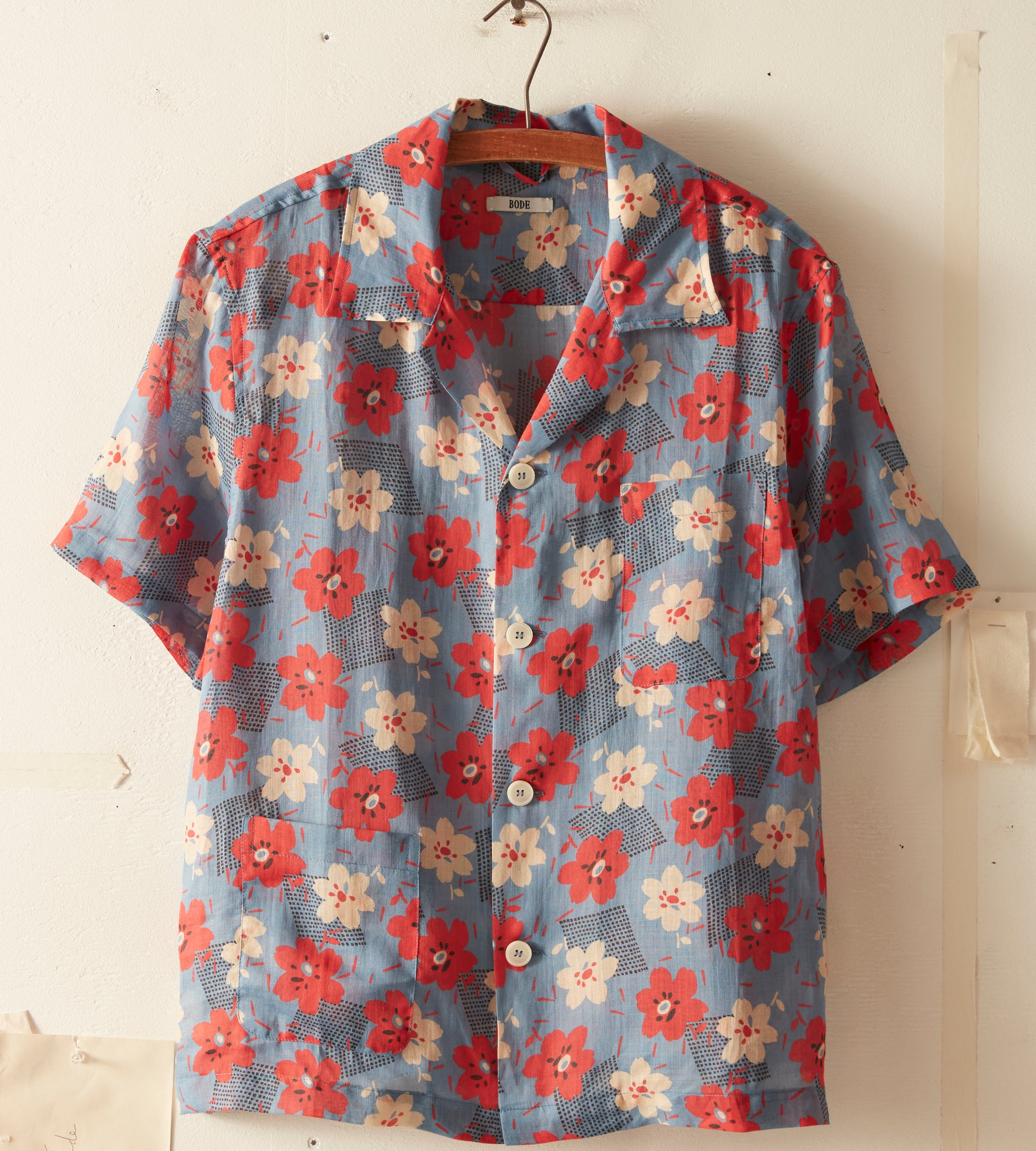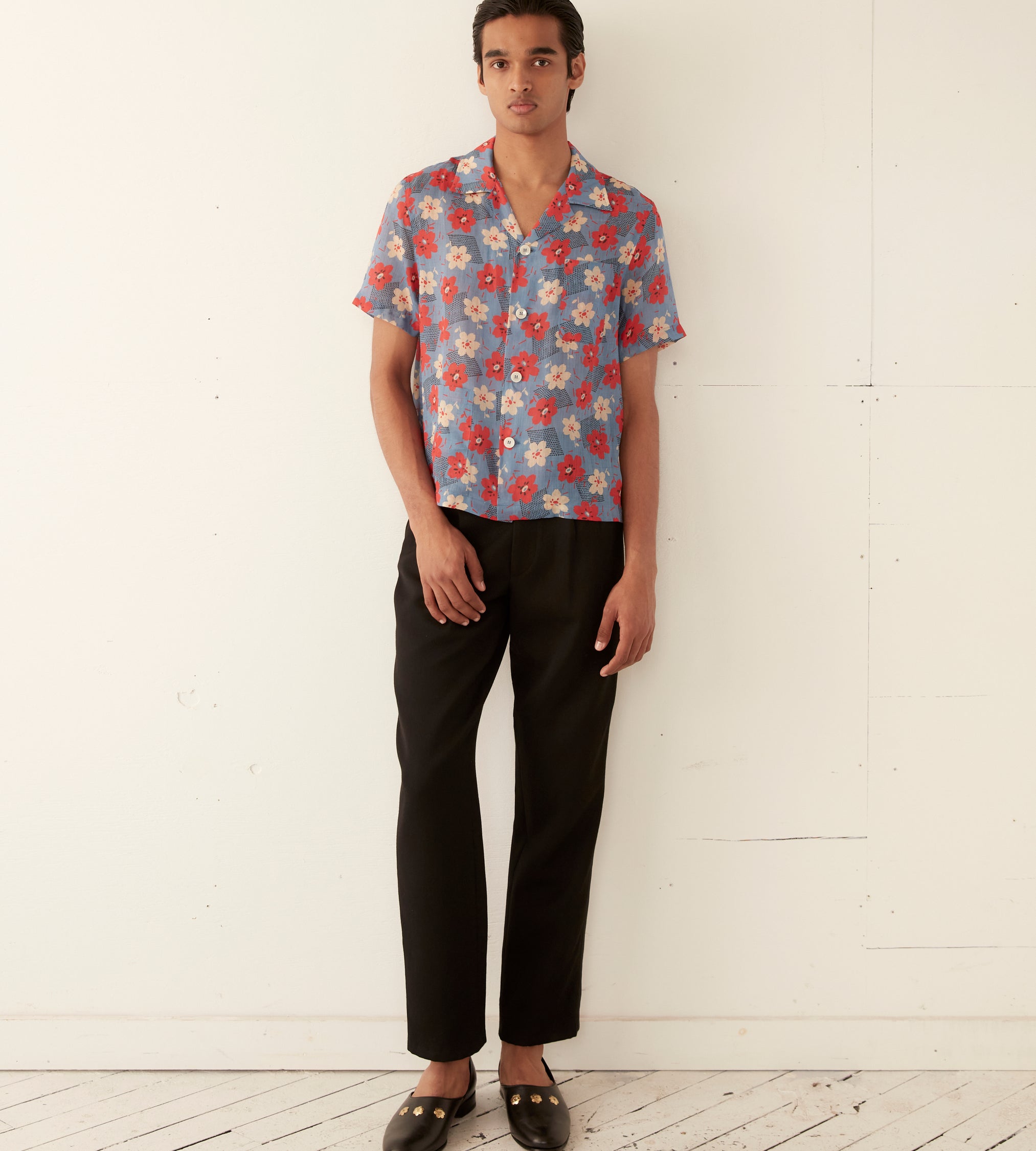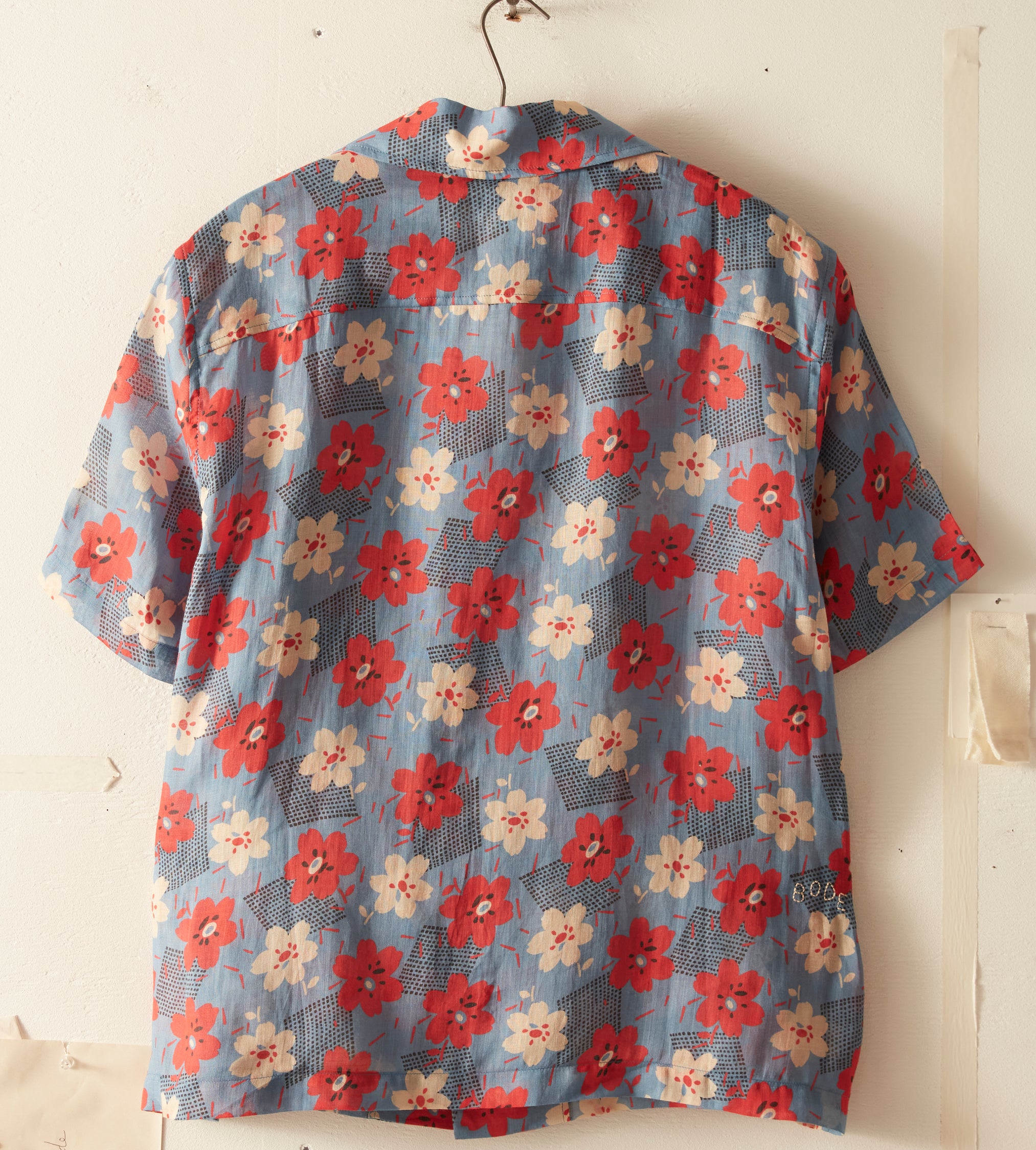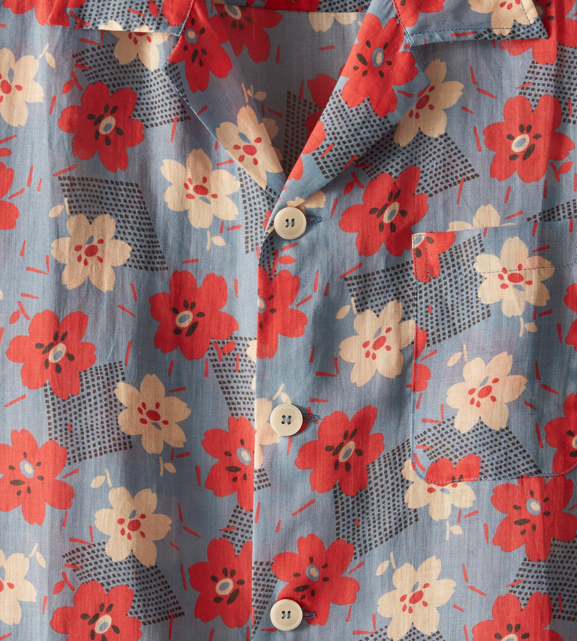 This shirt is inspired by a fabric scrap from the 1940s. We recreated the original fabric for this shirt: a cornflower blue ground dotted with red and white poppies.
